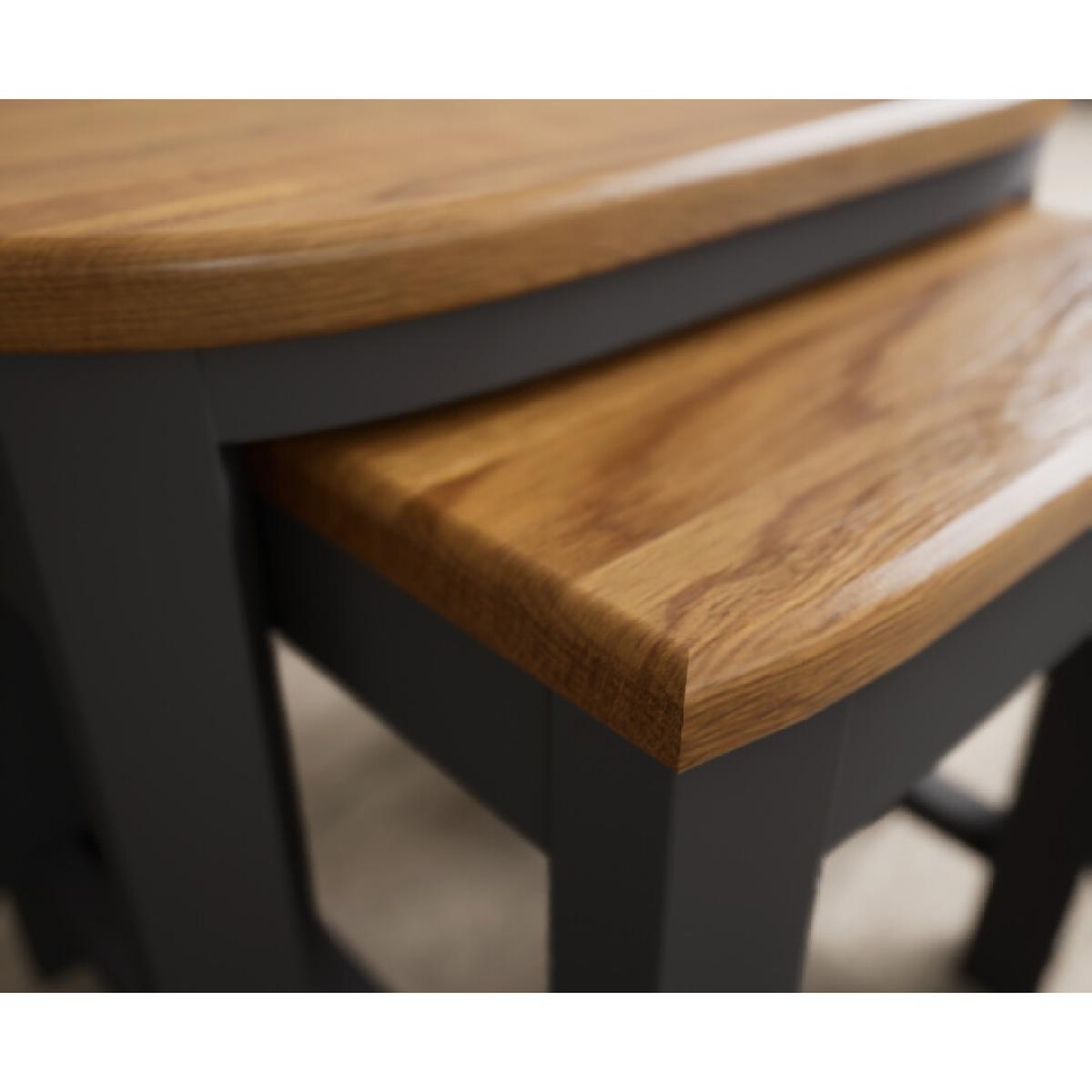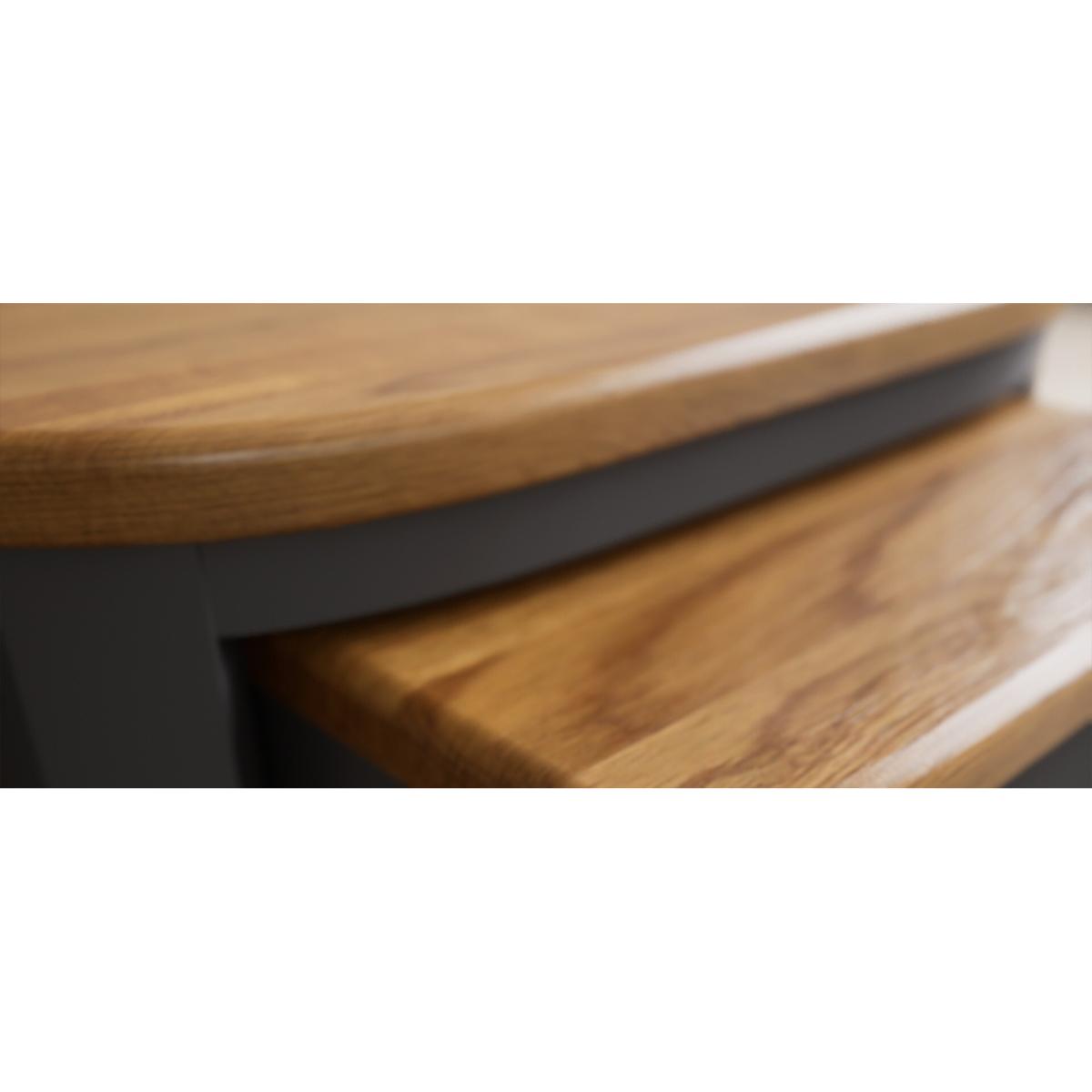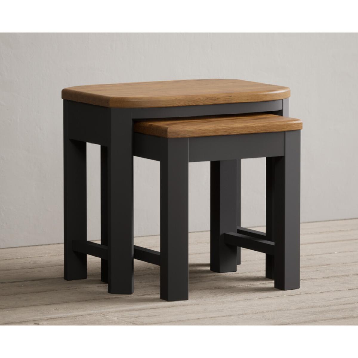 The Bradwell Oak and Charcoal Grey Painted Nest of Tables is a set of two versatile tables with charcoal-grey painted solid hardwood frames and solid oak tops.