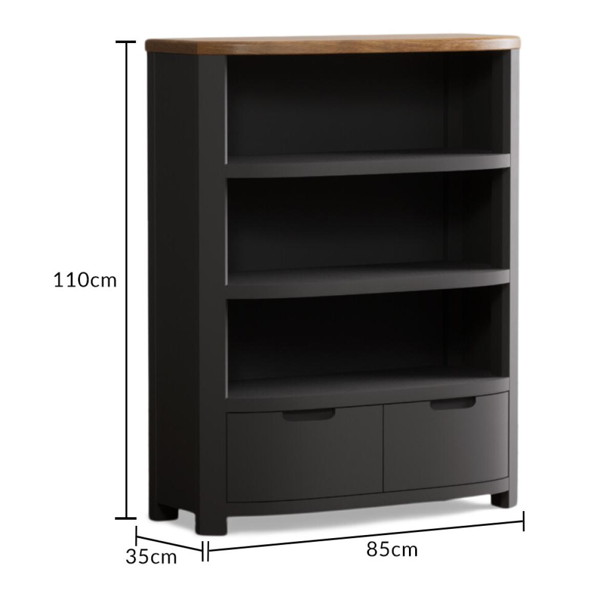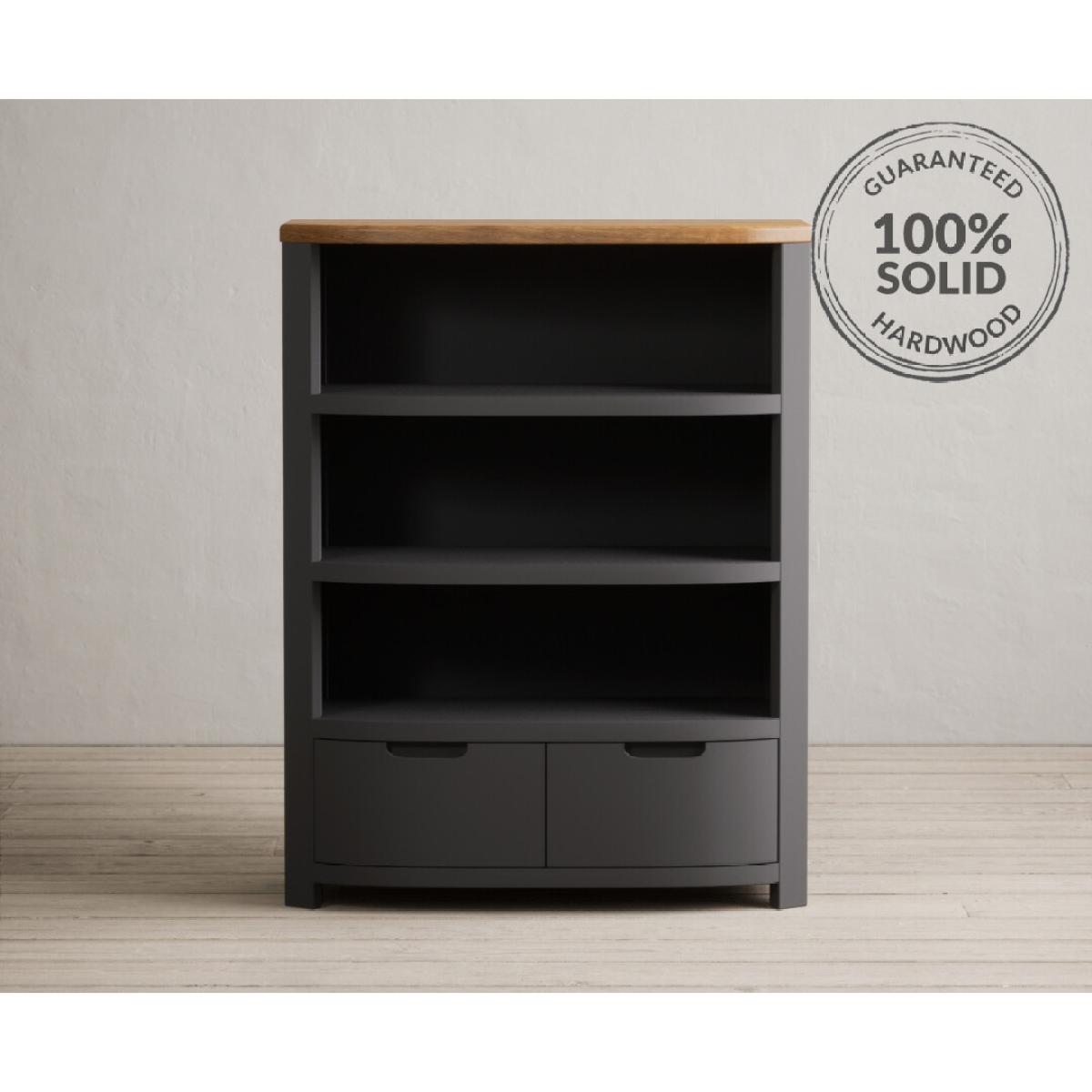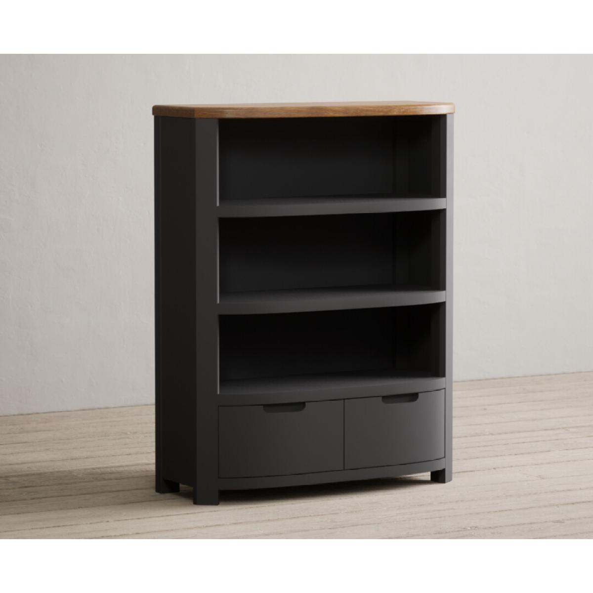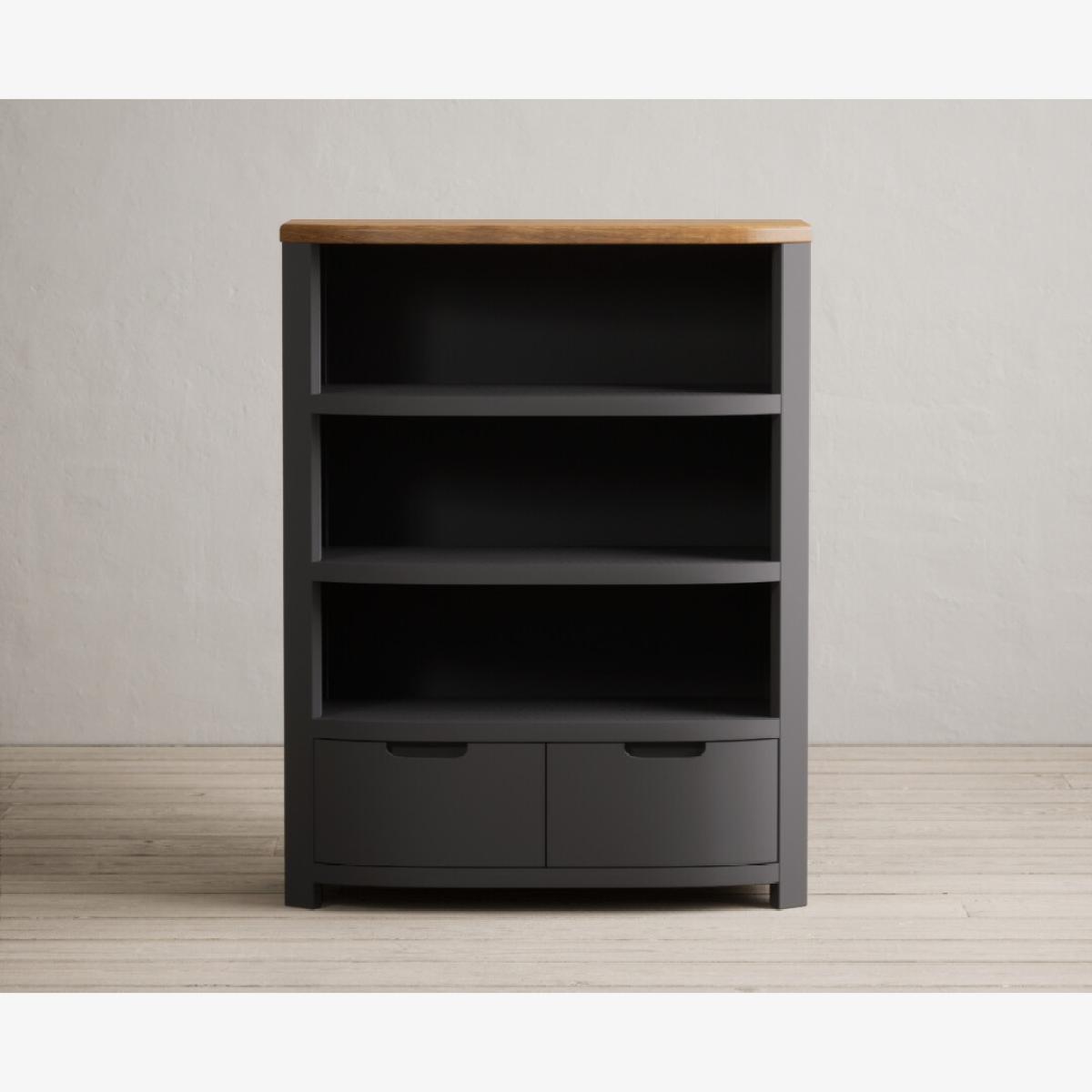 The Bradwell Oak and Charcoal Grey Painted Small Bookcase is crafted from grey painted solid hardwood, with sturdy shelves and a solid oak top.