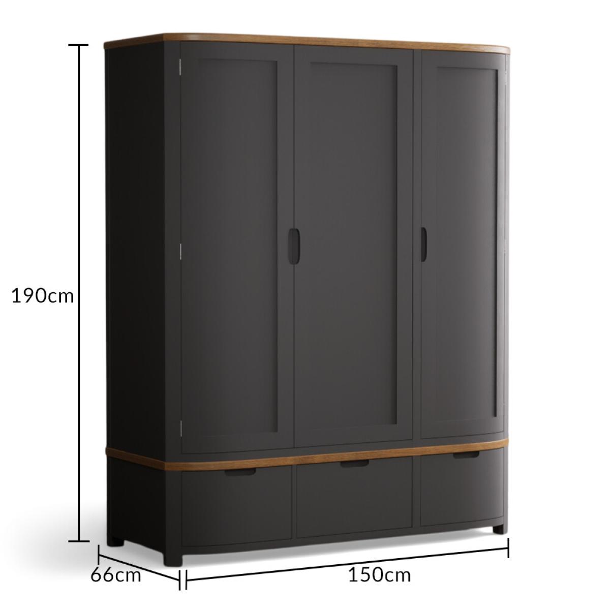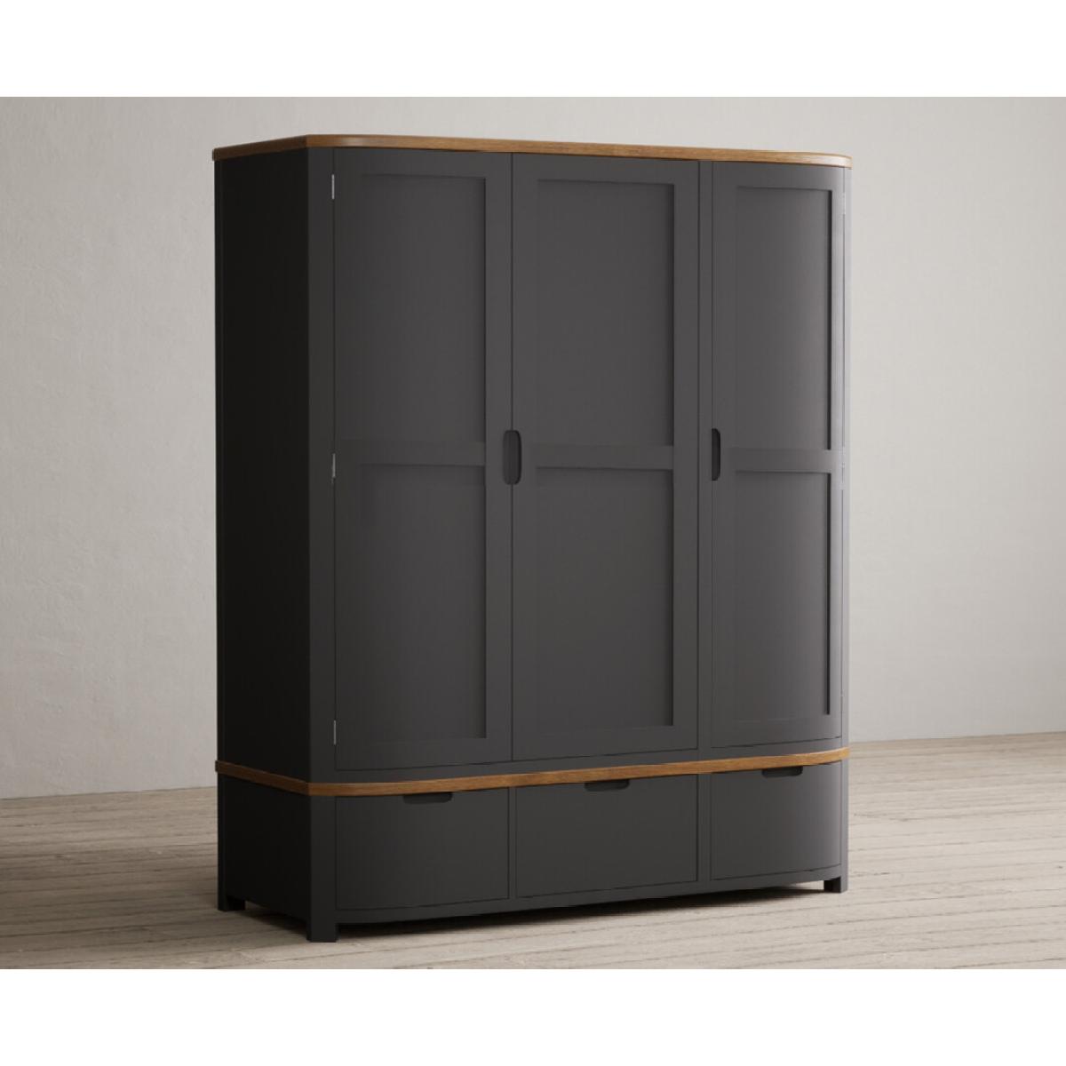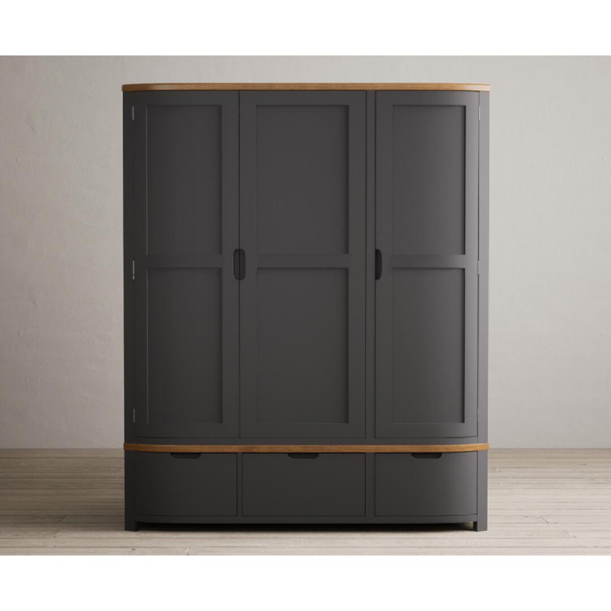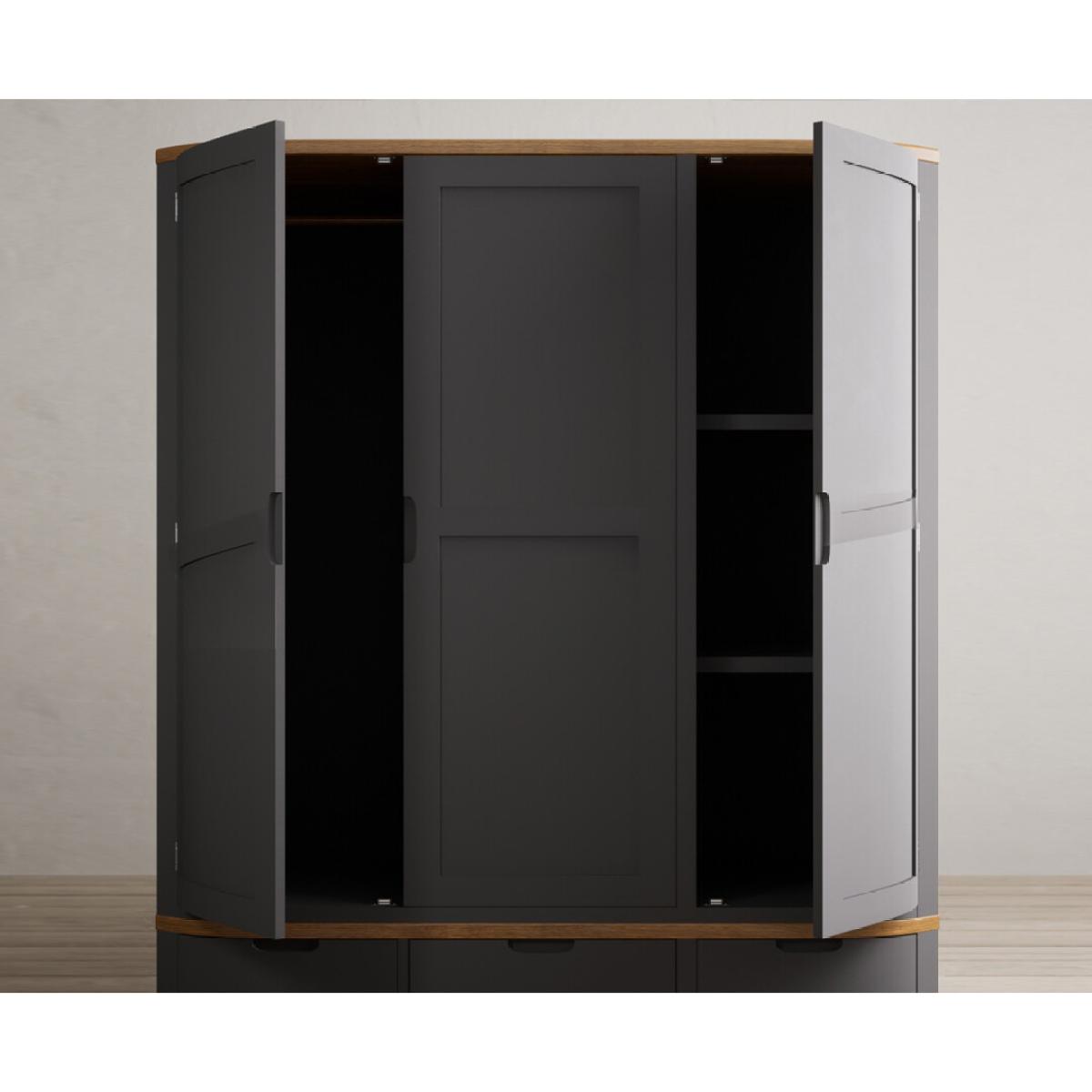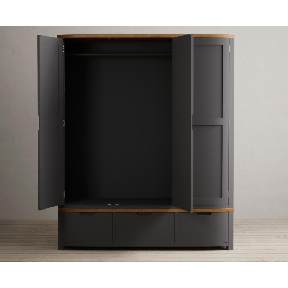 The Bradwell Oak and Charcoal Grey Painted Triple Wardrobe is crafted from solid hardwood with a charcoal grey painted finish and topped with 100% solid oak.