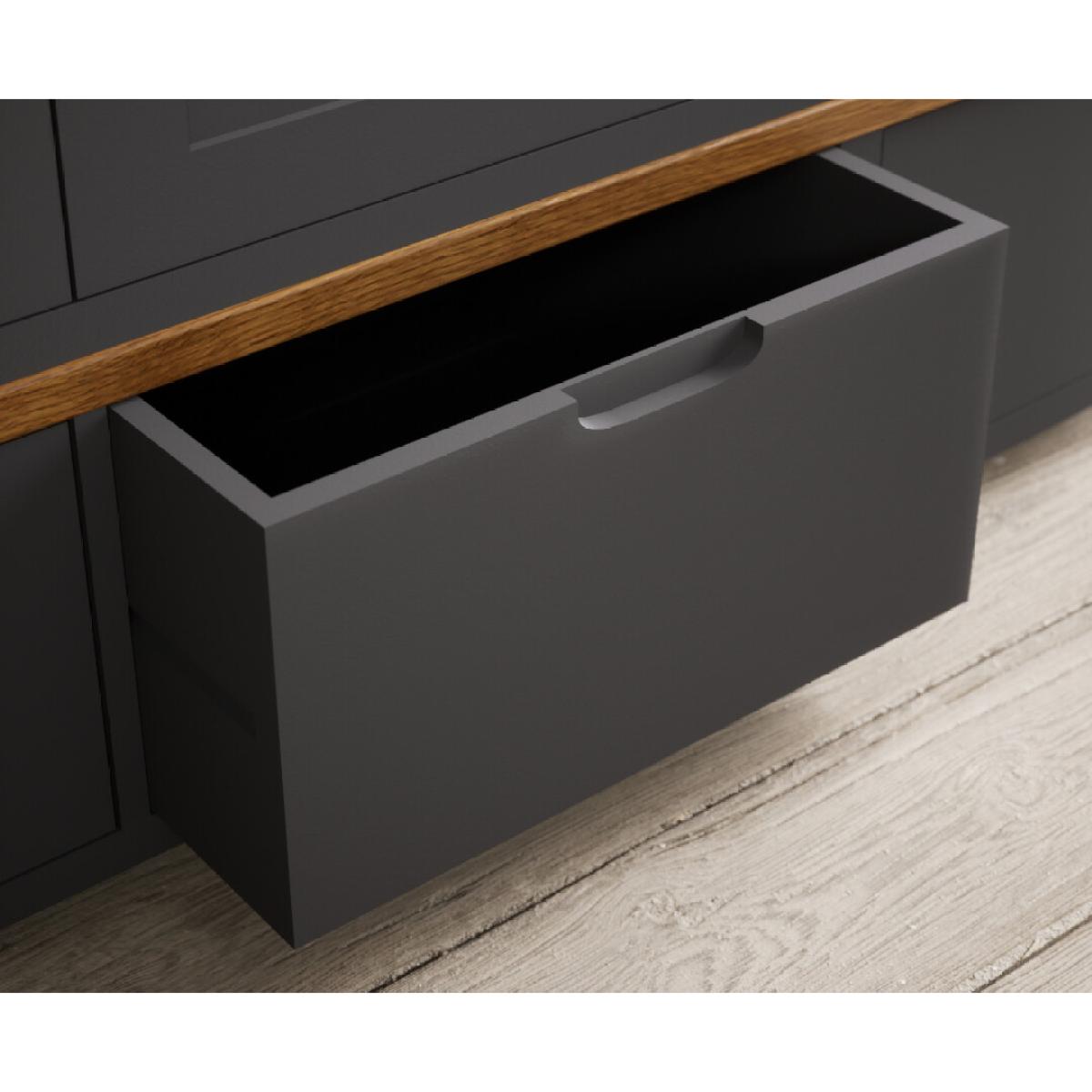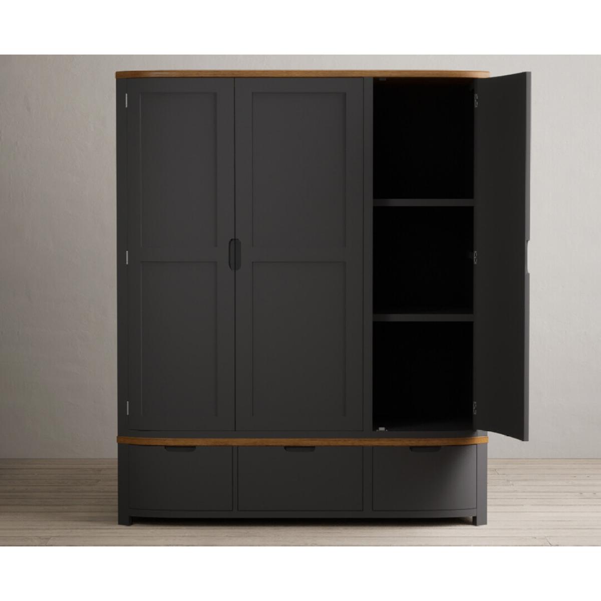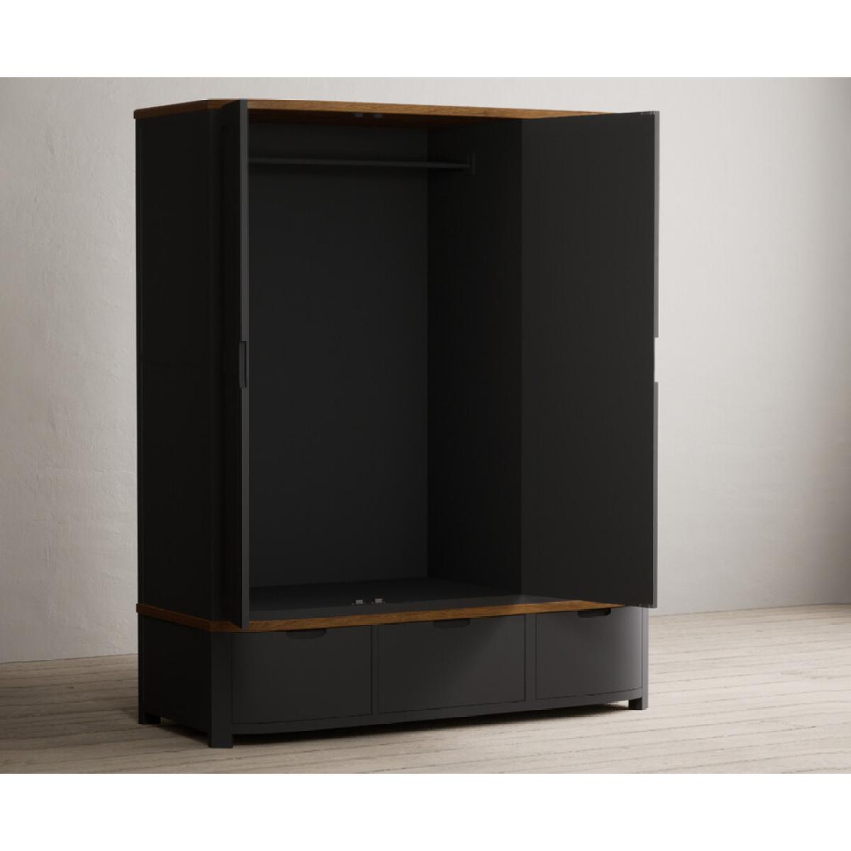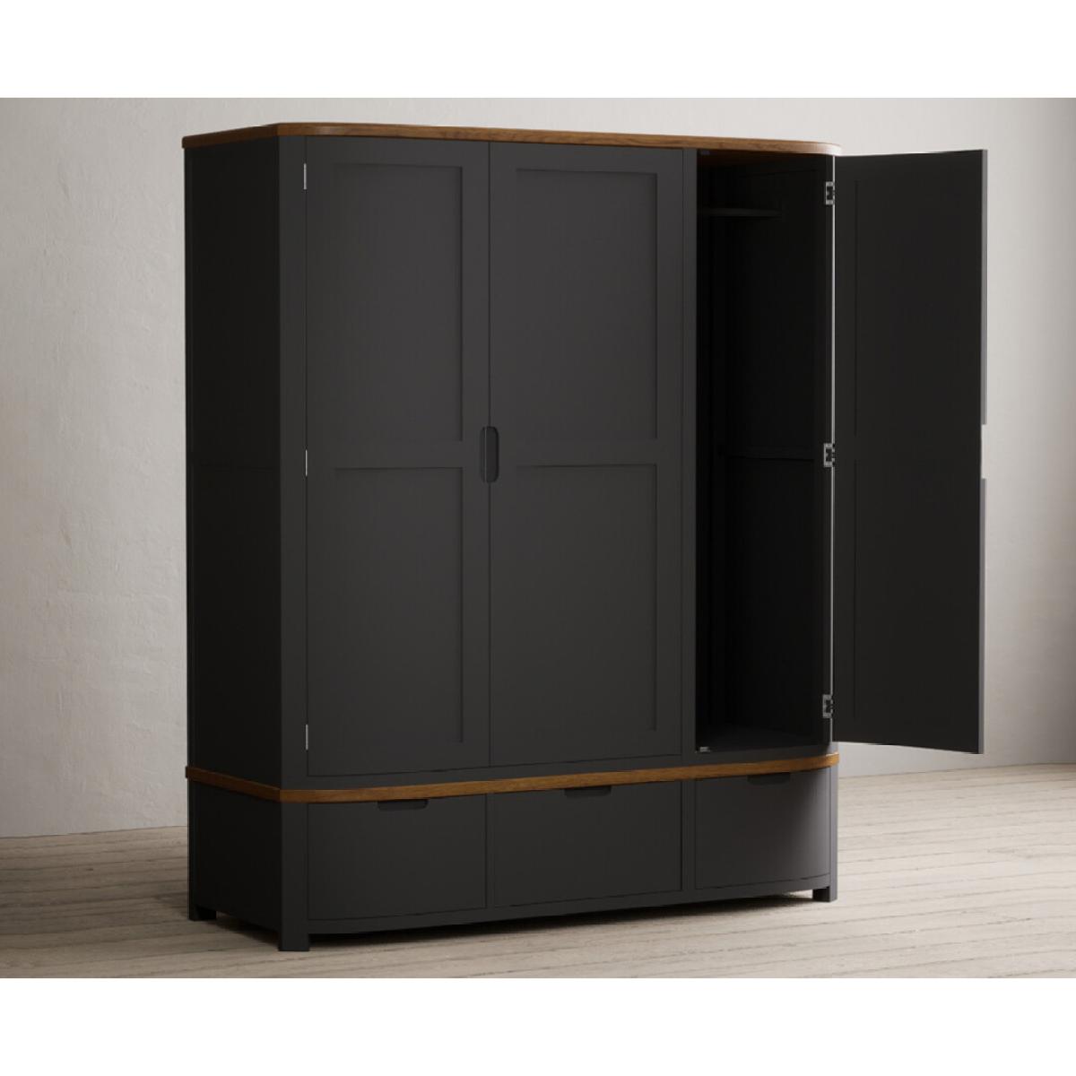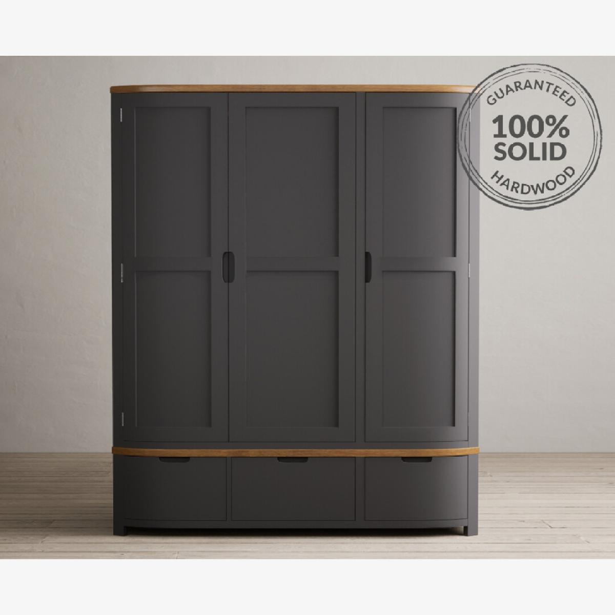 The Bradwell Oak and Charcoal Grey Painted Triple Wardrobe is crafted from solid hardwood with a charcoal grey painted finish and topped with 100% solid oak.