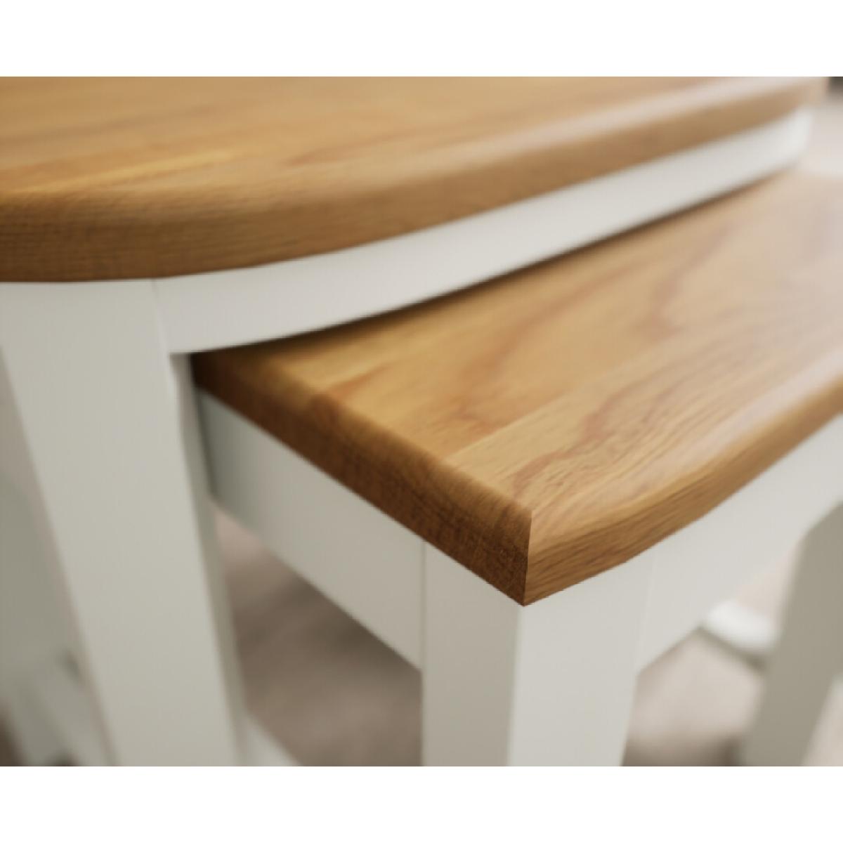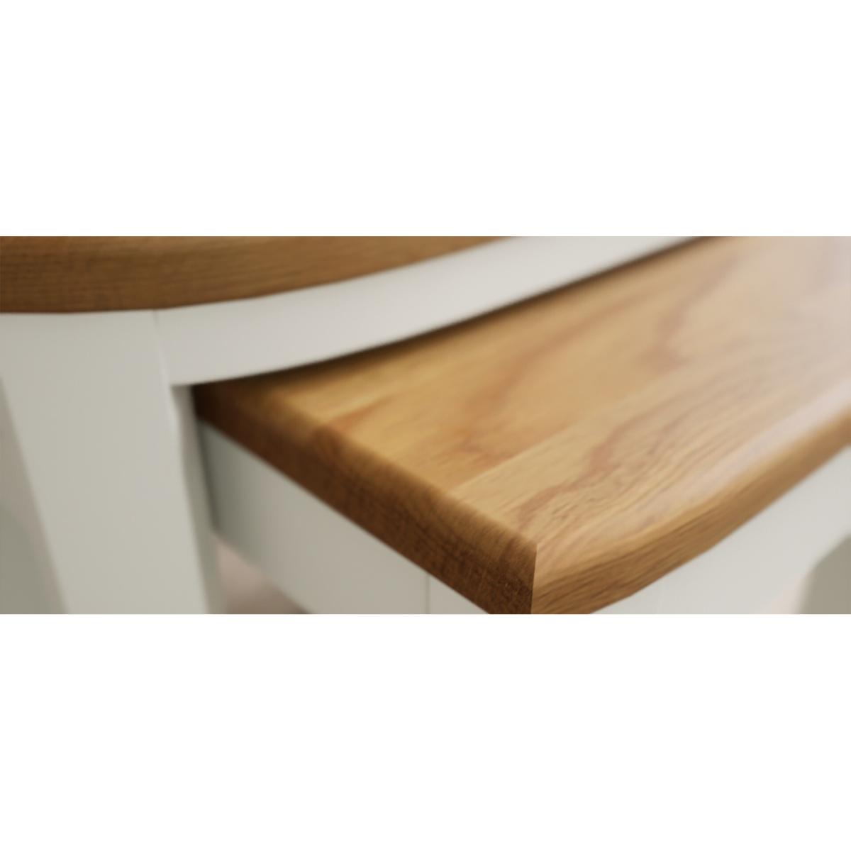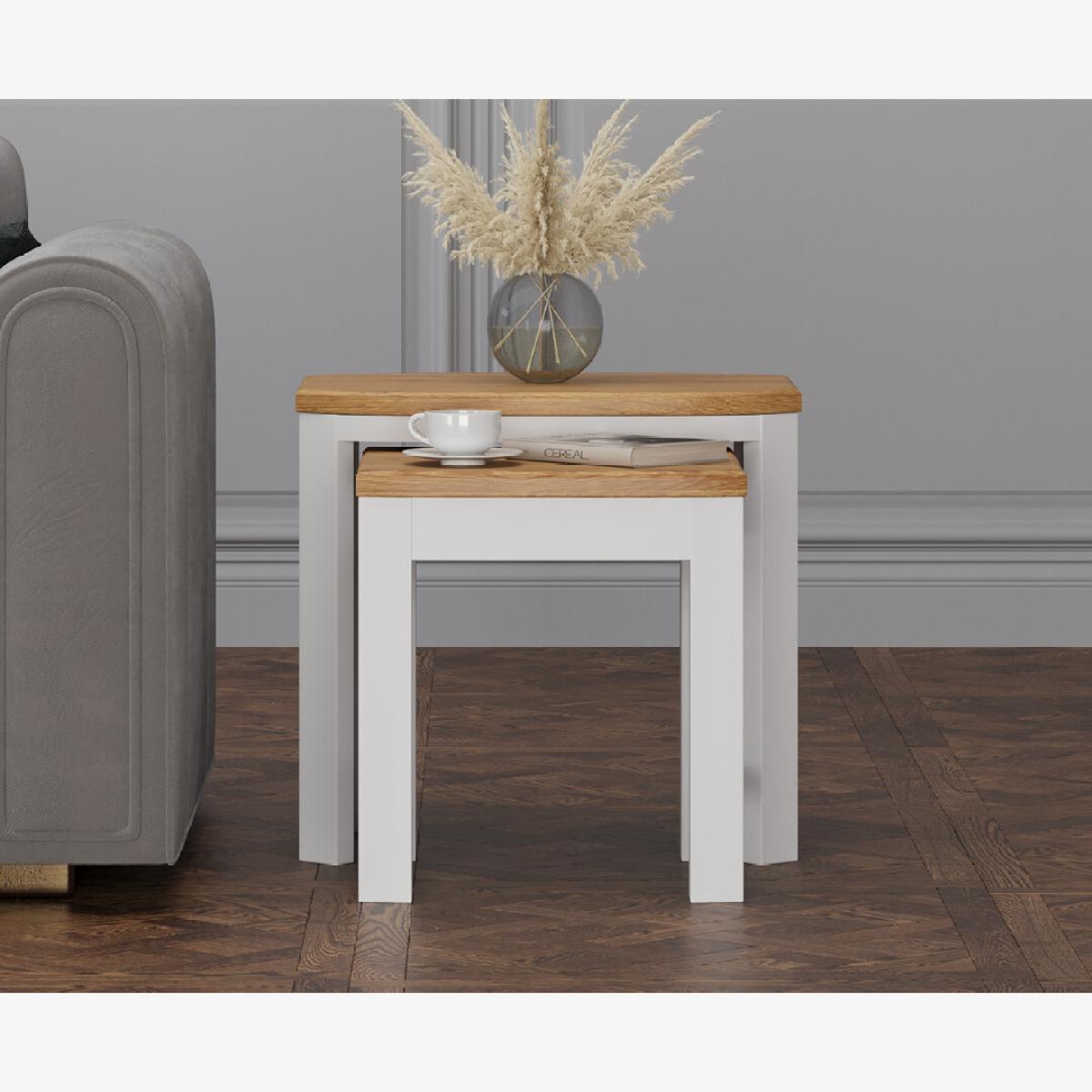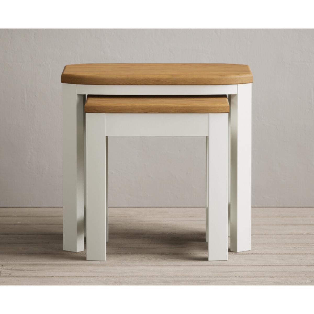 The Bradwell Oak and Signal White Painted Nest of Tables is a set of two versatile tables with chalk-white painted solid hardwood frames and solid oak tops.