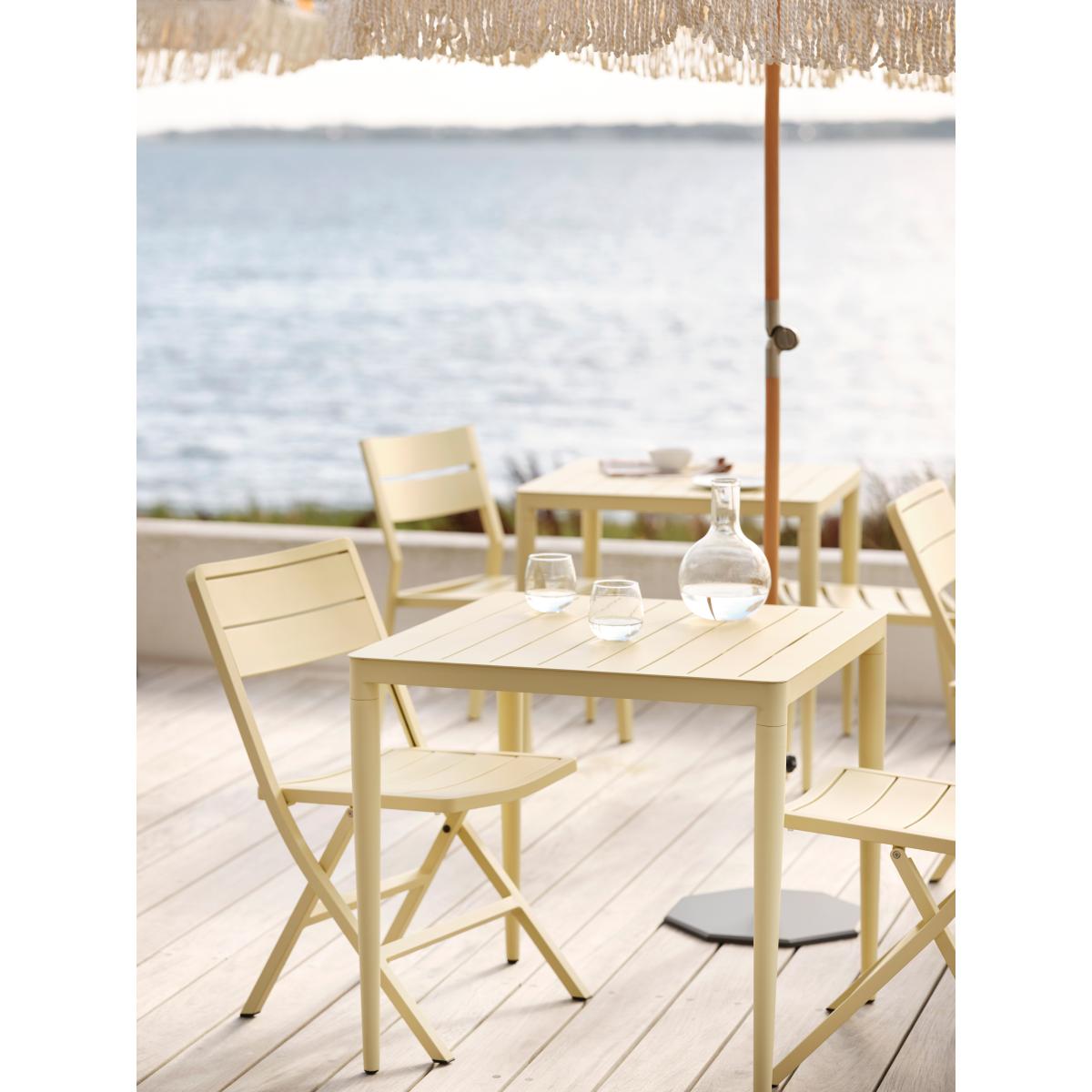 Bigby dining table from Brafab combines Scandinavian design with the charm of the big city to create a summery atmosphere. Made of aluminum, it offers elegant lines and carefully crafted details, including tapered legs and a slatted tabletop. The vibrant summer-inspired colors add an extra dimension and a refreshing feel to your patio.