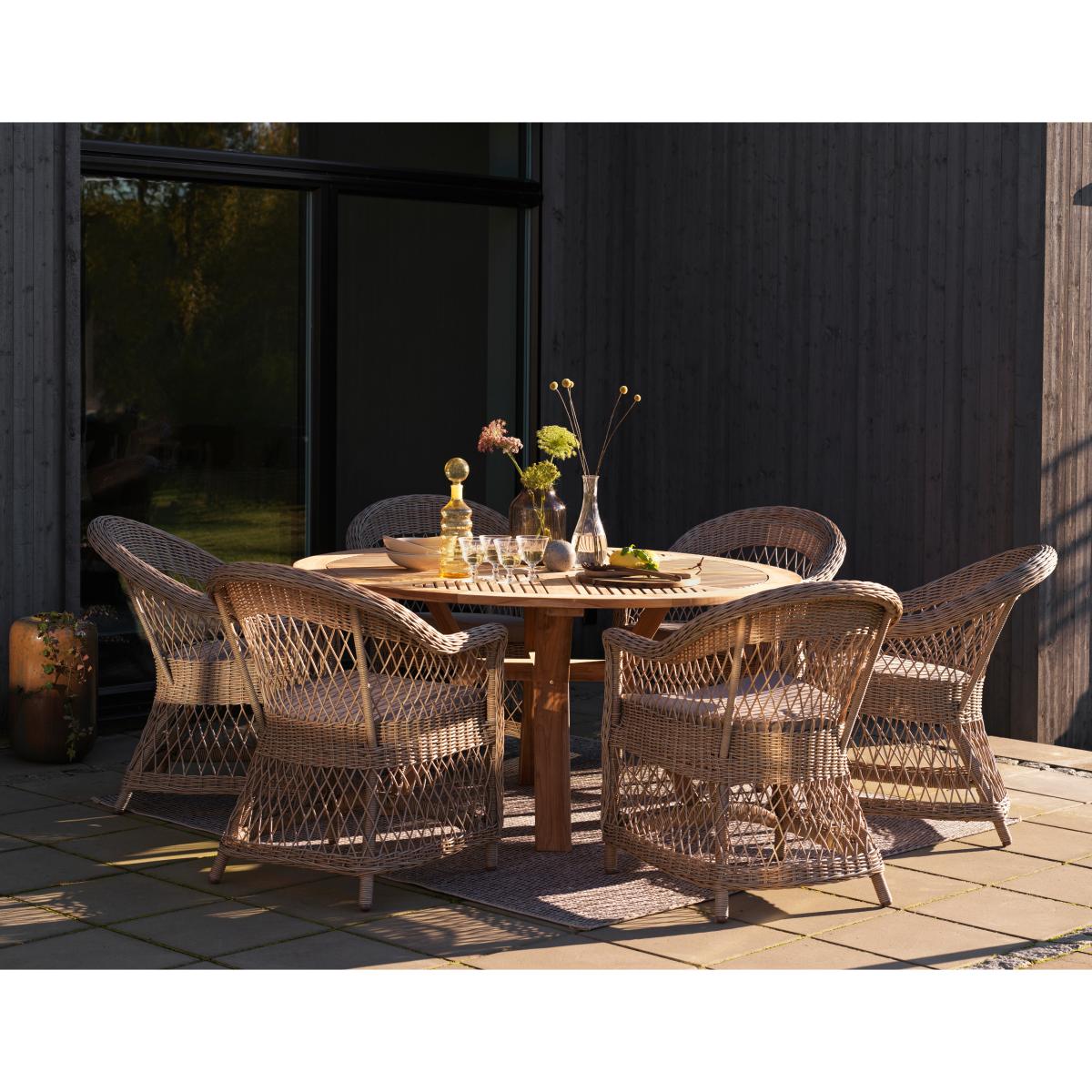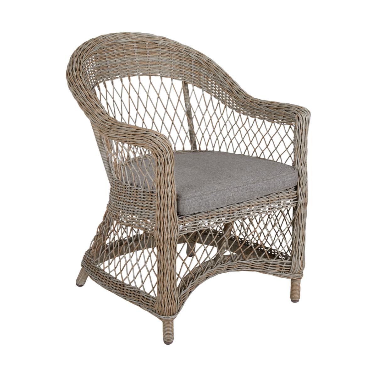 The 'Kamomill' armchair with seat and back cushion from Brafab is timeless and elegant. Made of natural-colored synthetic rattan with an open weave, it offers a relaxing seating experience. The cushion in durable olefin fabric in a soft beige tone provides extra comfort. Ideal for relaxing moments in the garden or on the porch. Perfect for creating an inviting atmosphere in any outdoor environment.