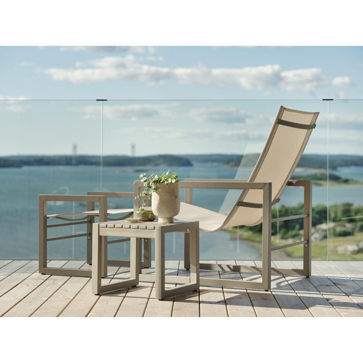 Vevi side table from Brafab is the perfect solution for creating a comfortable patio. Its Nordic design language with influences of cubism and graphic elements makes it a timeless choice. Place it between sun loungers or next to your lounge chair to store drinks, books, or sunglasses within reach. The side table complements the rest of the Vevi collection, creating a harmonious and inviting atmosphere for relaxation and socializing outdoors. Design by Dick Björk.