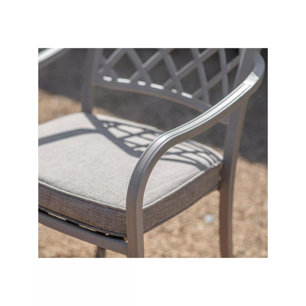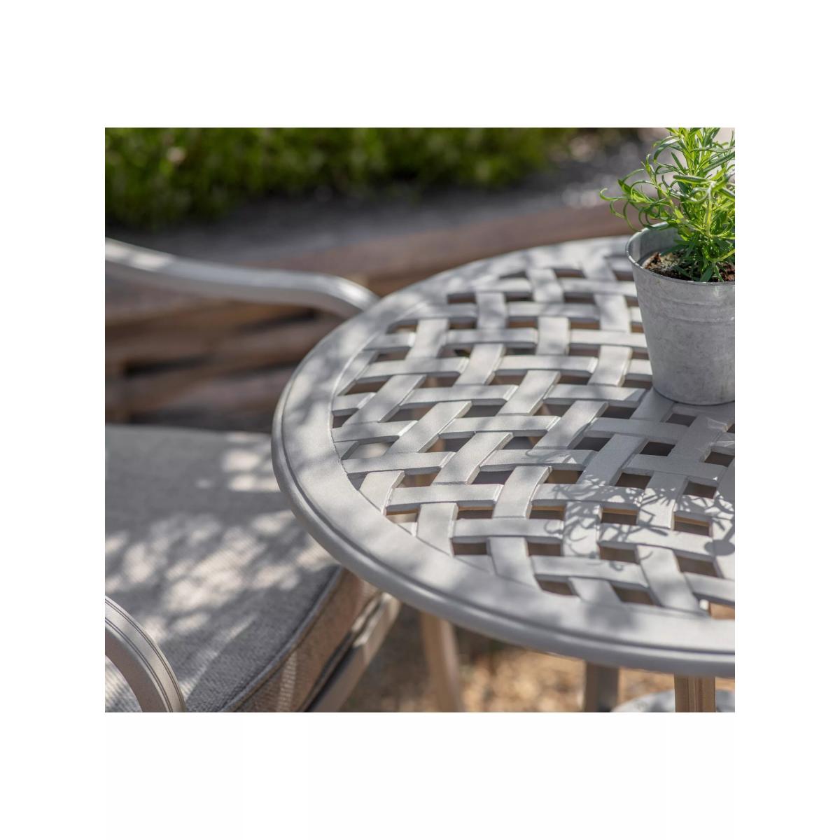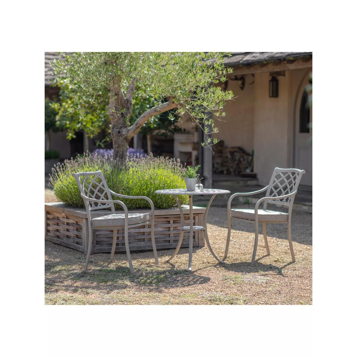 The Bridgewater range is part of an exclusive collection by Bramblecrest and the RHS. An ideal addition to courtyards, walled gardens, cottage-style gardens and even the smallest of spaces, this two-seater bistro set features a decorative lattice design to add a stylish touch to your outdoors. Key features: Two garden dining chairs with seat cushions Round 70cm bistro table Robust cast aluminium frames in Stone colour Lightweight and rust-free Chairs are stackable for easy storage