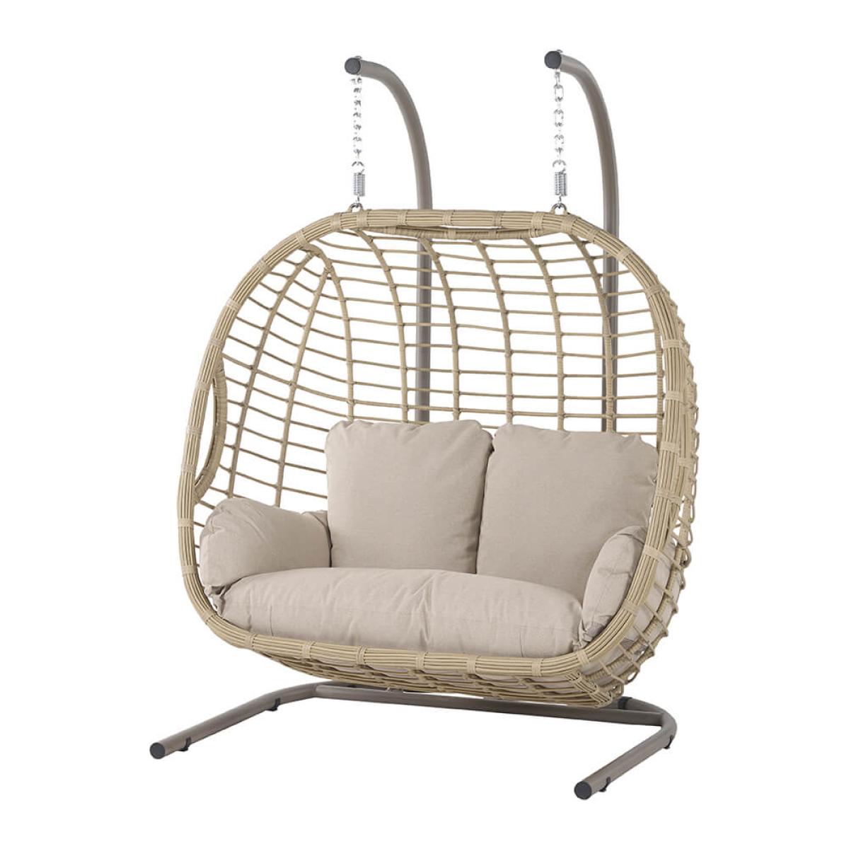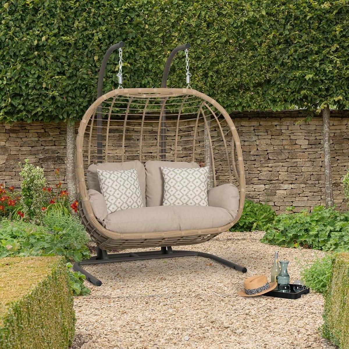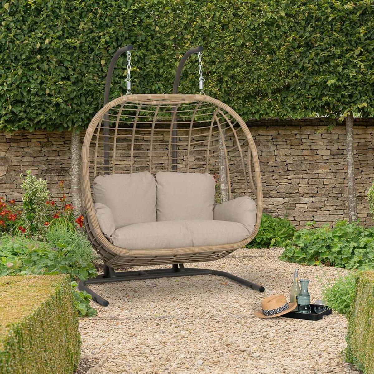 Set consists of:. About:. Create a sanctuary within your garden for two with this elegant double hanging garden chair. The Bramblecrest Chedworth Open Weave Double Cocoon is a wonderful stylish hanging seat for two that will effortlessly suit many garden arrangements. Find ample room for yourself and a partner to achieve relaxation on this hang chair, complete with enjoyably plump season proof cushions that are equipped to repel light rain, frost and staining. Be sure to store these cushions indoors, or in a. Cushion box. , during winter months or heavier periods of rain. The wider rattan weave is a style preference enjoyed by many, casting a chic refined structure for your garden, less visually dominating in some respects. The rattan itself is extremely smooth but this synthetic fibre also benefits from a high level of climate repellency, guarding against moisture. As such it’s largely fine to leave as it stands outdoors, for windier months or excessive times of rain a protective cover is a great idea to shield your chair, find a link to this beneath the descroption. The powder coated steel hang frame is sturdy and the coating helps resist rust, plus is lightweight so repositioning this delightful garden swing set is simple. Enjoy alfresco aperitifs or immersing yourself in a good book in the comfort of your own garden. Key features:. To further protect this cocoon from the elements and give your product a longer lifespan we recommend the protective cover that’s made to fit, visit the link below:.