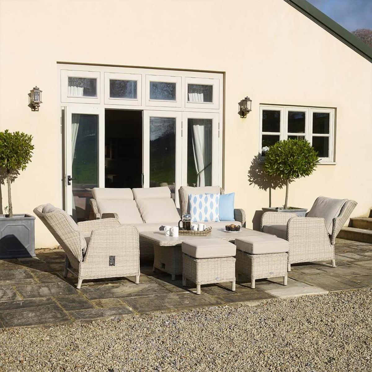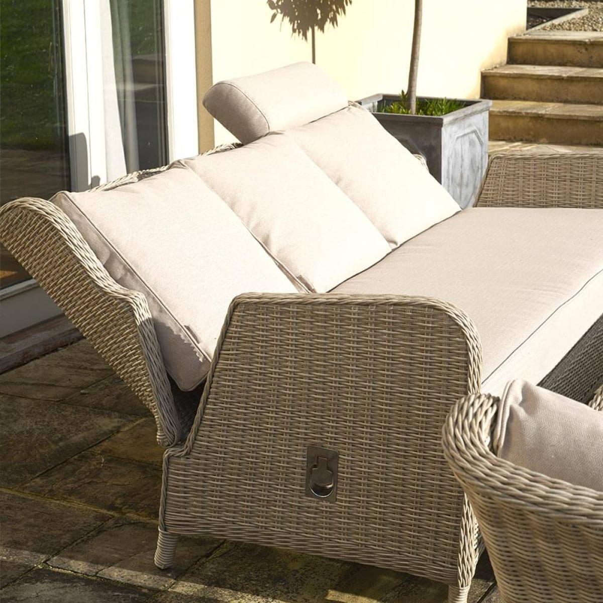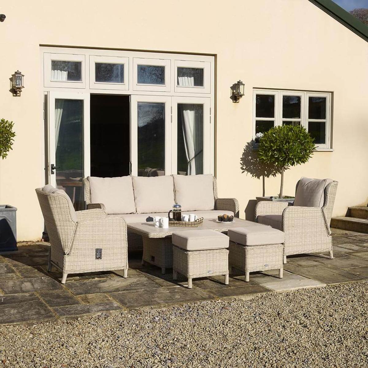 Set consists of:. About:. Achieve blissed out relaxation and alfresco memories with ease this year on the supremely comfortable and stylish Bramblecrest Chedworth Reclining 3 Seat Sofa Adjustable Dining Table Set. This luxurious rattan furniture set by industry leaders Bramblecrest goes the extra mile in the relaxation stakes, with a maximum of 7 people able to sit and enjoy the outdoors, 5 of which can do so in reclined comfort. Two of the three sofa seats recline in tandem and one reclines separately or they can all recline in one block for optimal relaxing. The ceramic topped table is tactile, attractive and extremely durable plus is height adjustable for ease of dining or for more casual nibbles and drinks. The furniture itself is made from sturdy rattan weave, a synthetic fibre ready to stand up to the outdoors, smooth yet strong and resistant against moisture. The sandstone shade chosen for this reclining garden furniture set will complement many gardens, whilst its pleasing curves are also easy on the eye. Probably the crowning detail of this gorgeous rattan outdoor dining set is the number of reclining seats it offers. Sink backwards into the plush and incredibly thick cushions of the sofa, and the two armchairs, use the reclining function with a pull of the lever to the chair’s right side. The cushions are season-proofed so can withstand short sharp showers, light rain and frost but are best stored indoors during heavier weather and certainly over the winter. Enjoy fine food and company outdoors for up to 7 people this year on this chic modular rattan garden furniture. Head rests can be purchased separately. Key features:.