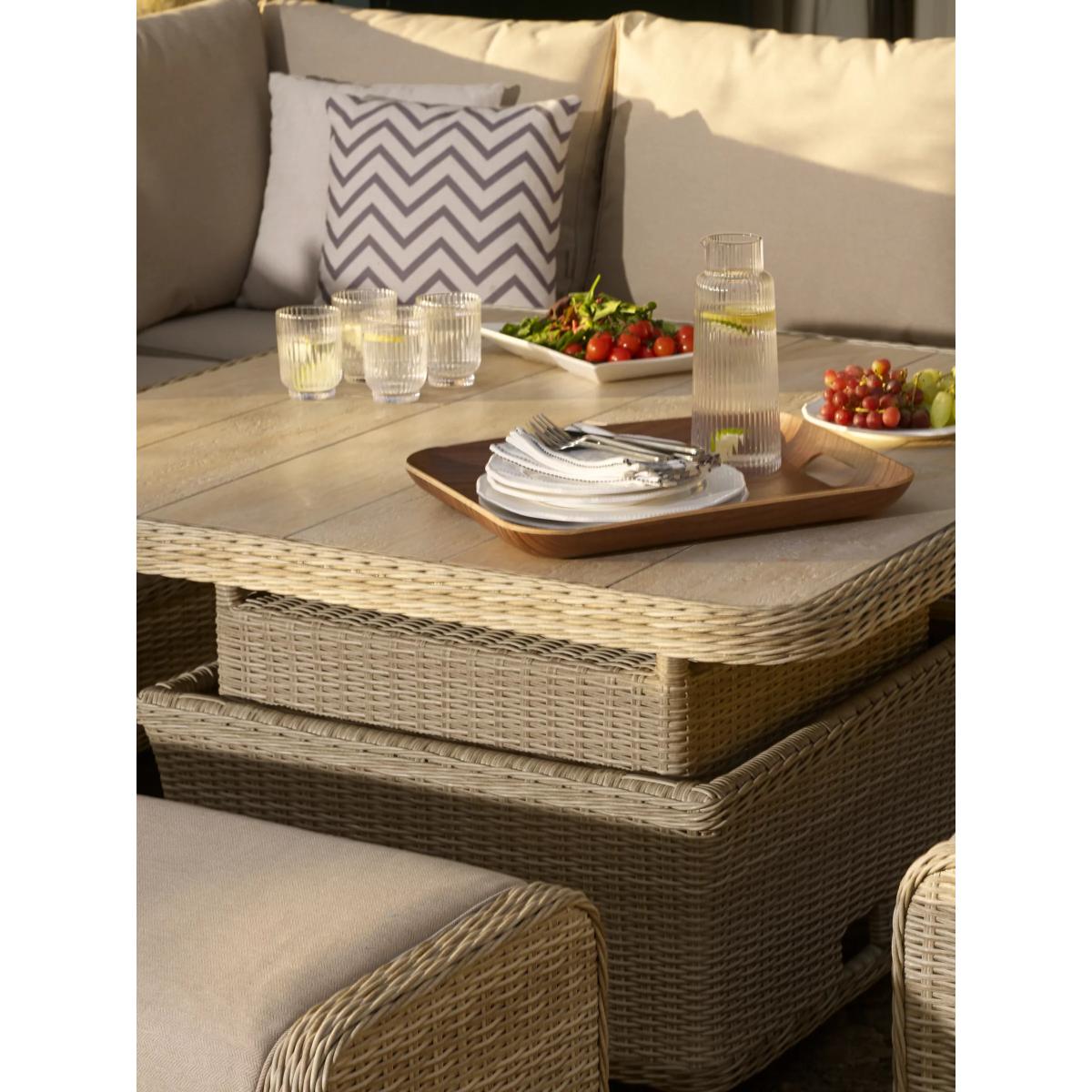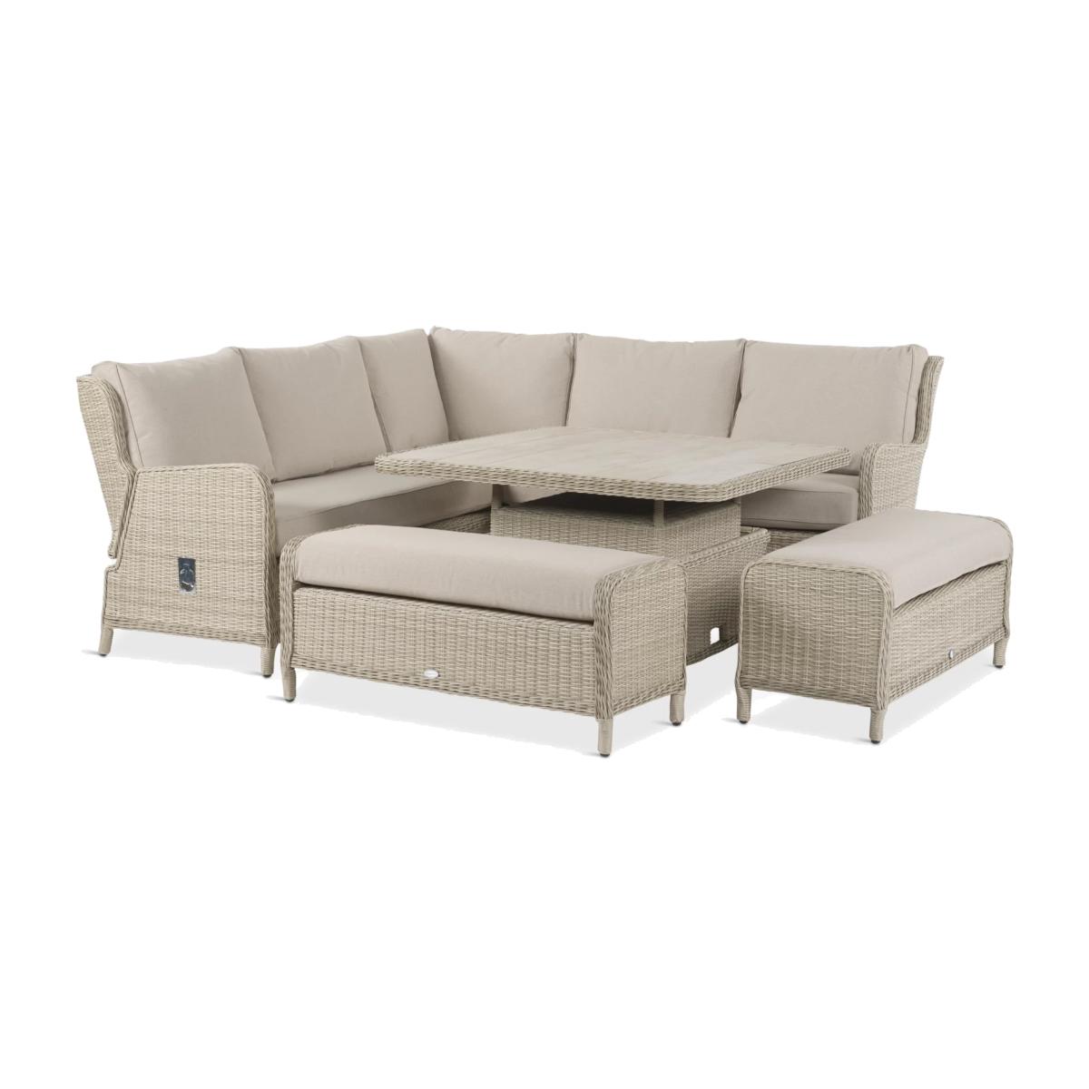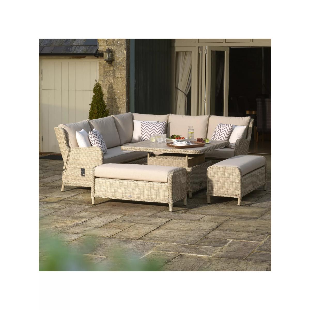 With its pleasing blend of traditional rattan design, this Chedworth Reclining Sofa Set from Bramblecrest balances classic good looks with the benefit of modern materials. Enjoy a long lunch by adjusting the tabletop to full height or simply lower for a coffee table set-up. And when you're done entertaining, recline the sofa back to indulge in an afternoon siesta in the sunshine and use the dining benches as footrests. The all-weather rattan is built on rust-free aluminium frames, making the furniture lightweight and easy to move. Blissfully comfortable soft-touch Herringbone Barley cushions, made from season-proof fabric, complete the look. The square side table features a durable, ceramic top which is thoughtfully recessed into the weave for added protection. Key features: 4-seater garden corner sofa set, 2 x two-seater dining benches Height-adjustable square coffee table with durable, recessed ceramic top Smooth reclining mechanism All-weather outdoor rattan on lightweight, rust-free aluminium frames Season-proof cushions in Herringbone Barley are water, UV and stain resistant Frost resistant and UV-resistant Suitable for both indoor and outdoor settings