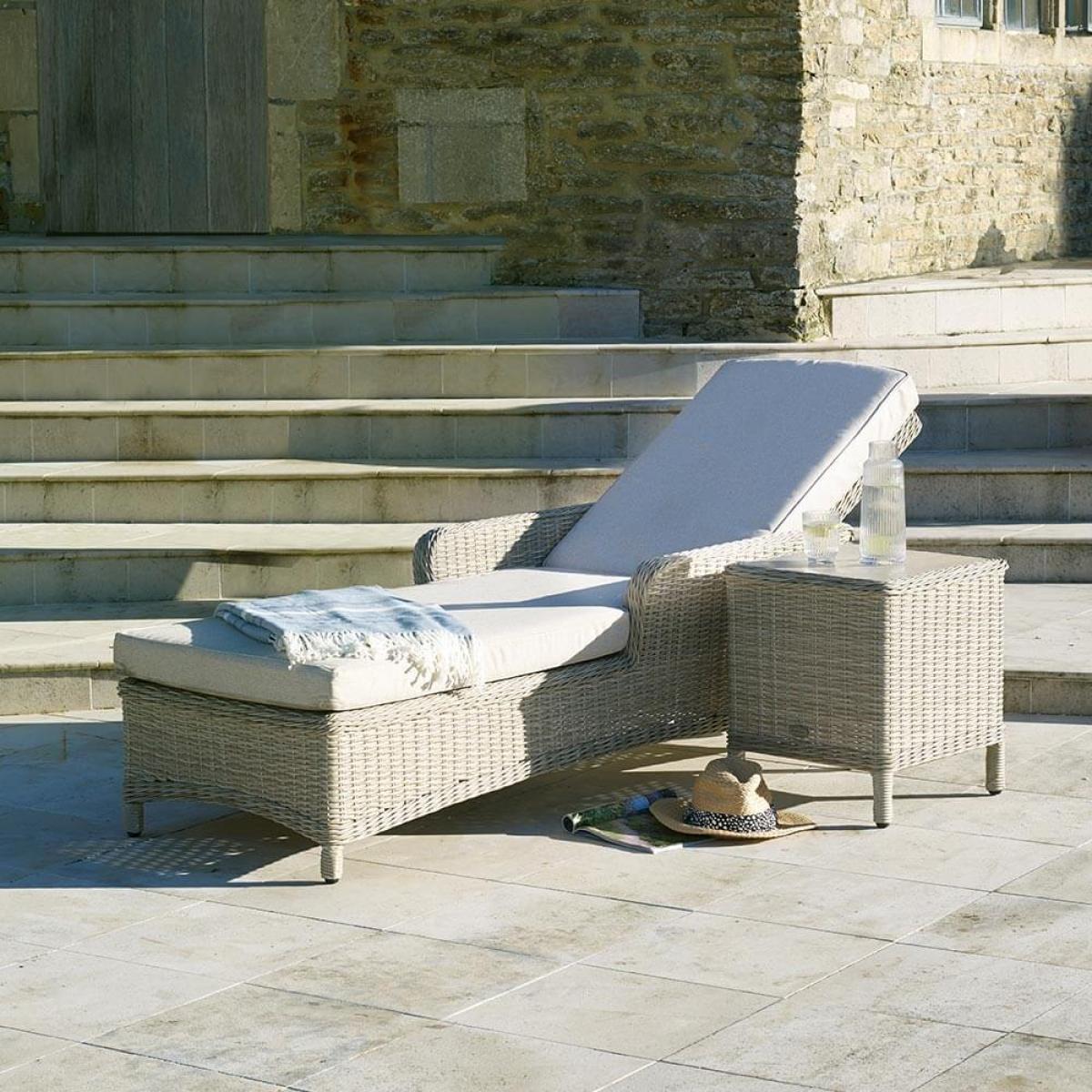 Set consists of:. About:. Introducing the Bramblecrest Chedworth Lounger, perhaps the most luxurious single lounger in the Bramblecrest catalogue. Recline in sophisticated comfort on the excessively plump season-proof full length cushions, the same level of pleasing plumpness that’s to be found across the whole Chedworth range. The seat padding is season-proofed so will withstand outdoor use repelling light showers and frost, however just be sure to store the cushion during the winter months and during heavier spells of rain. A lightweight aluminium frame that’s sturdy is also pleasingly lightweight so this rattan garden lounger is easily moved about the garden. The neutral sandstone rattan is not only attractive and enjoyably smooth but also fantastically repellent against the outdoor elements. The synthetic fibre that makes the rattan is inherently resistant against moisture. Recline the back with the lever found on the chair’s right side, this gives options to the angle of desired relaxation. The mini coffee table is ceramic topped and rises to a helpful 50cm height to place refreshments when soaking up the finer weather, it too is wrapped in the neutral shade sandstone rattan, sure to complement many gardens, patios and decking this season. Key Features:.