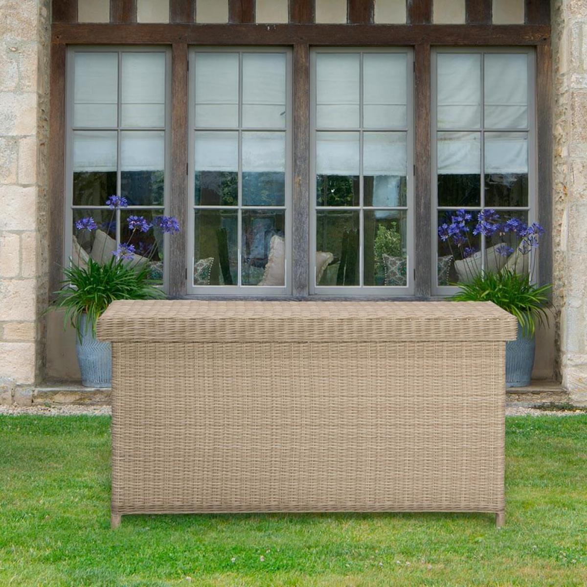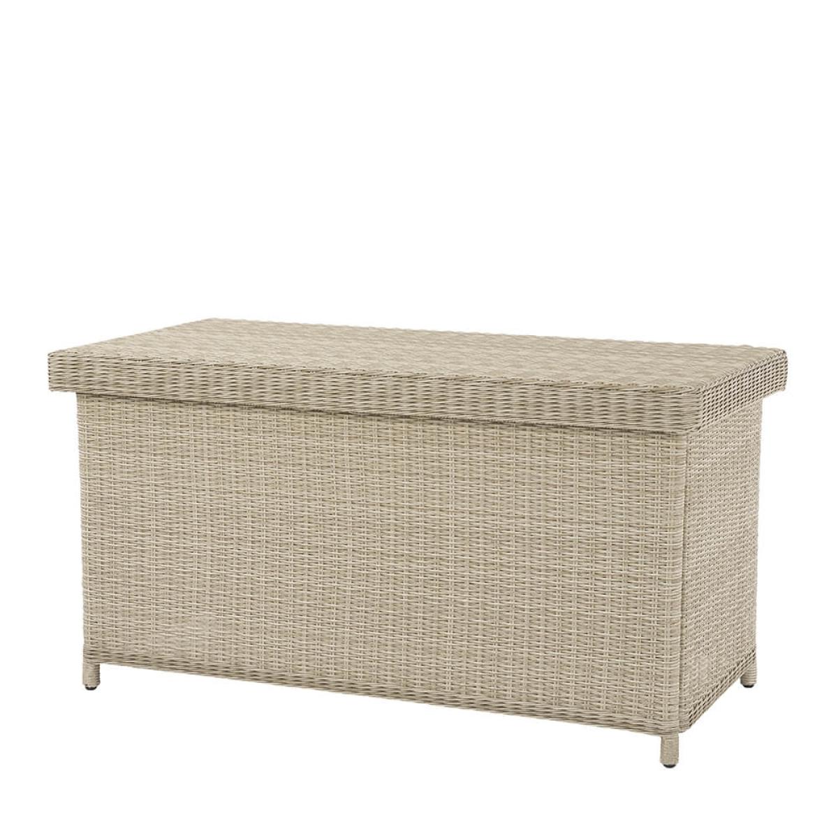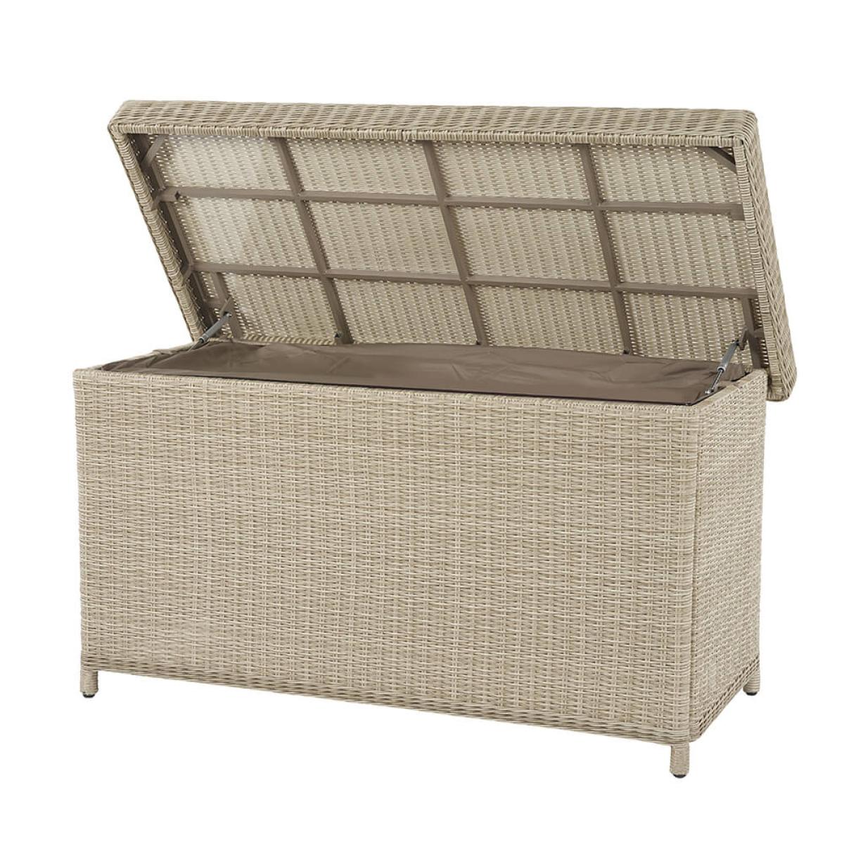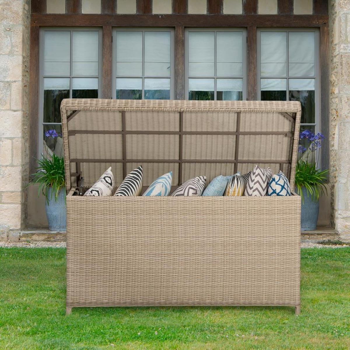 Product consists of:. About:. A stylish storage solution for all your outdoor sofa and chair cushions, the Bramblecrest Chedworth Standard Outdoor Cushion Storage Box in Sandstone rattan also features a convenient compartment for children’s toy and garden games. To ensure that everything inside them is safe and secure, these cushion storage boxes have been fitted with a hard-wearing waterproof liner. We do still recommend that in the height of winter cushions are kept indoors so as to avoid eventual musty and mouldy upholstery. Alternatively, if space is lacking indoors the cushion box itself can now be protected with it’s own. Protective cover. , see below key features for details on this. Key features:. Further protect this cushion box and in turn your cushions during the winter with a protective cover made from durable polyester. This has been designed to specifically fit this box, follow the link below to be take to this. Sold separately:.