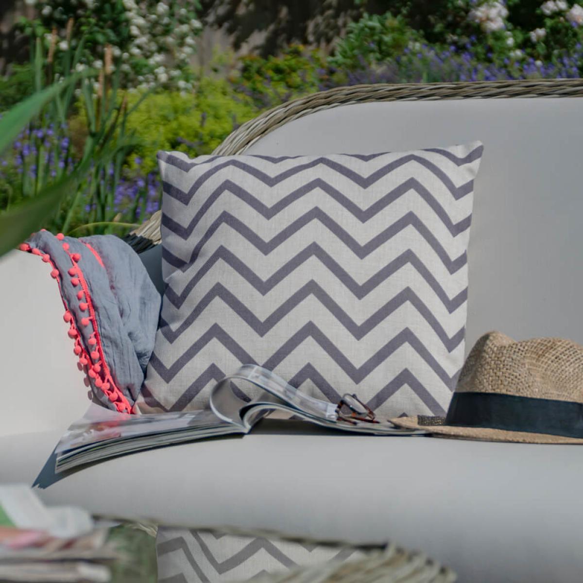 This Bramblecrest scatter cushion is specifically designed to be used outside, with a handy season-proof fabric that will deal with light rain showers. The unique chevron pattern adds an element of design and chic to any garden dining-set. Key features:.