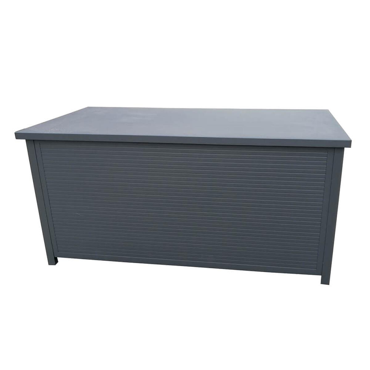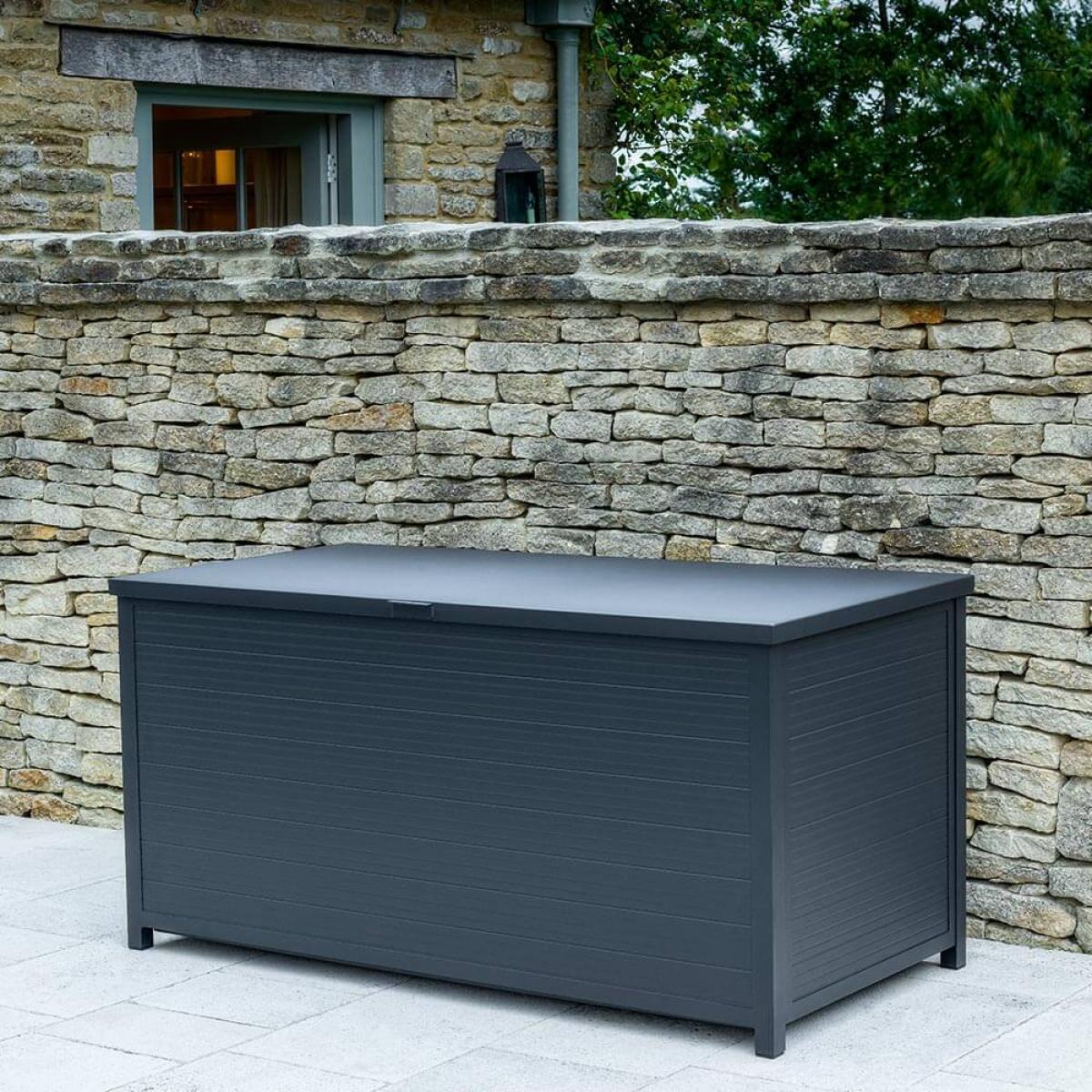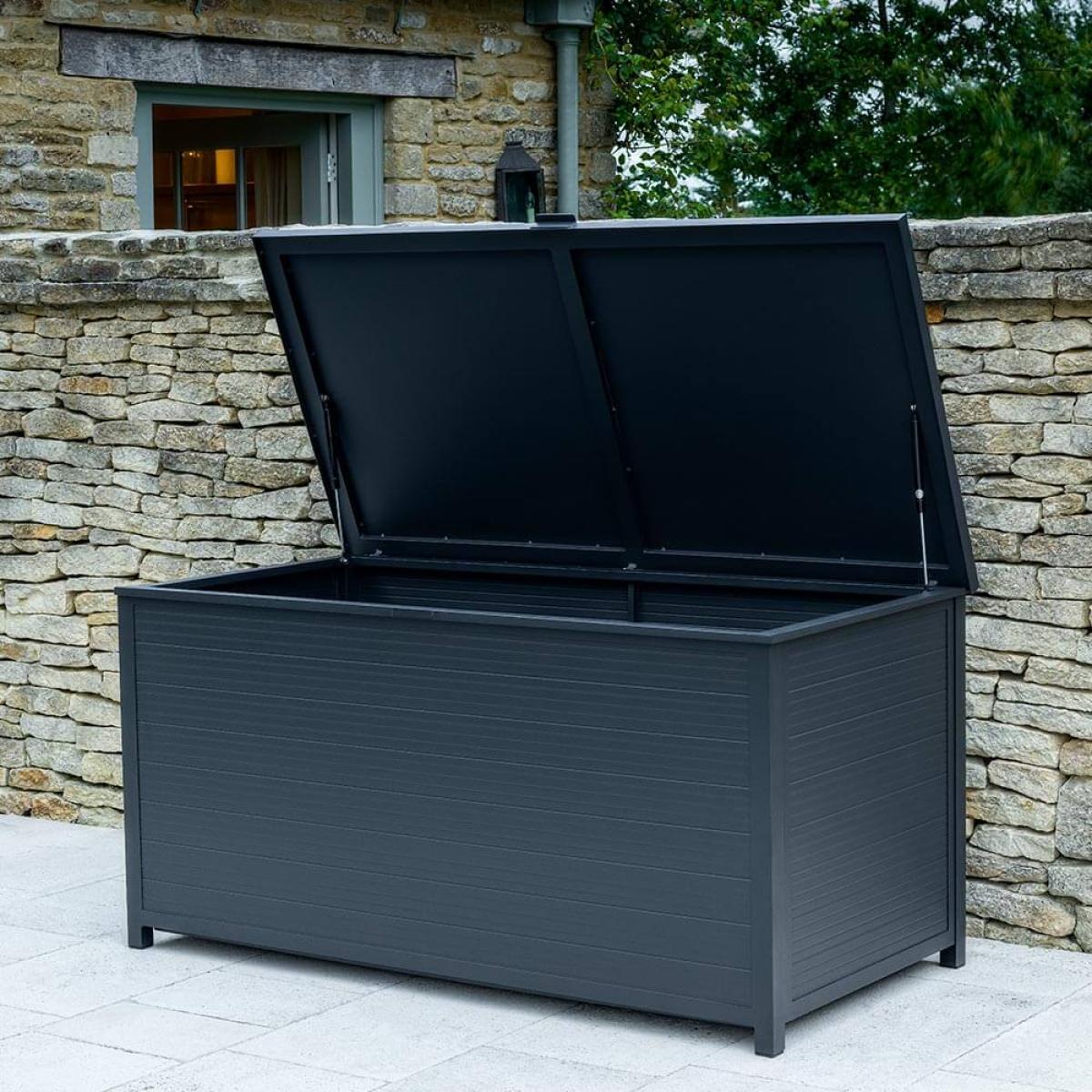 Product consists of:. About:. Keep your large garden cushions and outdoor belongings safely stored in this tasteful large aluminium garden storage box. The attractive anthracite aluminium finish complements the entire. La Rochelle range. , made of the same metal. The strut feet keeps the bottom slightly elevated from the ground, meaning any ground freeze won’t needlessly affect your contents. Whilst the climate resistant liner adds further protection, although we do still recommend using a large cushion box protective cover to add the highest protection possible against heavy and particularly cold winter weather. Garden containers are helpful additions to those that are short on space indoors or don’t have storage otherwise. Pump assisted hinges mean the lid is easy to open.