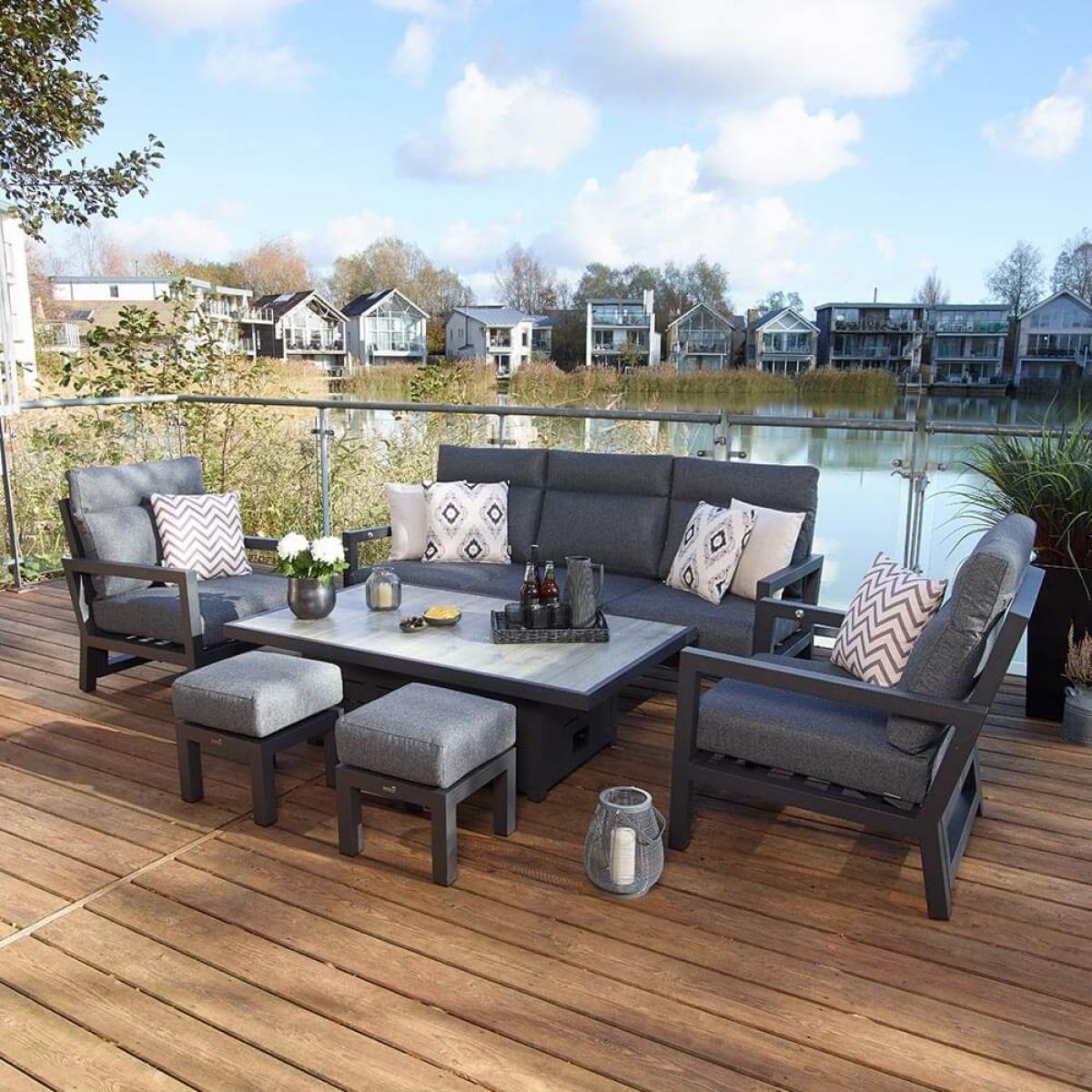 Set consists of: 1 x Bramblecrest La Rochelle 3 Seat Reclining Sofa with Season-Proof Eco Cushions – Anthracite/Dark Grey 2 x Bramblecrest La Rochelle Reclining Arm Chairs with Season-Proof Eco Cushions – Anthracite/Dark Grey 2 x Bramblecrest La Rochelle Mini Stools with Season-Proof Eco Cushions – Anthracite/Dark Grey NO TABLE INCLUDEDAbout:The Bramblecrest La Rochelle Reclining 3 Seat Adjustable Table Sofa Set is a stylish combination of contemporary cast aluminium garden furniture that’s sure to impress for years to come. The casual feel of this attractive set is counterbalanced with material choices that are both sleek and durable. Powder coated aluminium in an anthracite grey forms the structure of this garden dining set extremely durable and likably modern in style it won’t succumb to rust. The cushions are comfortable and thick and come in a dark grey slate shade that complements the metal perfectly. These cushions are season proof so can repel light showers frost and flash-downpours just be sure to store these indoors for heavy weather and certainly for the winter months. Further protect the integrity and finish of your set with a Bramblecrest protective cover set made from durable polyester. These have been designed to specifically fit this set follow the link below to be take to this. Sold separately: Bramblecrest La Rochelle & Portofino 3 Seat Sofa Set Protective Cover Set