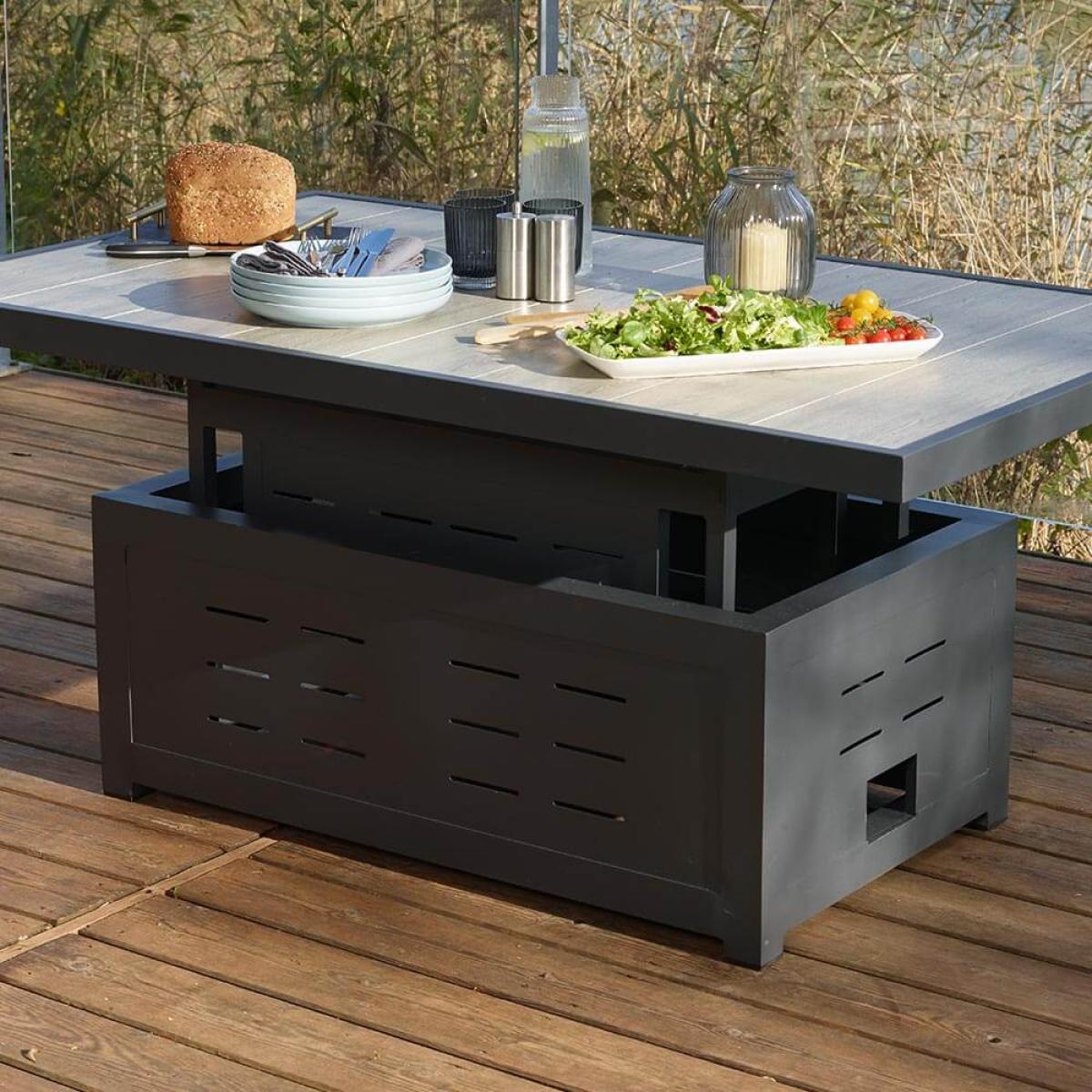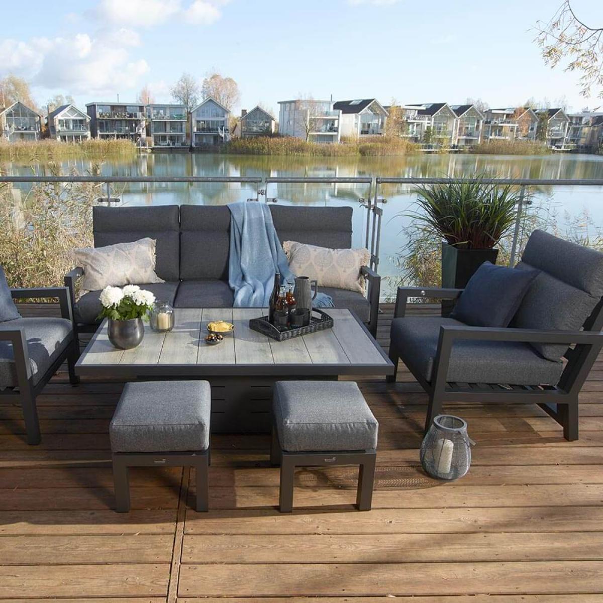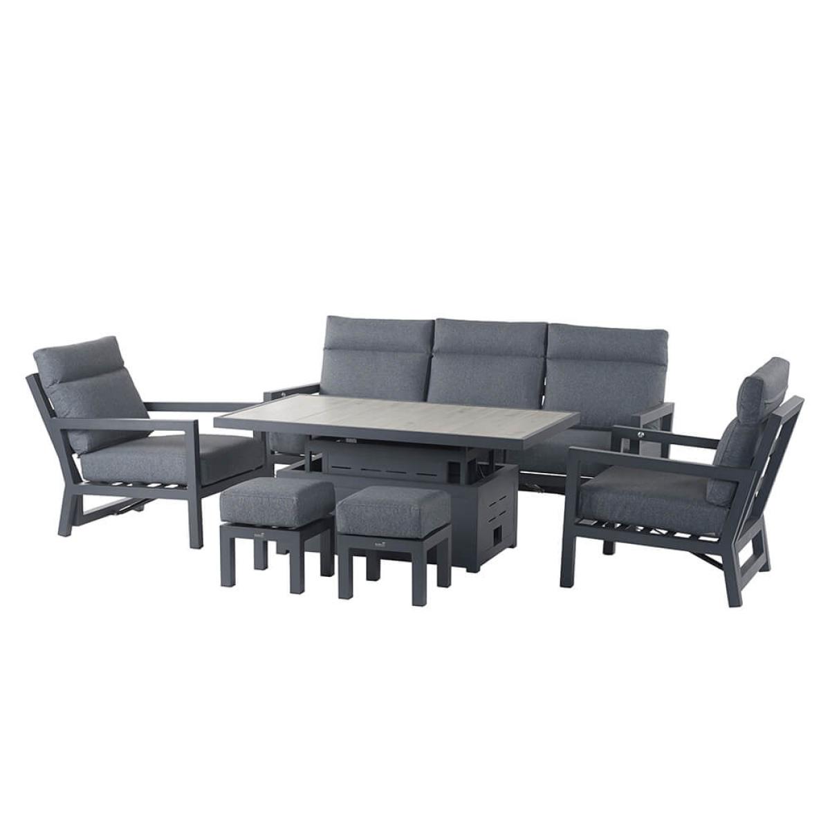 Set consists of:. About:. The Bramblecrest La Rochelle Reclining 3 Seat Adjustable Table Sofa Set is a stylish combination of contemporary cast aluminium garden furniture that’s sure to impress for years to come. The casual feel of this attractive set is counterbalanced with material choices that are both sleek and durable. Powder coated aluminium in an anthracite grey forms the structure of this garden dining set, extremely durable and likably modern in style it won’t succumb to rust. When the time calls for it either adjust the 2 seats of the sofa in tandem, the singular seat on it’s own or all together and recline to your preferred gradient. Both armchairs also recline for ultimate relaxing in style. The personlisation doesn’t end there either, with the casual dining table able to adjust height to convert laid back nibbles to a sit down alfresco evening meal. The cushions are comfortable and thick and come in a dark grey slate shade that complements the metal perfectly. These cushions are season proof so can repel light showers, frost and flash-downpours, just be sure to store these indoors for heavy weather and certainly for the winter months. A. Matching cushion box is available. To store these safely when not in use. This 7 seater Bramblecrest furniture is truly one of the most user friendly aluminium garden dining sets in our ranges. Key Features:.