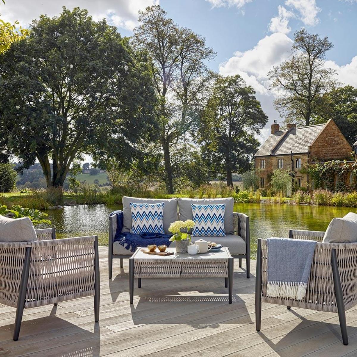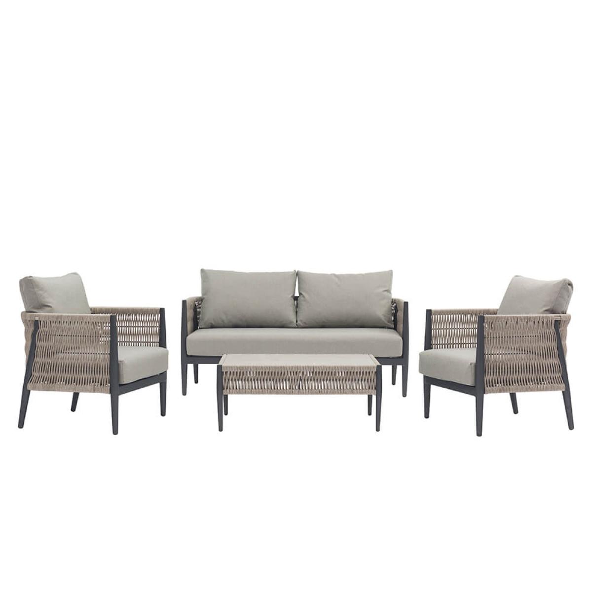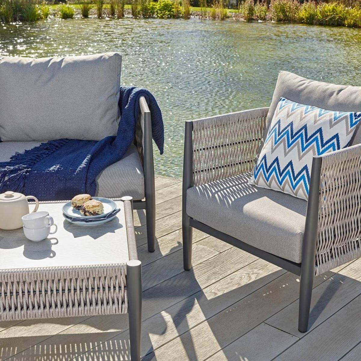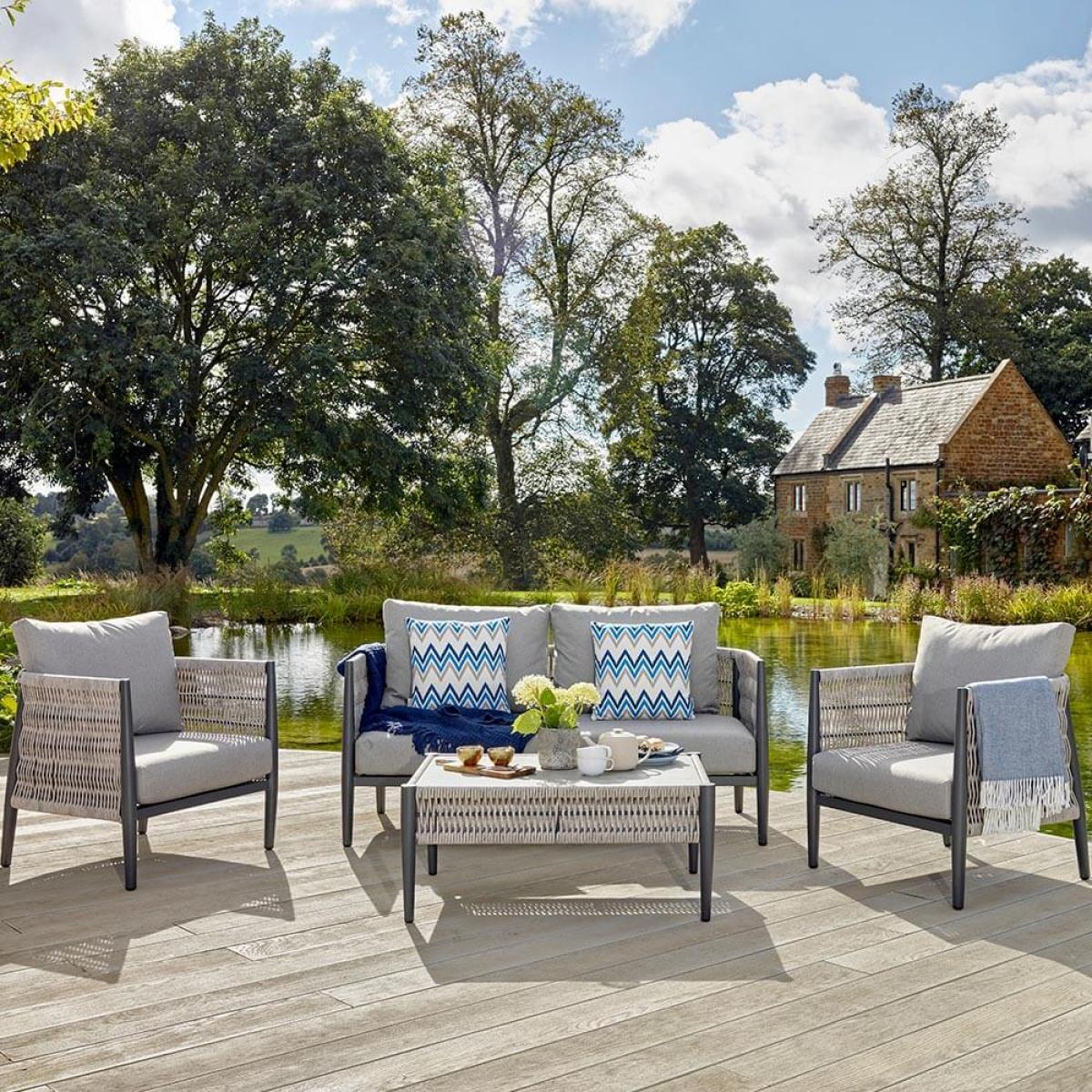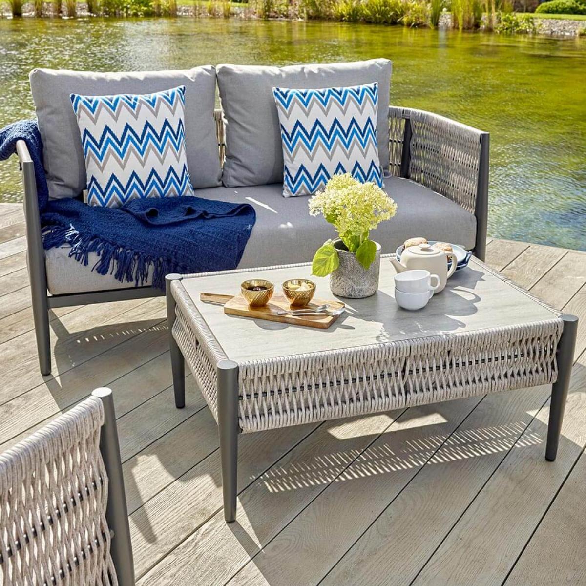Set consists of:. About:. Create a stylish seating area to dine, unwind and casually host with the attractive Bramblecrest Mauritius 2 Seat Sofa 2 Arm Chair Set. The Mauritius range debuts for Bramblecrest with lovely details that help define its elegance. Find a gorgeous garden dining range boasting an eye catching rope effect construction, bound tightly around the aluminium frame. This rope is made from synthetic rattan and helps define this range’s rounded, playful and modern profile. This set comes with a 2 seat sofa and two deep seat armchairs as well as a ceramic topped coffee table tastefully recessed into position. The Heron grey/beigey tones of the rope effect rattan contrast pleasingly with the cobble grey tones of the season-proof cushion sets. These cushions will not only provide excellent comfort but also boast a water resistance against light rain showers and frost. The synthetic rope itself is also high performing against moisture, meaning this set is largely fine to leave out to the elements. We do recommend the cushions are stored indoors or within a cushion box in the winter months or for periods of heavy weather. Whereas the set itself can be protected against bird droppings and tree debris using a protective cover, read about this below. We think this 4 seat garden alu-rattan outdoor dining set is destined for stylish decking, patios or lawns. Key Features:.