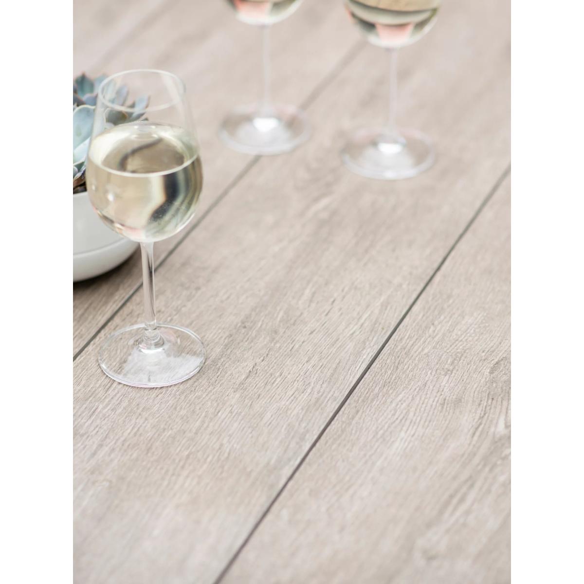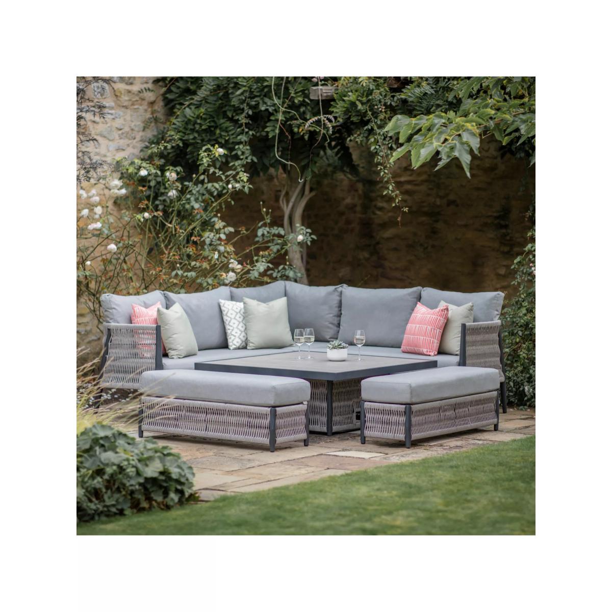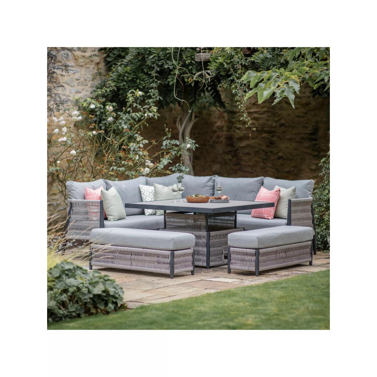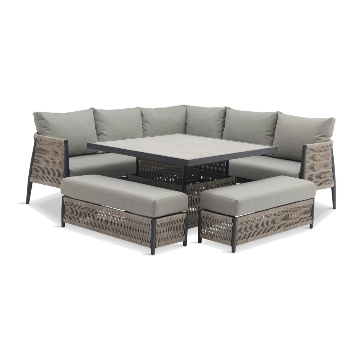 With its clever height-changing ceramic tabletop, the versatile Mauritius sofa set from Bramblecrest transforms from low-level coffee to dining table and back again in an instant. Two padded dining benches maximise seating and space. Quick-drying and easy to maintain, the set has synthetic Heron Grey rope hand woven onto contemporary lightweight and rust-proof aluminium frames. Finished with Eco-fabric cushions, spun from material using recycled plastic bottles, this set is both hard-wearing and season-proof. Key features: 4-seater garden corner sofa set, 2 x two-seater dining benches Height-adjustable square coffee table with durable, recessed ceramic top All-weather outdoor weave in speckled Heron Grey on lightweight, rust-free aluminium frames in Anthracite Season-proof cushions in Cobble are water, UV and stain resistant Frost resistant and UV-resistant Suitable for both indoor and outdoor settings