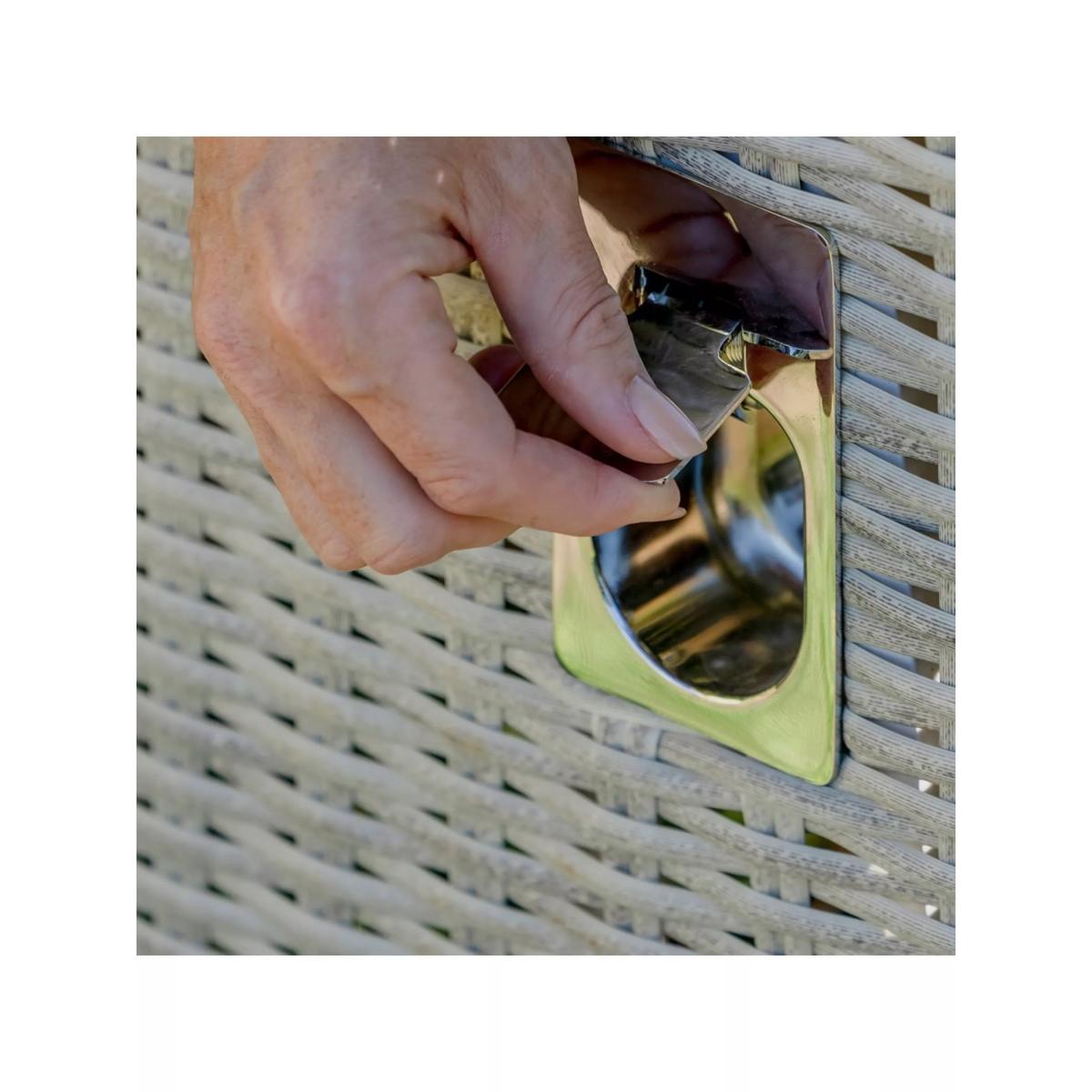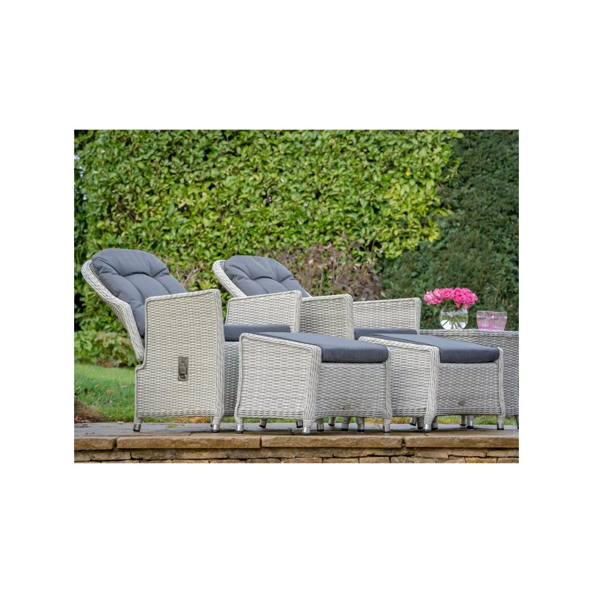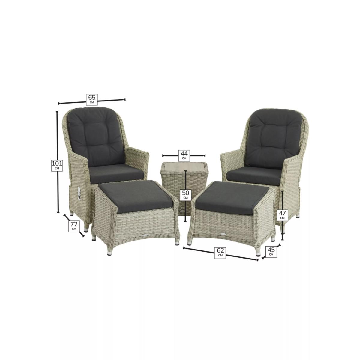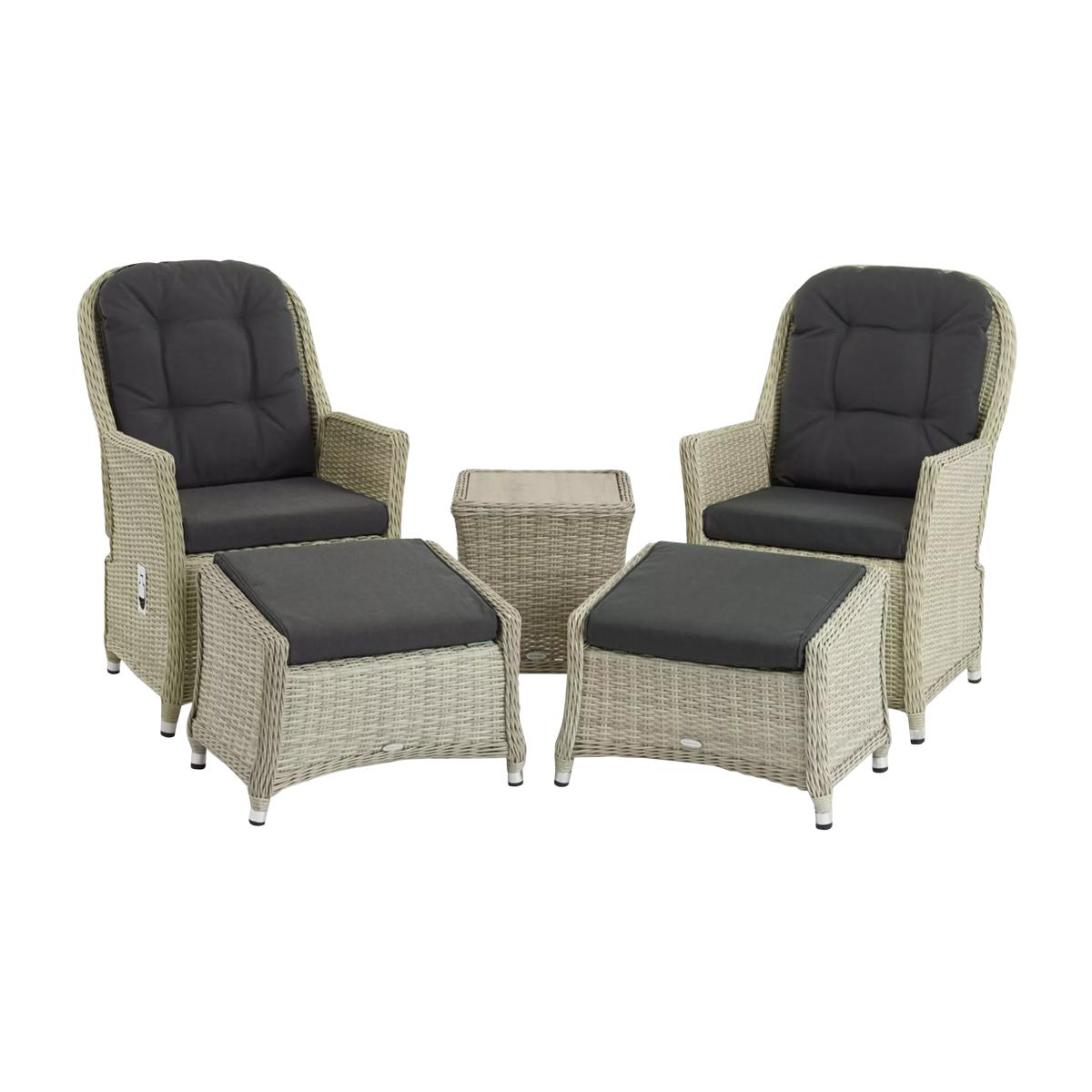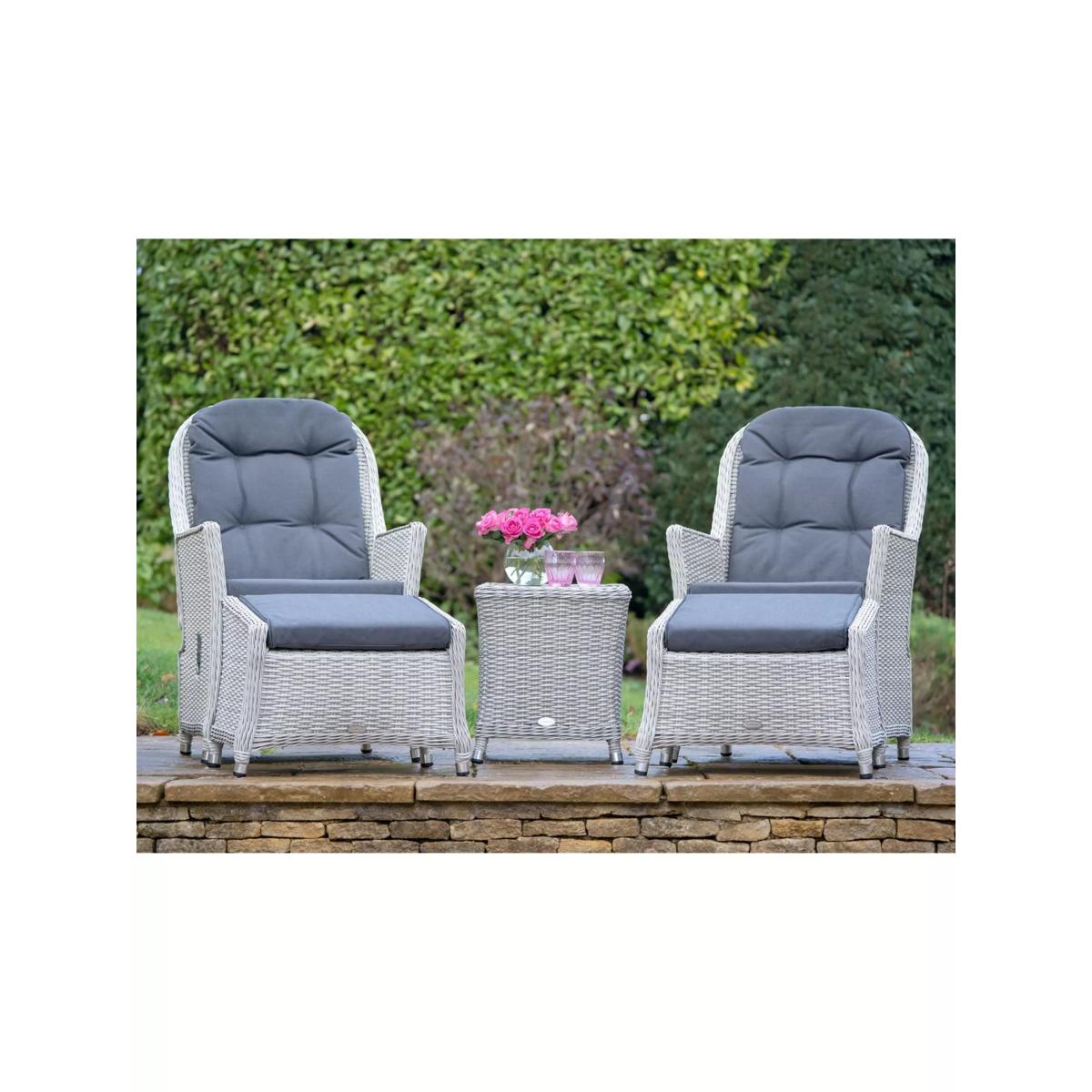 Create an al fresco chill-out zone for two with this rattan recliner set. The smooth reclining mechanism allows you to sit up or lie back at any angle. Simply pop your feet up and grab a glass from the handy matching side table. Pure post-gardening bliss. Charcoal coloured cushions are made from Bramblecrest's innovative Eco fabric, spun from recycled plastic bottles. The soft-touch cushions retain the hardwearing, season-proof quality that is synonymous with the brand's outdoor fabrics. The all-weather, Dove Grey rattan is built on aluminium frames, so the furniture is lightweight, strong and rust-free. Key features: Two reclining garden chairs and matching footstools Smooth, piston-operated reclining mechanism Square side table with a frost-resistant, recessed ceramic tabletop All-weather outdoor rattan on lightweight, rust-free aluminium frames Season-proof Eco cushions are water, UV and stain resistant Pinched-back backrest cushions and seat pads in Charcoal Frost resistant and UV-resistant Suitable for both indoor and outdoor settings Care information Remove surface dirt using warm water or a hose and a non-abrasive scrubbing brush or sponge. Jet-spraying may damage the painted finish or rattan Remove spillages on cushions immediately using an absorbent sponge or cloth. For stubborn stains, hand wash at 30°C using a household stain remover Do not machine wash season-proof cushions or cushion covers, as this may cause damage to the water-resistant lining All Bramblecrest cushions are season-proof and are lined with a plastic membrane designed to prevent water ingress Cushions can remain outside during light showers and need to be stored during prolonged periods of non-use