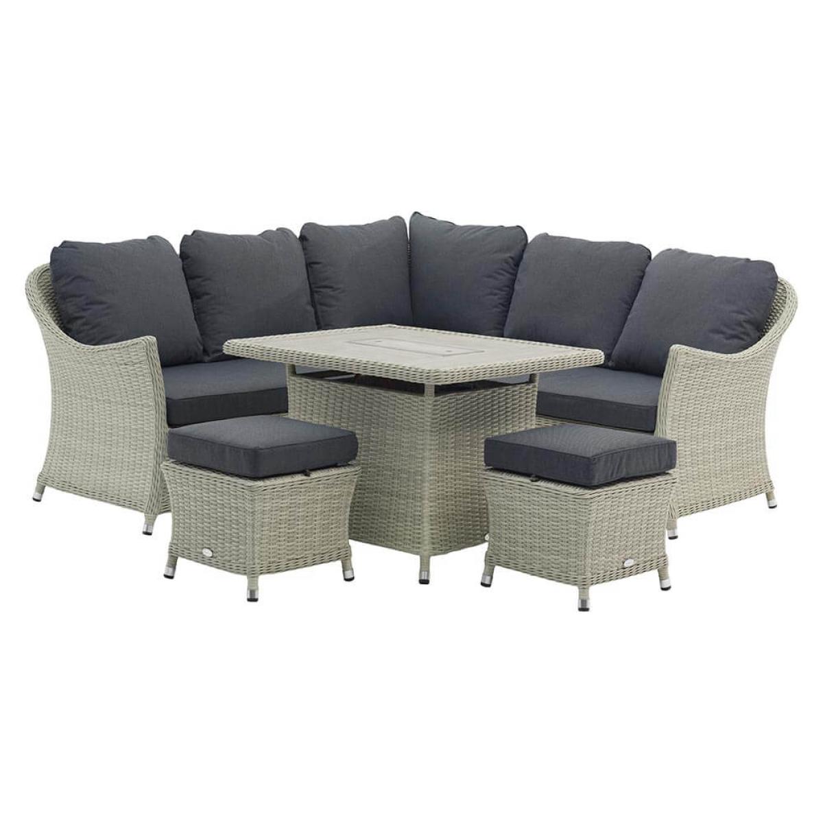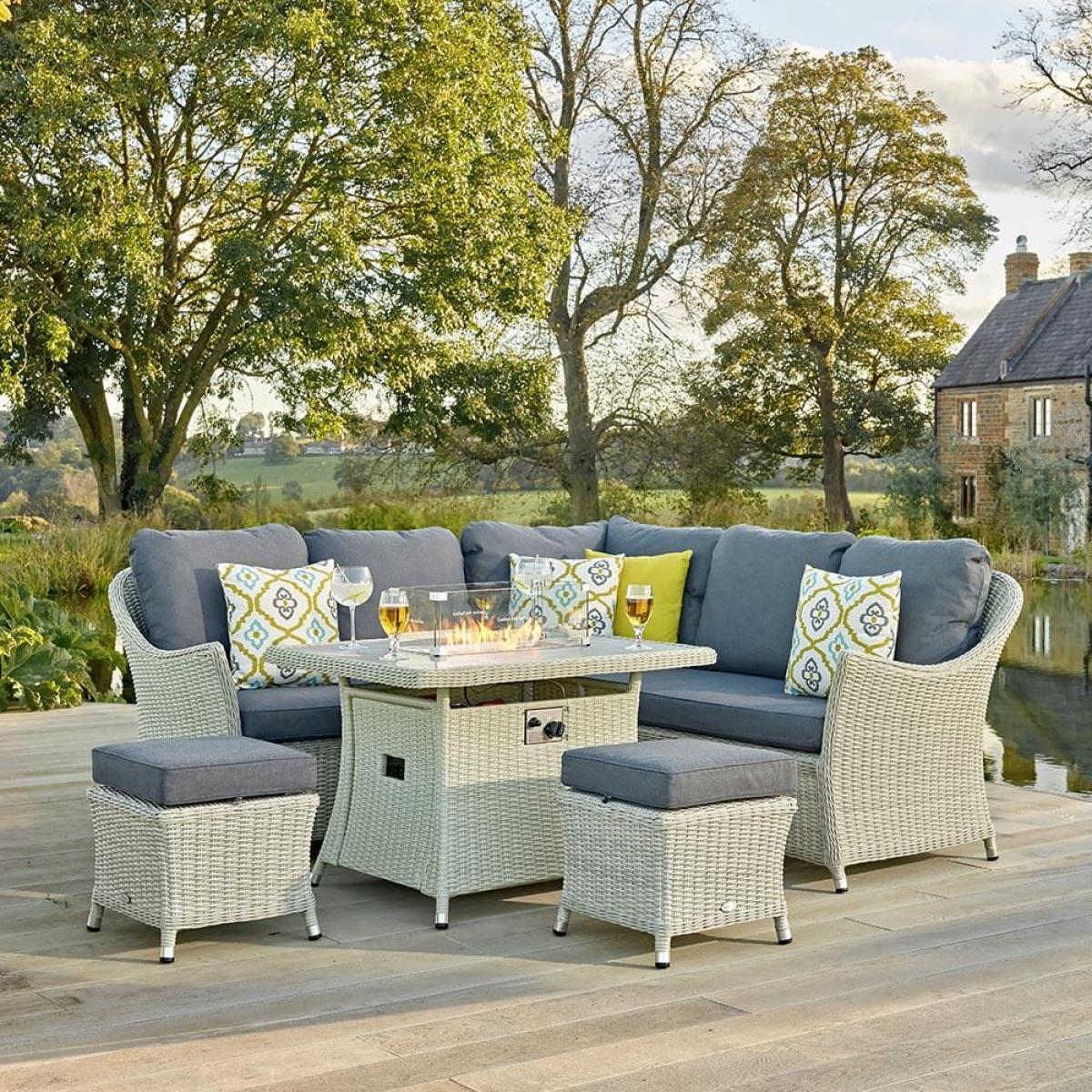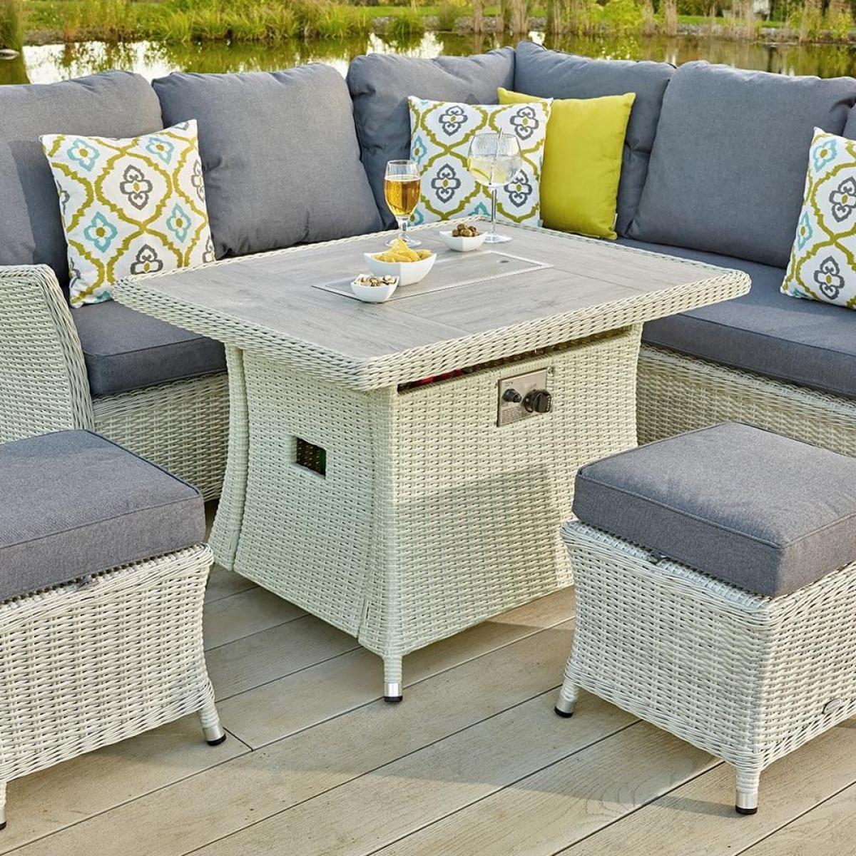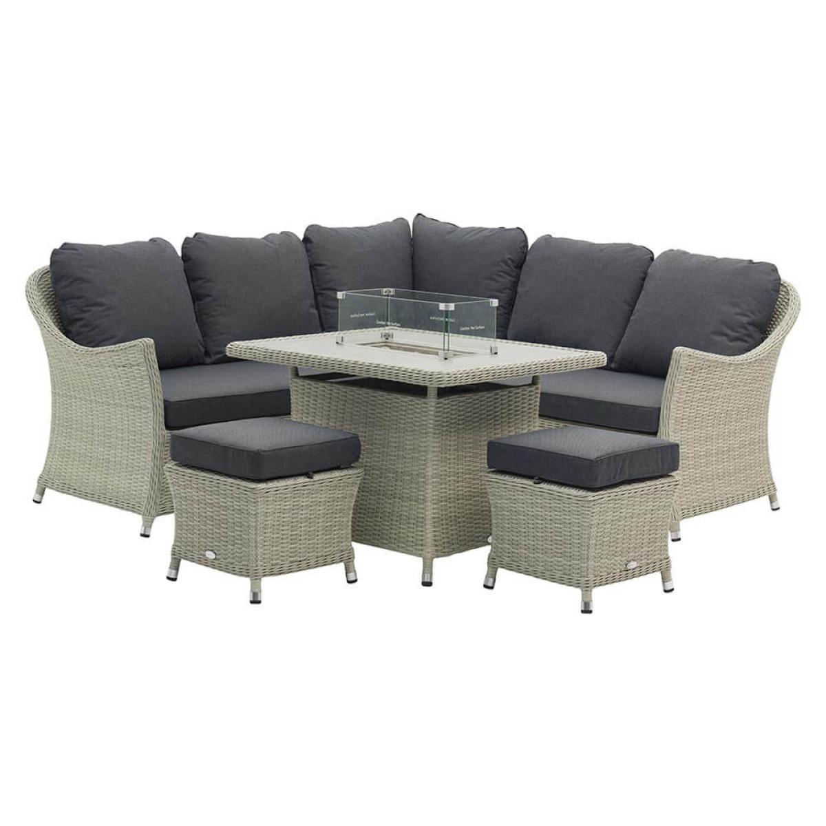 Set consists of:. About:. With the huge popularity seen for the sibling. Adjustable height table set. Of the same dimensions we thought it only right to add the exciting Bramblecrest Monterey Outdoor Sofa Set With Mini Fire Pit Dining Table to our selections for this year. This versatile and extremely good looking rattan furniture with fire pit will be a perfect addition for those with tighter outdoor spaces and for smaller areas of decking. Ideally it still seats an impressive 6 people. The Bramblecrest fire pit table is integrated into the ceramic and comes with a four panel tempered glass shield, the propane fueled ignition (tank sold separately) is operated using the turn dial on the table side. This Bramblecrest outdoor rattan garden furniture is also comprised of a curved corner sofa and two mini stools, all of which are made from lightweight synthetic rattan in a stylish dove light grey tone. This material is integrally moisture repellent so will deal with the outdoors nicely. Included are thick filled comfortable season-proof, cushions in a complementary dark grey charcoal, these cushions resist water, frost and staining. Just store the cushions indoors, or in a. Cushion storage box. , during the temperamental winter months for best care. So, when the mercury drops and the light fades this impressive compact yet accommodating set will go the distance with the fire pit element in use and guests’ glasses charged. Key features:. Further protect the integrity and finish of your set with a Bramblecrest protective cover set made from durable polyester. These have been designed to specifically fit this set, follow the link below to be take to this. Sold separately:.