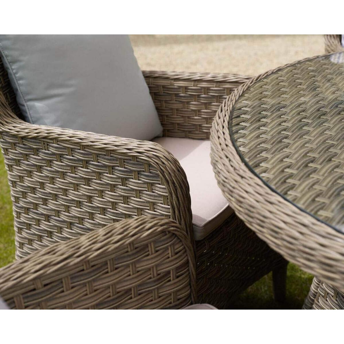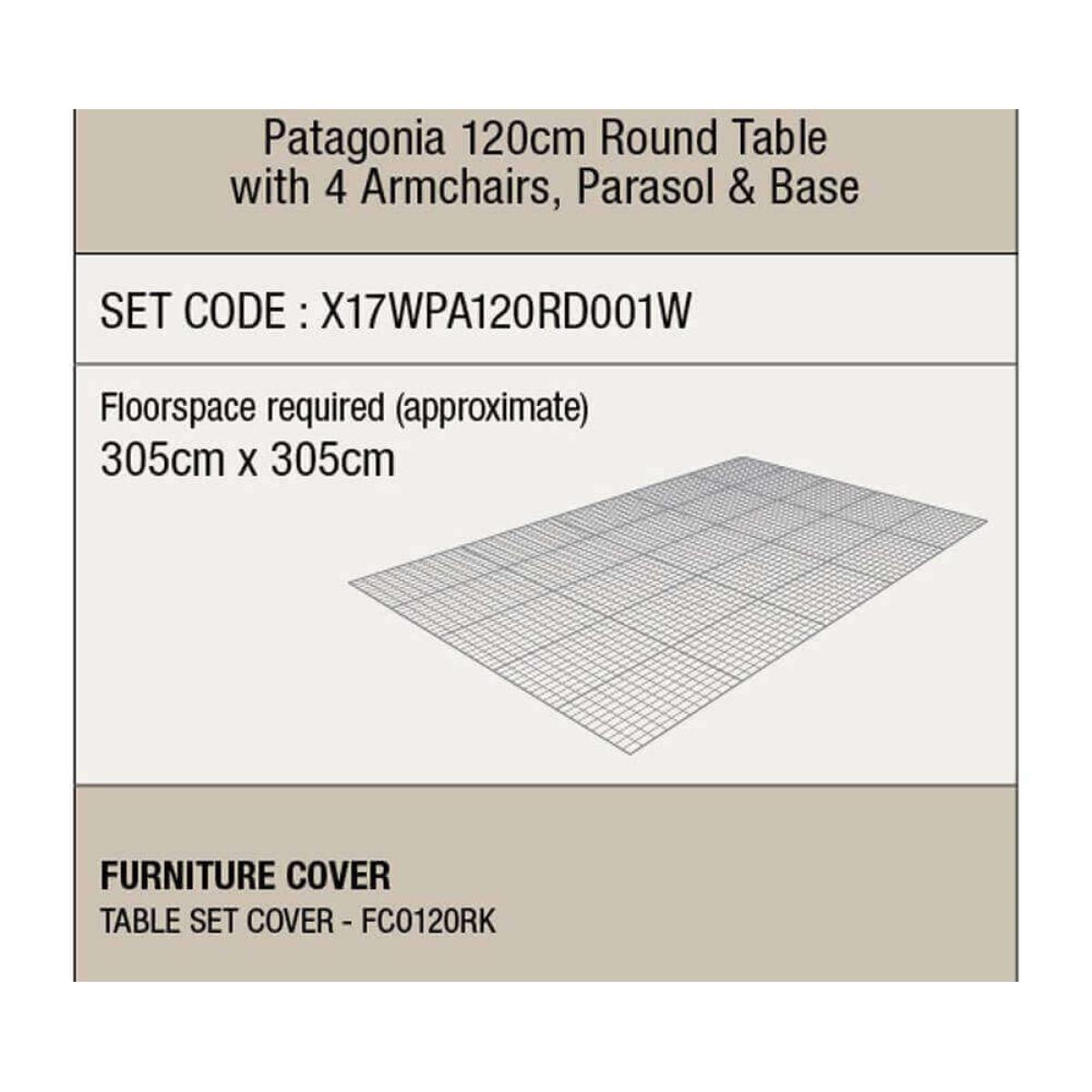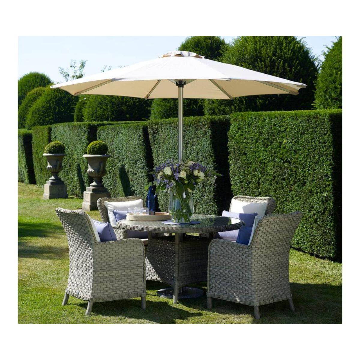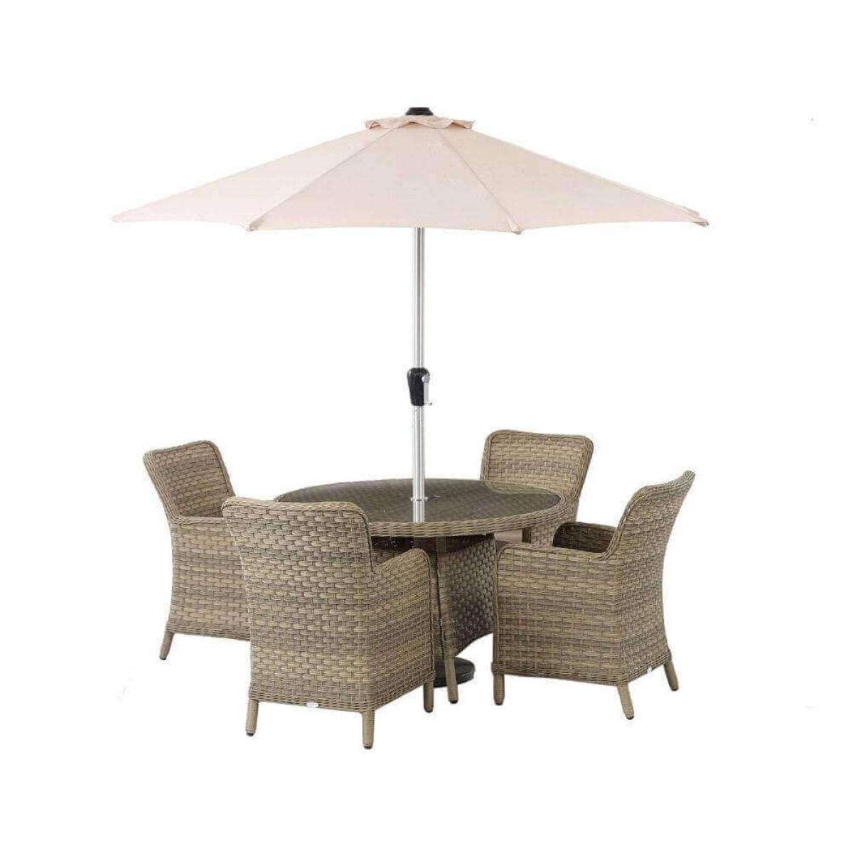 Chic in design and neat in its compactness, our Bramblecrest 120cm Round Table Set with its elegant armchairs provides all you need for an intimate gathering or family feast. And for when the sun gets too hot – or the heavens open – a parasol provides some stylish cover. This set includes:. 1 x Patagonia 120cm Round Table. 4 x Patagonia Armchair including Season-Proof Fawn Cushion. 1 x 2. 5m Round Crank Handle Parasol – Sand. 1 x 15kg Granite Base. Seating:. 4. Floor space required:. 305 x 305cm. Colour:. Willow. Primary Material:. All Weather Wicker. Secondary Material:. Powder Coated Aluminium. Assembly Required:. Yes.