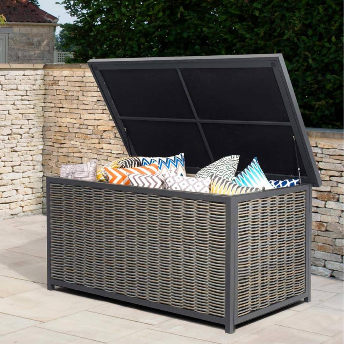 Product consists of:. About:. Keep your large garden cushions and outdoor belongings safely stored in this tasteful large aluminium garden storage box. The aluminium and rattan finish complements the entire Portofino furniture range, made of the same metal. The strut feet keeps the bottom slightly elevated from the ground, meaning any ground freeze won’t needlessly affect your contents. Whilst the climate resistant liner adds further protection, although we do still recommend using a large cushion box protective cover to add the highest protection possible against heavy and particularly cold winter weather. Garden containers are helpful additions to those that are short on space indoors or don’t have storage otherwise. Pump assisted hinges mean the lid is easy to open.