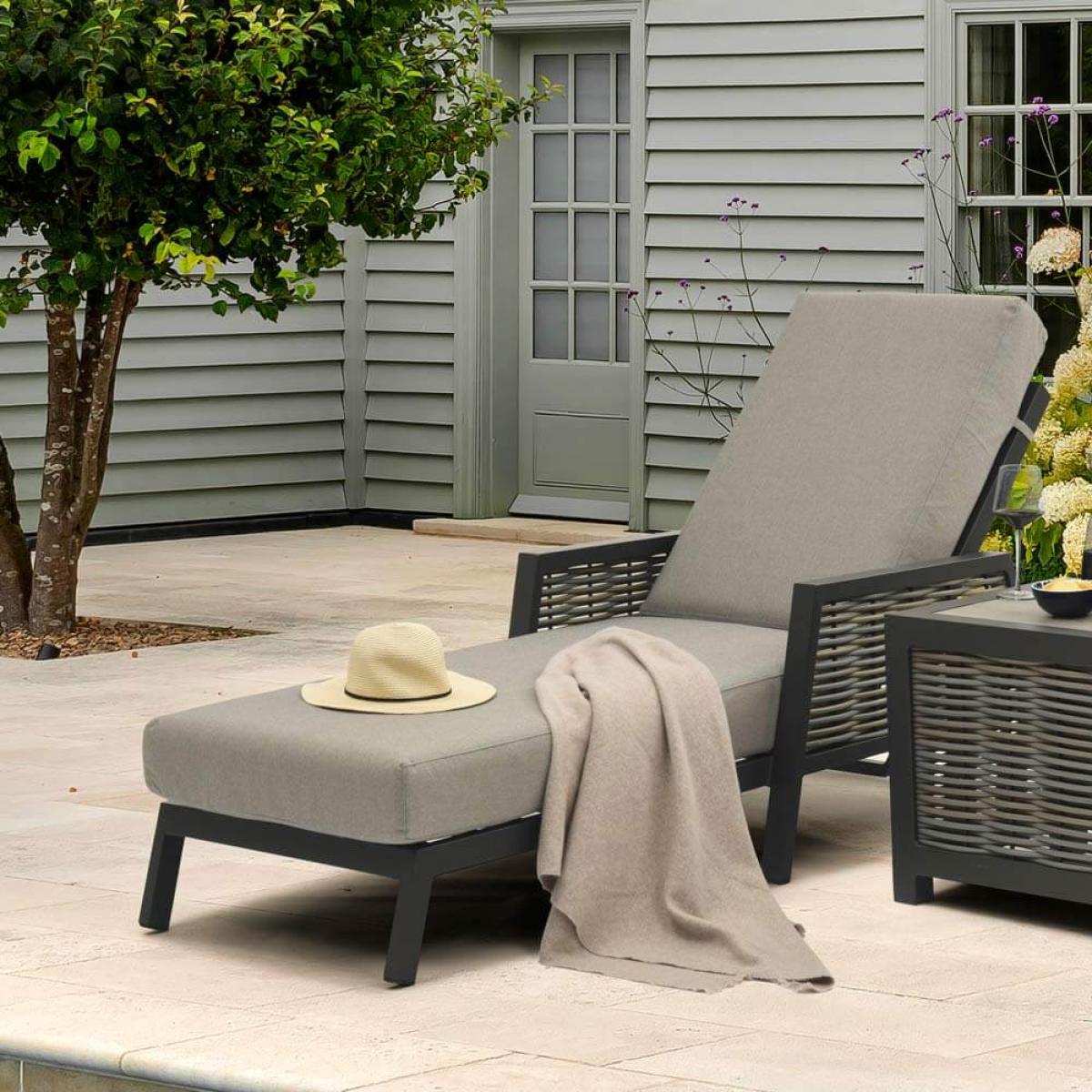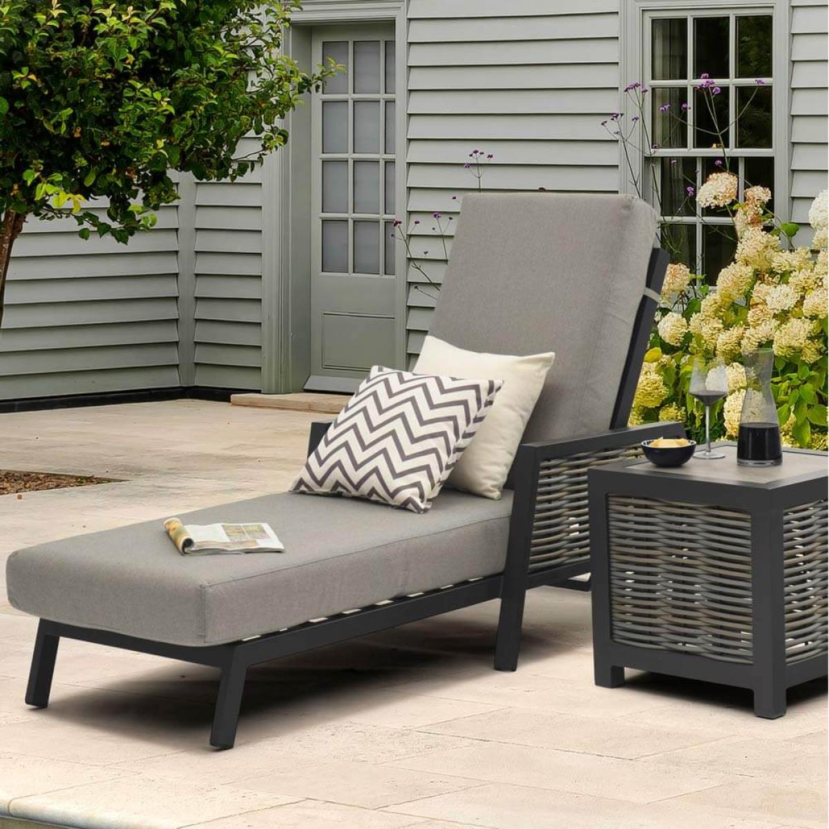 Set consists of:. Kick back, recline and absorb your outdoors properly on this chic Bramblecrest Portofino Reclining Lounger. This full length seat will soon become your nook of tranquility and the setting of time well spent unwinding. The comfortable thick filled cushion set stretches toe to head, whilst the reclining function goes three ways so splaying out on your terms is firmly on the agenda. Theses cushions are season-proof so if caught in a shower will deflect light rain or flash downpours, even frost. We do just recommend storing these indoors during the winter months for best care. The lounger is made from both powder coated aluminium in a dark attractive anthracite tone and panels of mushroom brown rattan synthetic wicker. Modern, stylish and practical; it won’t ever succumb to rust, and the wicker is integrally repellent against moisture. Place this contemporary minded lounger on patios, decking or lawns. Key Features:. Further protect the integrity and finish of your aluminium set with a Bramblecrest protective cover set that has been designed to specifically fit this lounger, follow the link below to be take to this. Sold separately:. Bramblecrest Portofino & La Rochelle Lounger Protective Cover.
