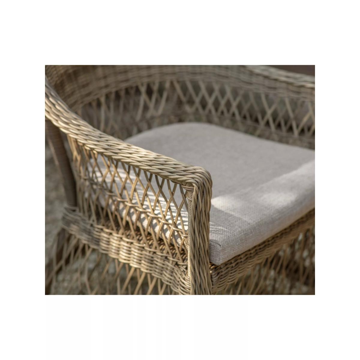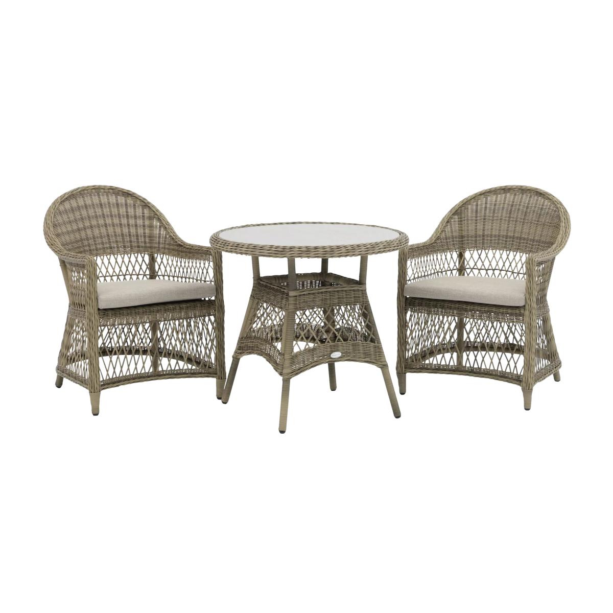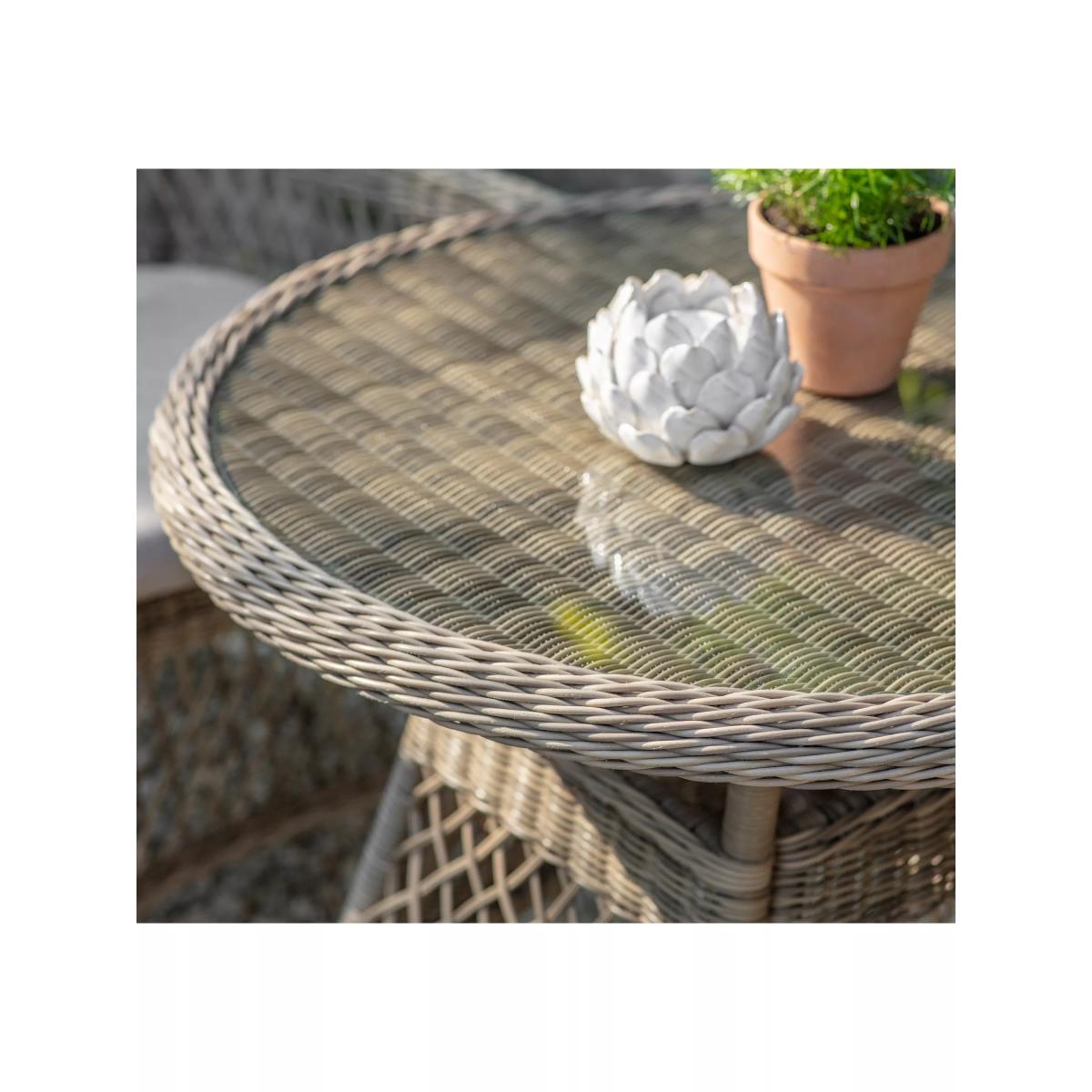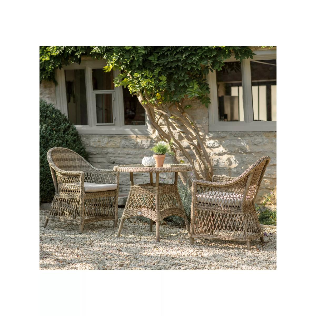 The Rosemoor range is part of an exclusive collection by Bramblecrest and the RHS. Featuring a distinctive open-weave design and skirted chairs, this two-seater bistro dining set creates a traditional look with all the benefits of modern weather-resistant materials. Key features: Round garden bistro table Practical, recessed glass tabletop Two curved open-weave dining chairs with lightweight aluminium frames and low-maintenance outdoor rattan in Latte Season-proof, UV-resistant Eco seat cushions in Eco Rye, made from recycled plastic bottles Can be left outside all season with minimal maintenance (excluding cushions)
