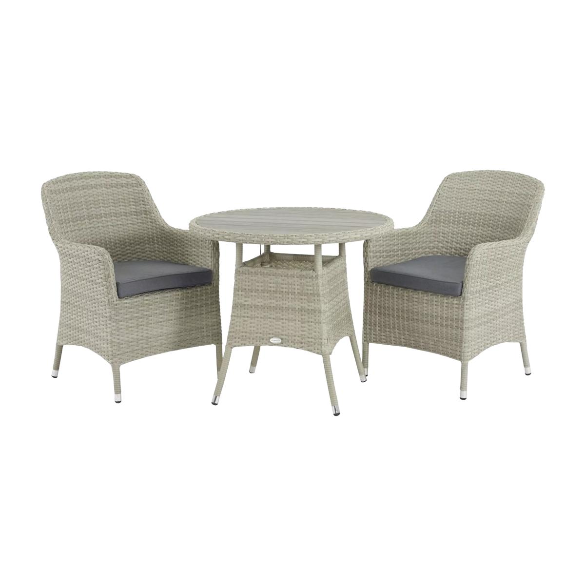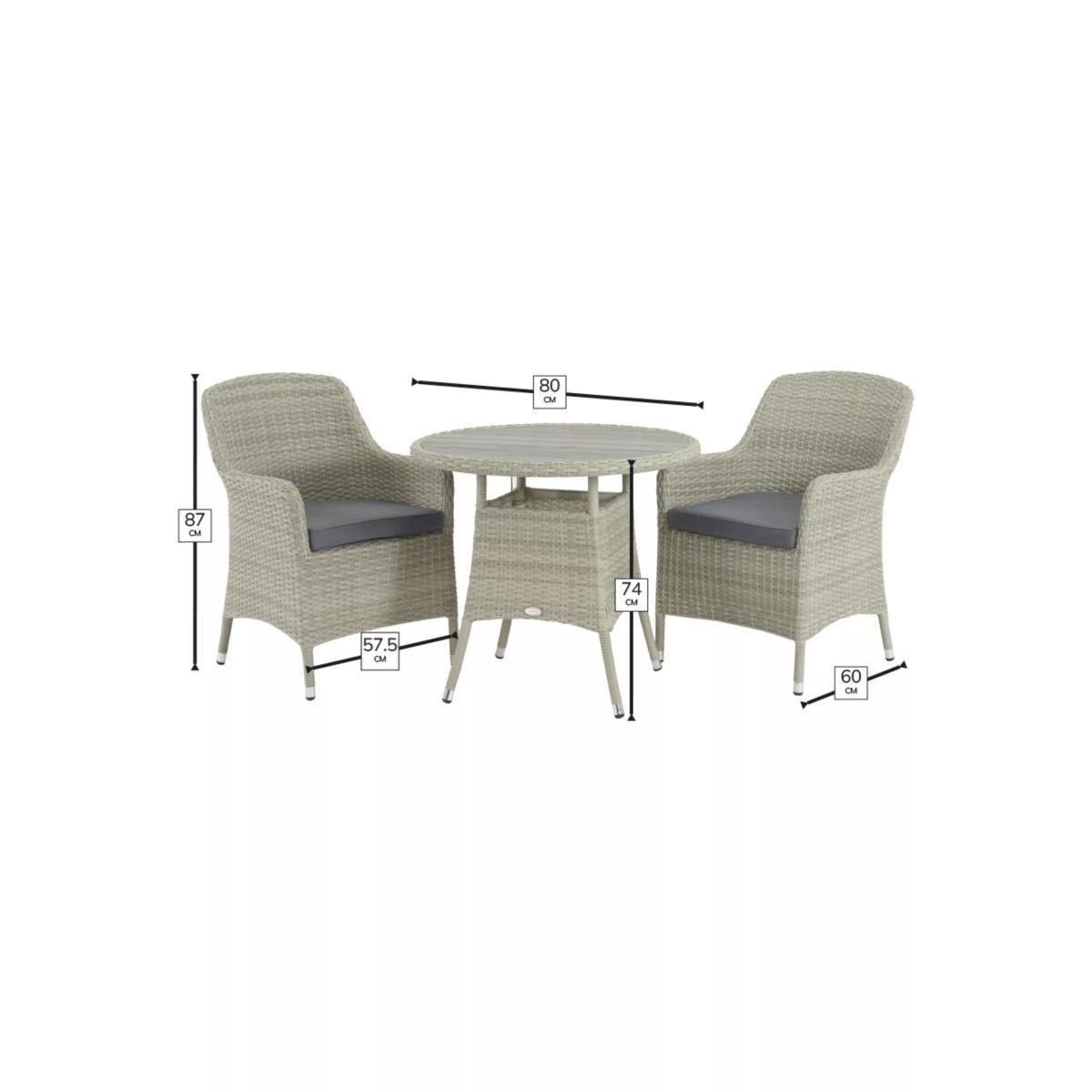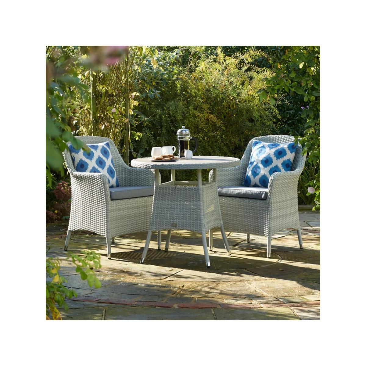 A table for two, outdoors? This bistro table set with its classic-style armchairs fits the bill. The bistro table, with its wood-effect top, features eye-catching skirting, and the two dining chairs have gently rounded seat backs and arms. With its neat proportions and durable, lightweight weave, this small-scale set will complement any setting, indoors or out. The classic design of Bramblecrest's Tetbury range features seat cushions made from the brand's innovative Eco fabric, spun from recycled plastic bottles. The soft-touch cushions retain the hardwearing, season-proof quality synonymous with Bramblecrest's outdoor fabrics. The all-weather rattan is built on aluminium frames, so the furniture is lightweight, strong and rust-free. Key features: Round garden bistro table with wood-effect top Two all-weather, maintenance-free outdoor rattan armchairs with lightweight, rust-free aluminium frames Season-proof Eco seat cushions are water, UV and stain resistant Frost resistant and UV-resistant Made with recyclable materials Care information Coasters and placemats should be used with the tabletop. In certain conditions, sunlight can be magnified via drinks glasses, resulting in scorch marks Remove surface dirt using warm water or a hose and a non-abrasive scrubbing brush or sponge. Jet-spraying may damage the painted finish or rattan Remove spillages on cushions immediately using an absorbent sponge or cloth. For stubborn stains, hand wash at 30°C using a household stain remover Do not machine wash season-proof cushions or cushion covers, as this may cause damage to the water-resistant lining All Bramblecrest cushions are season-proof and are lined with a plastic membrane designed to prevent water ingress Cushions can remain outside during light showers and need to be stored during prolonged periods of non-use