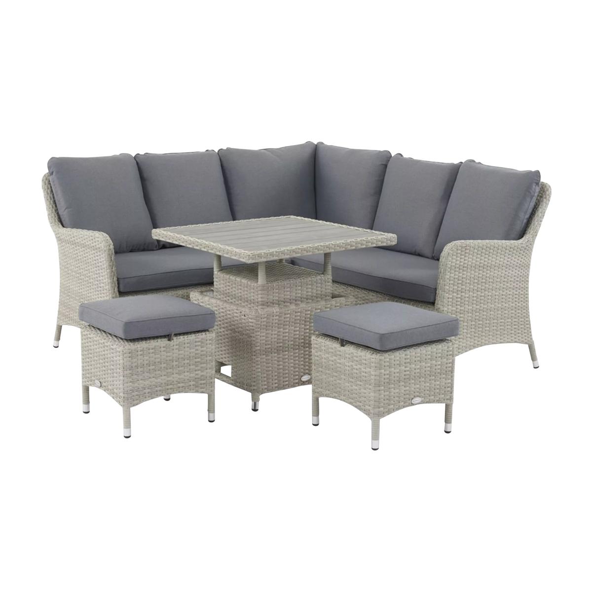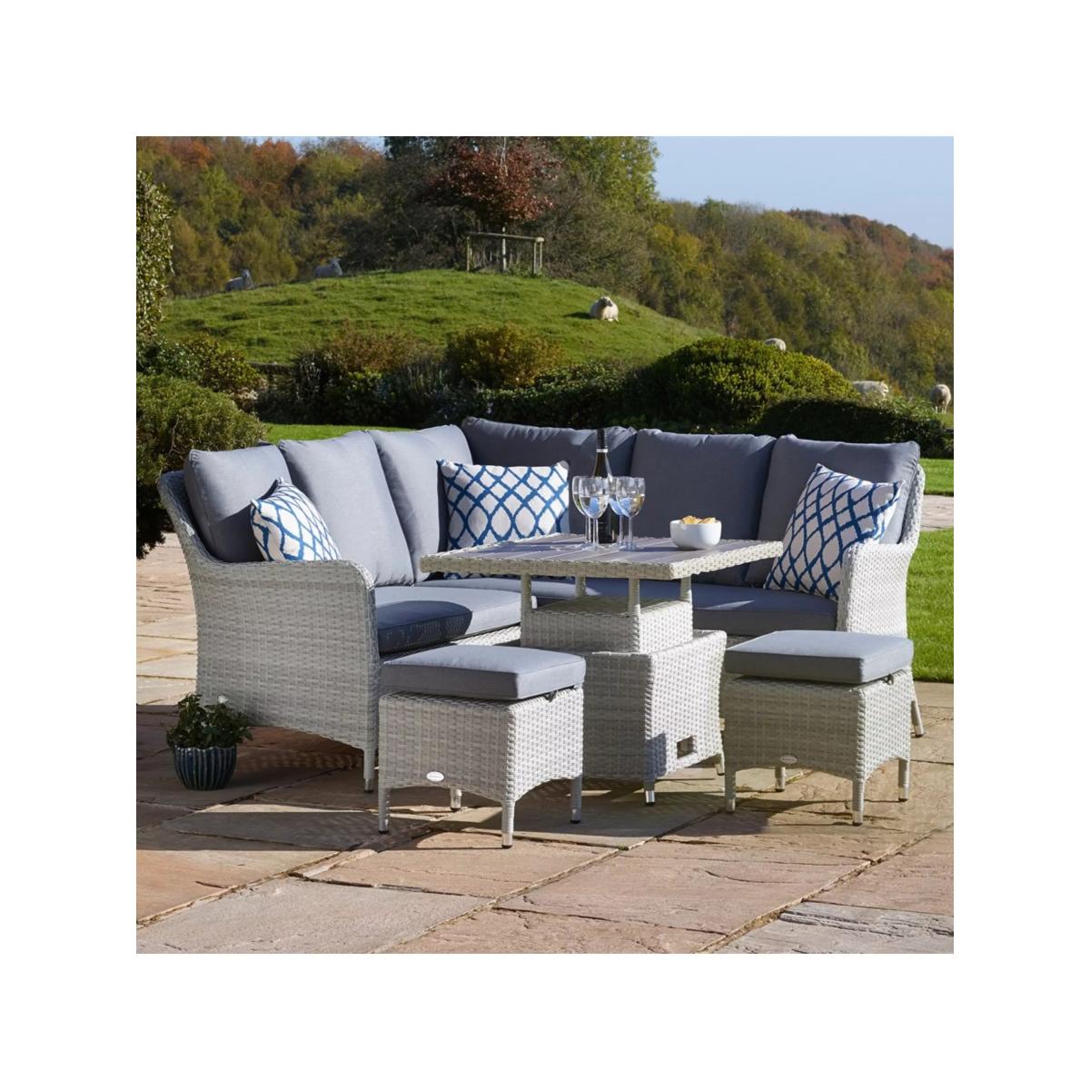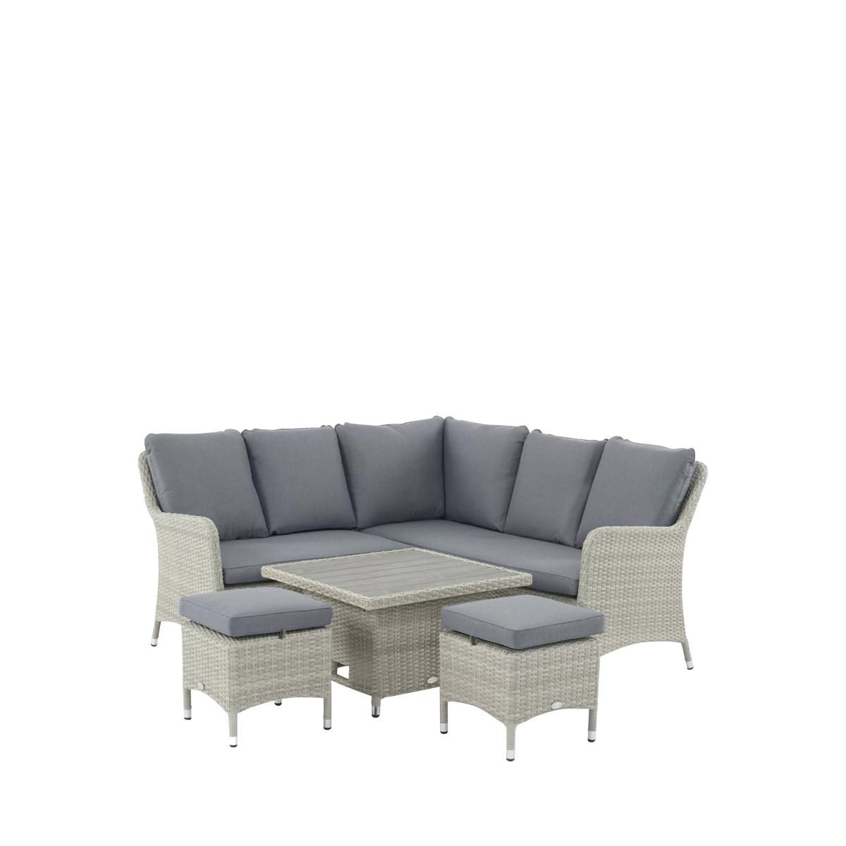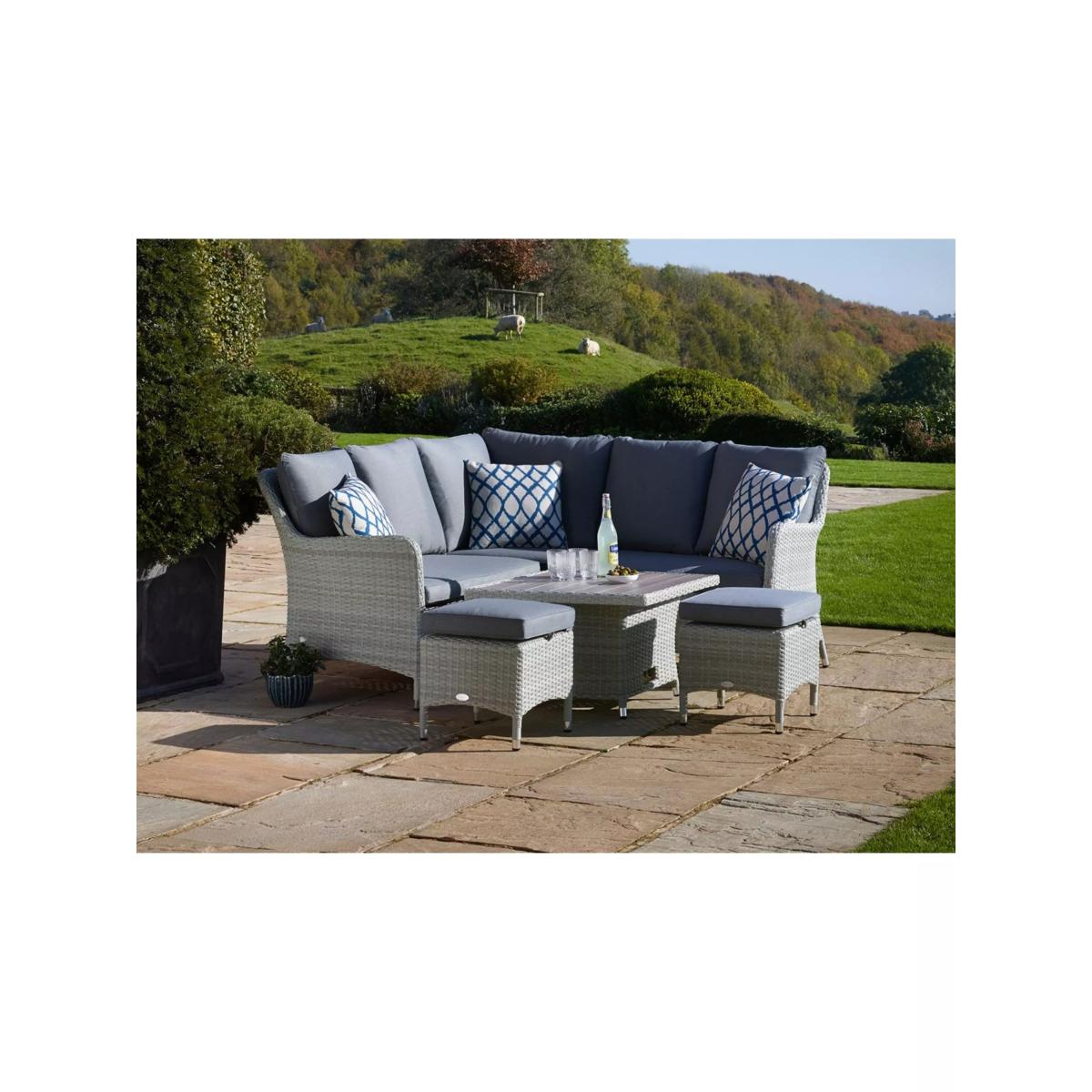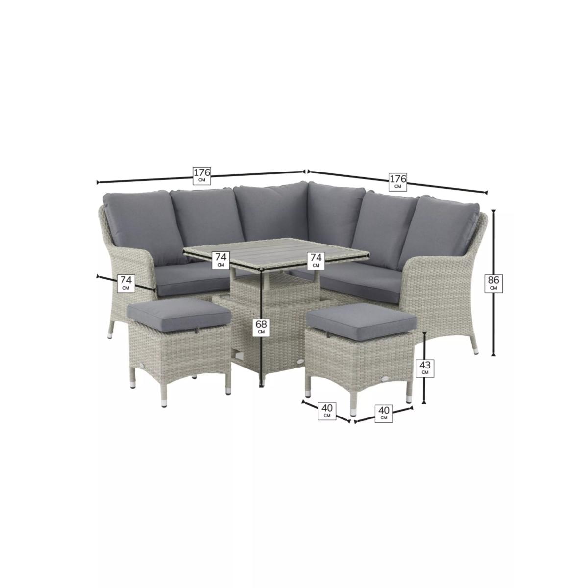 Supreme comfort and clever craftsmanship combine to form this corner-hugging sofa set. Great for small spaces, the versatile dual-height table, with its wood-effect top, can move from cocktail height to dining height in an instant. Two handy padded stools complete the set and can be tucked away when not in use. The classic design of Bramblecrest's Tetbury range features seat cushions made from the brand's innovative Eco fabric, spun from recycled plastic bottles. The soft-touch cushions retain the hardwearing, season-proof quality synonymous with their outdoor fabrics. The all-weather rattan is built on aluminium frames, so the furniture is lightweight, strong and rust-free. Key features: Multi-purpose, dual-height square table with wood-effect top Two-seater corner sofa and two footstools All-weather, maintenance-free outdoor rattan on lightweight, rust-free aluminium frames Season-proof Eco cushions are water, UV and stain resistant Frost resistant and UV-resistant Made with recyclable materials Care information Coasters and placemats should be used with the tabletop. In certain conditions, sunlight can be magnified via drinks glasses, resulting in scorch marks Remove surface dirt using warm water or a hose and a non-abrasive scrubbing brush or sponge. Jet-spraying may damage the painted finish or rattan Remove spillages on cushions immediately using an absorbent sponge or cloth. For stubborn stains, hand wash at 30°C using a household stain remover Do not machine wash season-proof cushions or cushion covers, as this may cause damage to the water-resistant lining All Bramblecrest cushions are season-proof and are lined with a plastic membrane designed to prevent water ingress Cushions can remain outside during light showers and need to be stored during prolonged periods of non-use