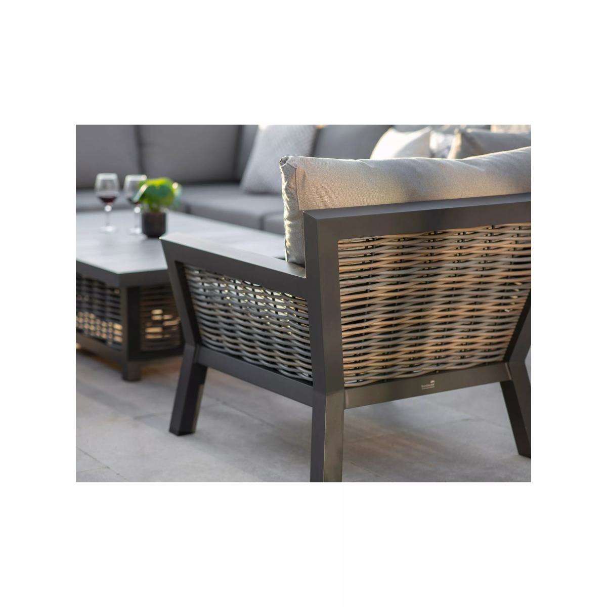 A corner-hugging Tuscan L-shaped sofa set featuring a piston-adjustable table which transforms in height to suit all your outdoor dining needs. From brunches to lunches to after-dinner drinks with friends, easily adjust your table from high to low in an instant with the press of a lever. Made from all-weather outdoor rattan, modular seating includes a corner four-seater sofa, one double bench and a single deep armchair, all with season-proof cushions. Key features: Piston-operated square table requires just one person to higher or lower Frost-resistant, recessed ceramic tabletop 4-seater corner sofa, a double benches and single armchair All-weather outdoor rattan in a Mushroom tone Lightweight, rust-free, powder-coated aluminium frames in Anthracite Season-proof Eco cushion covers in Cobble made using recycled plastic bottles Can be left outside all season with minimal maintenance (excluding cushions) Made with recyclable materials Care Information Furniture — Remove surface dirt using warm water or a hose and a non-abrasive scrubbing brush or sponge. Avoid using a jet spray as it may damage the painted finish or rattan. Cushions — Remove spillages immediately using an absorbent sponge or cloth. For stubborn stains, hand wash at 30°C using a household stain remover. Do not machine wash season-proof cushions or cushion covers, as this may cause damage to the water-resistant lining. All Bramblecrest cushions are season-proof and are lined with a plastic membrane designed to prevent water ingress. They can remain outside during light showers and need to be stored during prolonged periods of non-use.