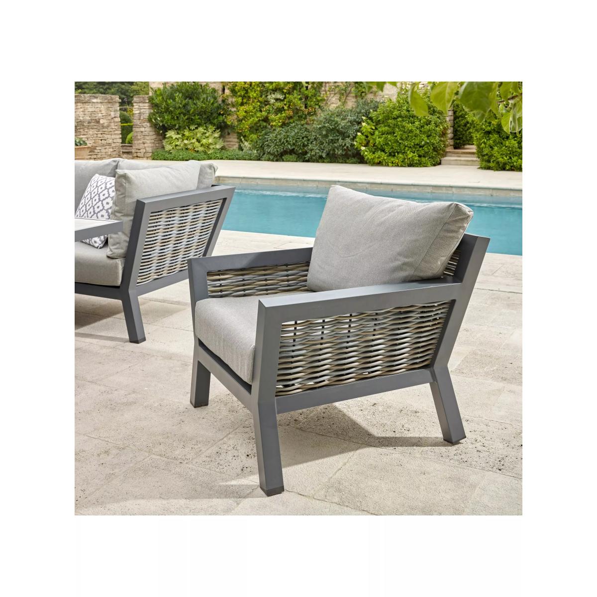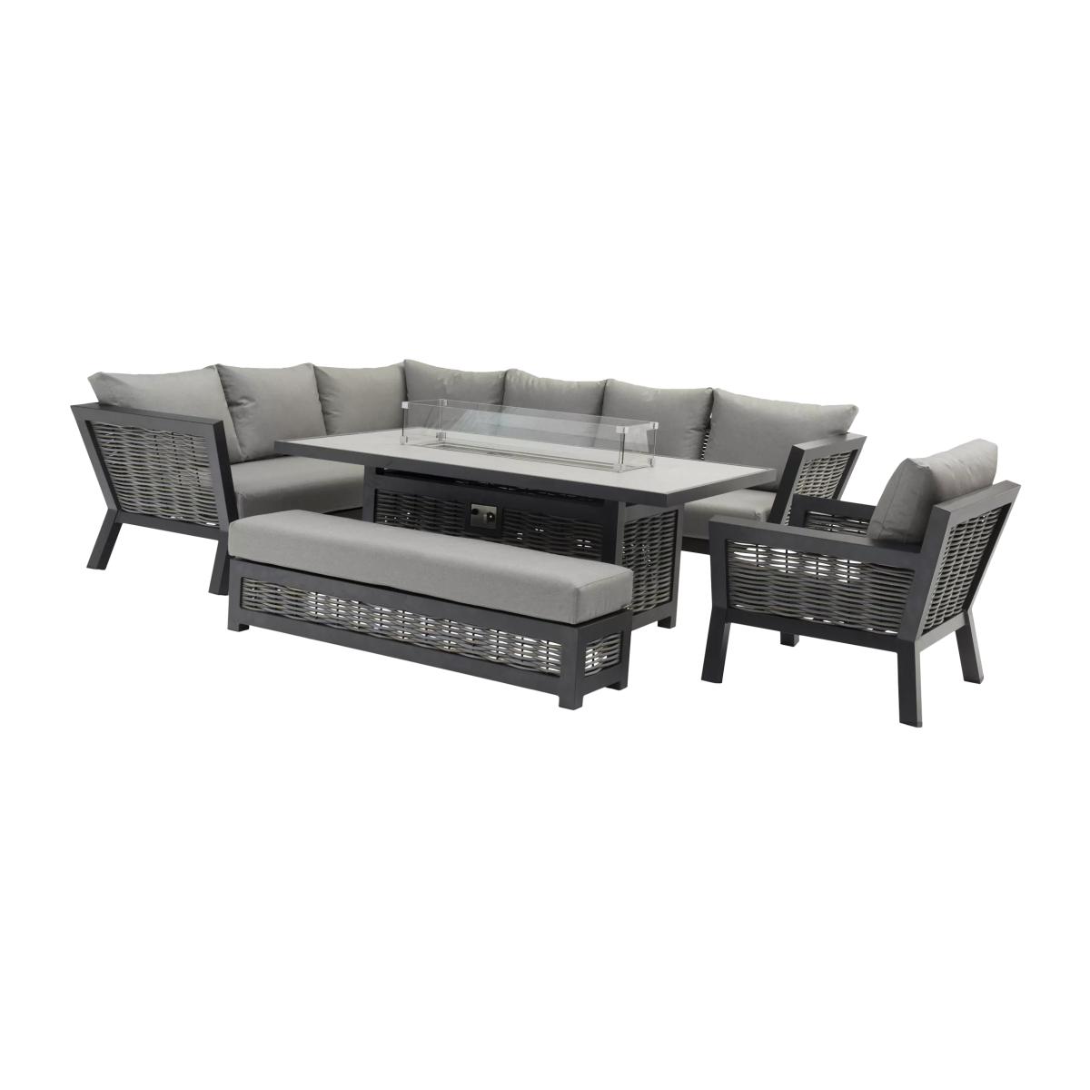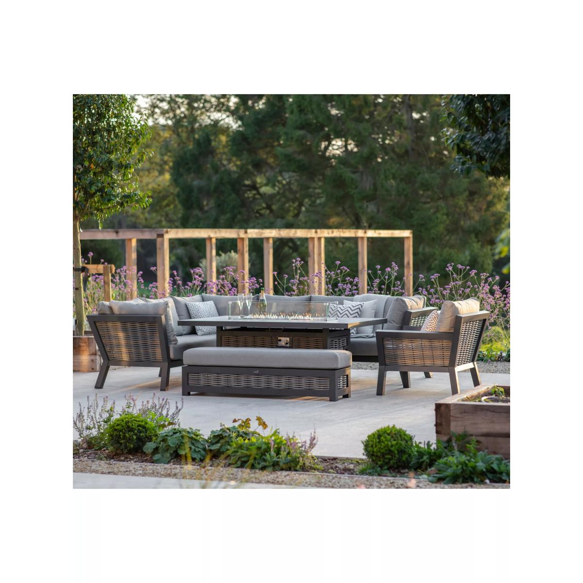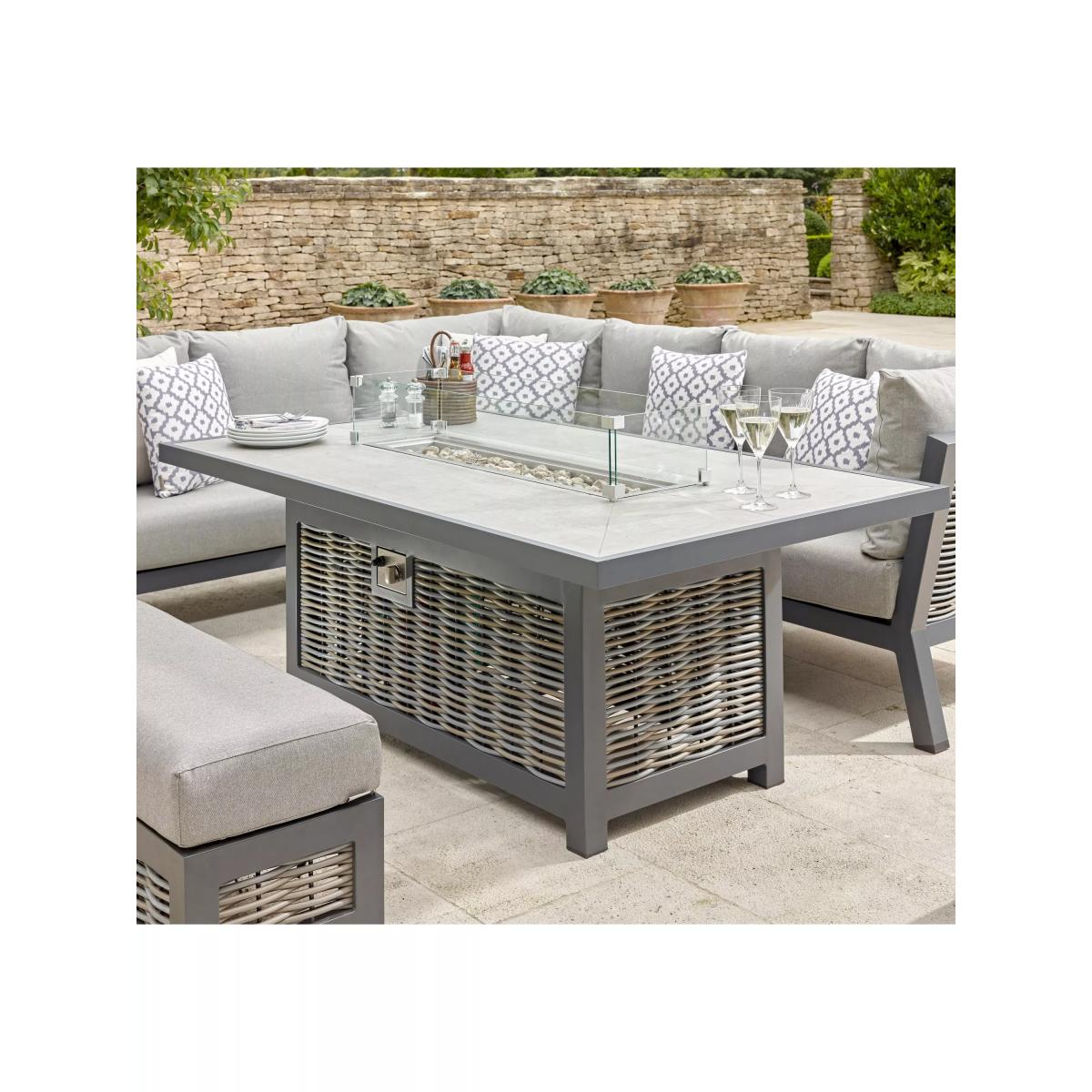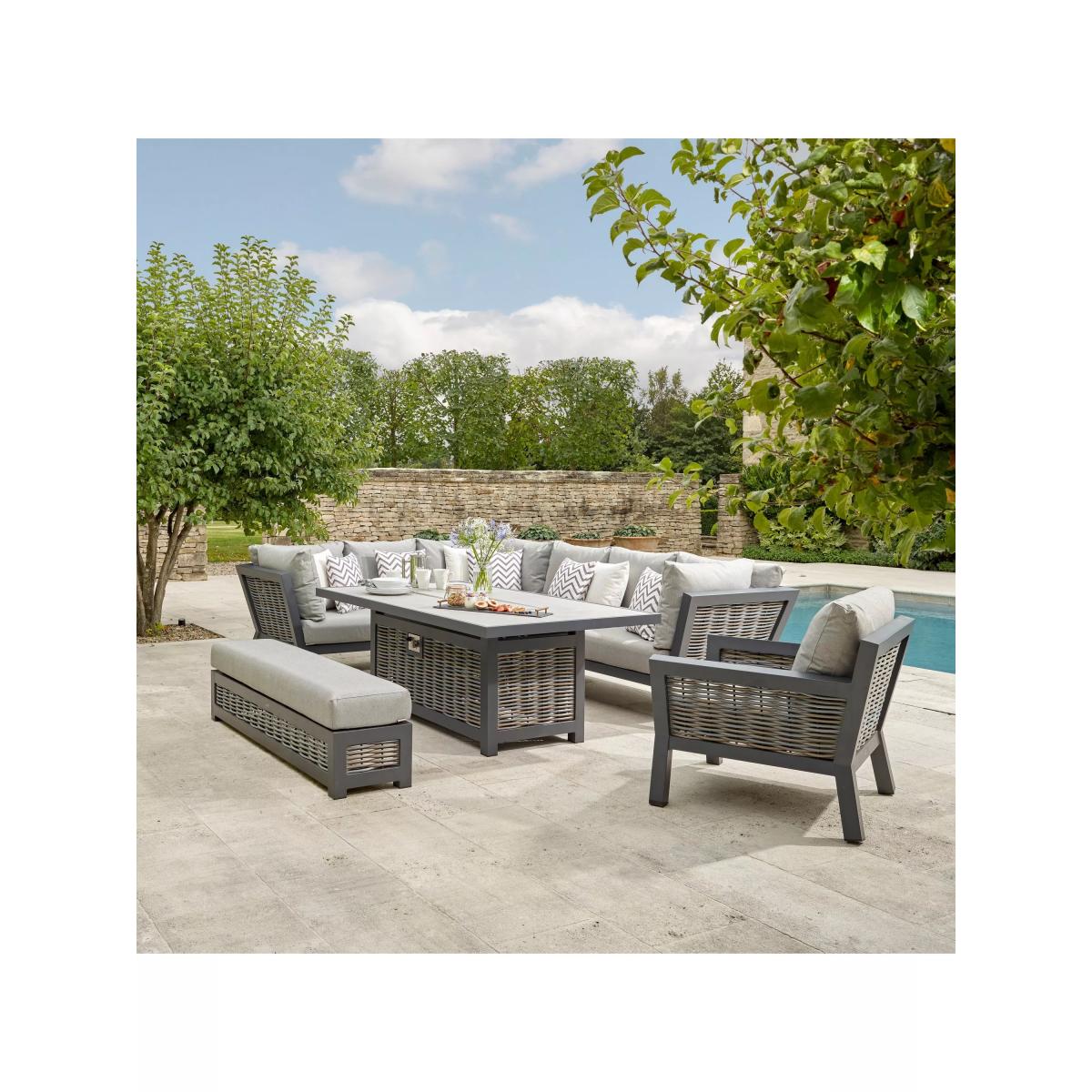 Keep outdoor entertaining going late into the evening and through the seasons with this large L-shaped Tuscan sofa set. Transform the dining table into a firepit, and ensure you and your guests are warm enough to linger outdoors for longer. Made from all-weather outdoor rattan, seating includes an L-shaped five-seater sofa, one lounge chair and one double bench, all with season-proof cushions. Key features: Rectangular garden dining table with a frost-resistant, recessed ceramic tabletop Ceramic tile insert transforms the tabletop into a firepit Adjustable temperature control 5-seater L-shaped sofa set Garden lounge chair and one double bench All-weather outdoor rattan in a Mushroom tone Lightweight, rust-free, powder-coated aluminium frames in Anthracite Season-proof Eco cushion covers in Cobble made using recycled plastic bottles Can be left outside all season with minimal maintenance (excluding cushions) Made with recyclable materials