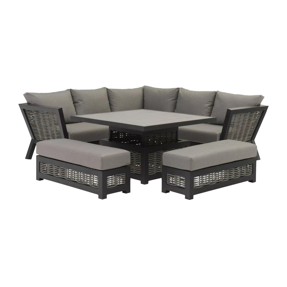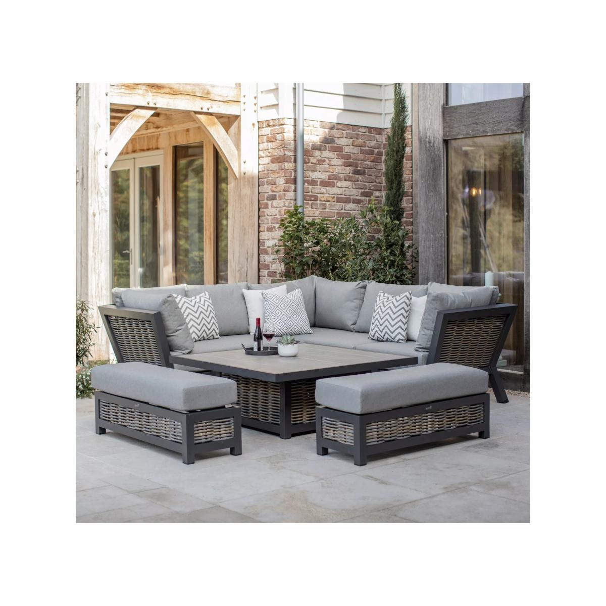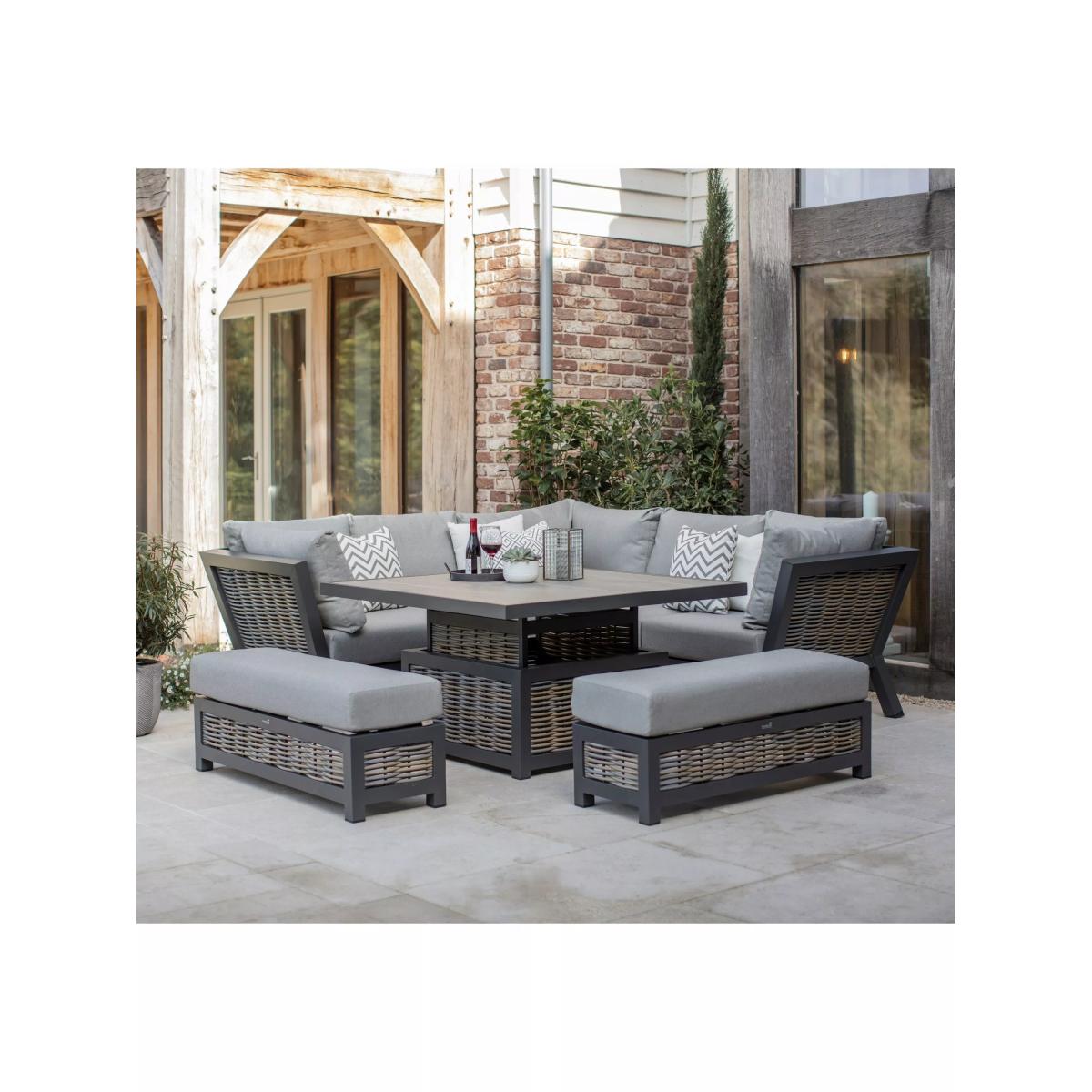 A corner-hugging Tuscan square sofa set featuring a piston-adjustable table which transforms in height to suit all your outdoor dining needs. From brunches to lunches to after dinner drinks with friends, easily adjust your table from high to low, in an instant with the press of a lever. Made from all-weather outdoor rattan, seating includes a corner four-seater sofa and two double benches, all with season-proof cushions. Key features: Piston-operated square table, requires just one person to higher or lower Frost-resistant, recessed ceramic tabletop 4-seater corner sofa and two double benches All-weather outdoor rattan in a Mushroom tone Lightweight, rust-free, powder-coated aluminium frames in Anthracite Season-proof Eco cushion covers in Cobble made using recycled plastic bottles Can be left outside all season with minimal maintenance (excluding cushions) Made with recyclable materials Care Information Furniture — Remove surface dirt using warm water or a hose and a non-abrasive scrubbing brush or sponge. Avoid using a jet spray as it may damage the painted finish or rattan. Cushions — Remove spillages immediately using an absorbent sponge or cloth. For stubborn stains, hand wash at 30°C using a household stain remover. Do not machine wash season-proof cushions or cushion covers, as this may cause damage to the water-resistant lining. All Bramblecrest cushions are season-proof and are lined with a plastic membrane designed to prevent water ingress. They can remain outside during light showers and need to be stored during prolonged periods of non-use.