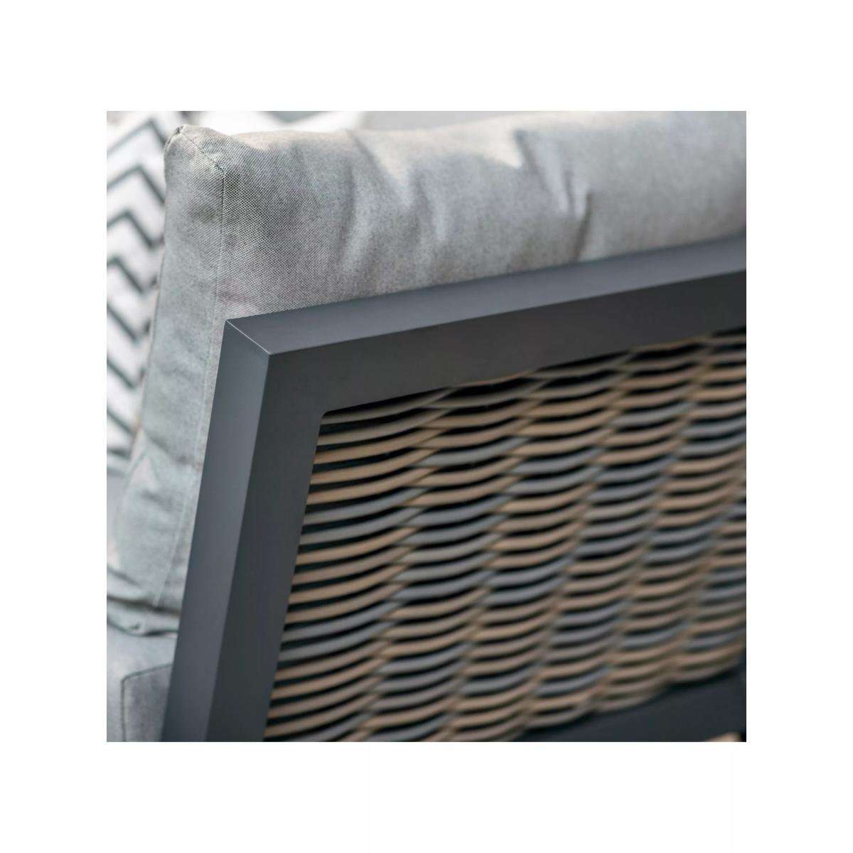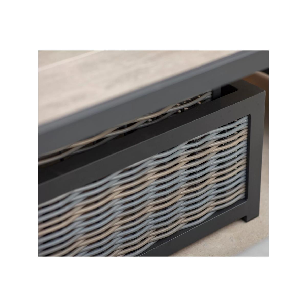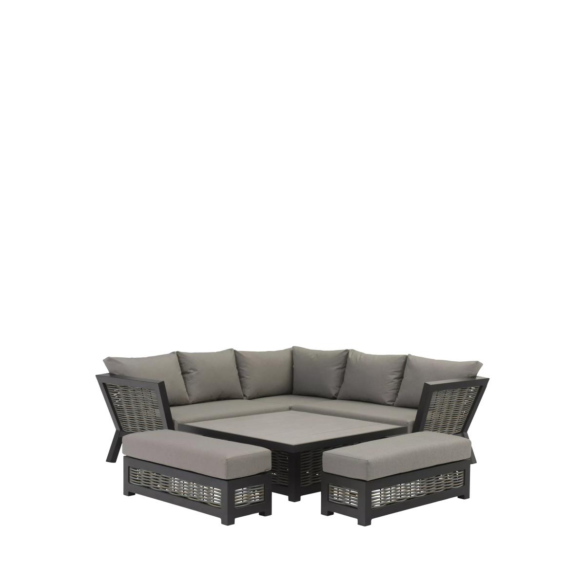 A corner-hugging Tuscan square sofa set featuring a piston-adjustable table which transforms in height to suit all your outdoor dining needs. From brunches to lunches to after dinner drinks with friends, easily adjust your table from high to low, in an instant with the press of a lever. Made from all-weather outdoor rattan, seating includes a corner four-seater sofa and two double benches, all with season-proof cushions. Key features: Piston-operated square table, requires just one person to higher or lower Frost-resistant, recessed ceramic tabletop 4-seater corner sofa and two double benches All-weather outdoor rattan in a Mushroom tone Lightweight, rust-free, powder-coated aluminium frames in Anthracite Season-proof Eco cushion covers in Cobble made using recycled plastic bottles Can be left outside all season with minimal maintenance (excluding cushions) Made with recyclable materials Care Information Furniture — Remove surface dirt using warm water or a hose and a non-abrasive scrubbing brush or sponge. Avoid using a jet spray as it may damage the painted finish or rattan. Cushions — Remove spillages immediately using an absorbent sponge or cloth. For stubborn stains, hand wash at 30°C using a household stain remover. Do not machine wash season-proof cushions or cushion covers, as this may cause damage to the water-resistant lining. All Bramblecrest cushions are season-proof and are lined with a plastic membrane designed to prevent water ingress. They can remain outside during light showers and need to be stored during prolonged periods of non-use.