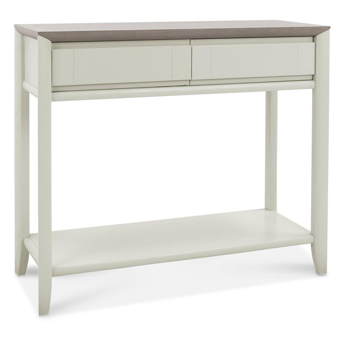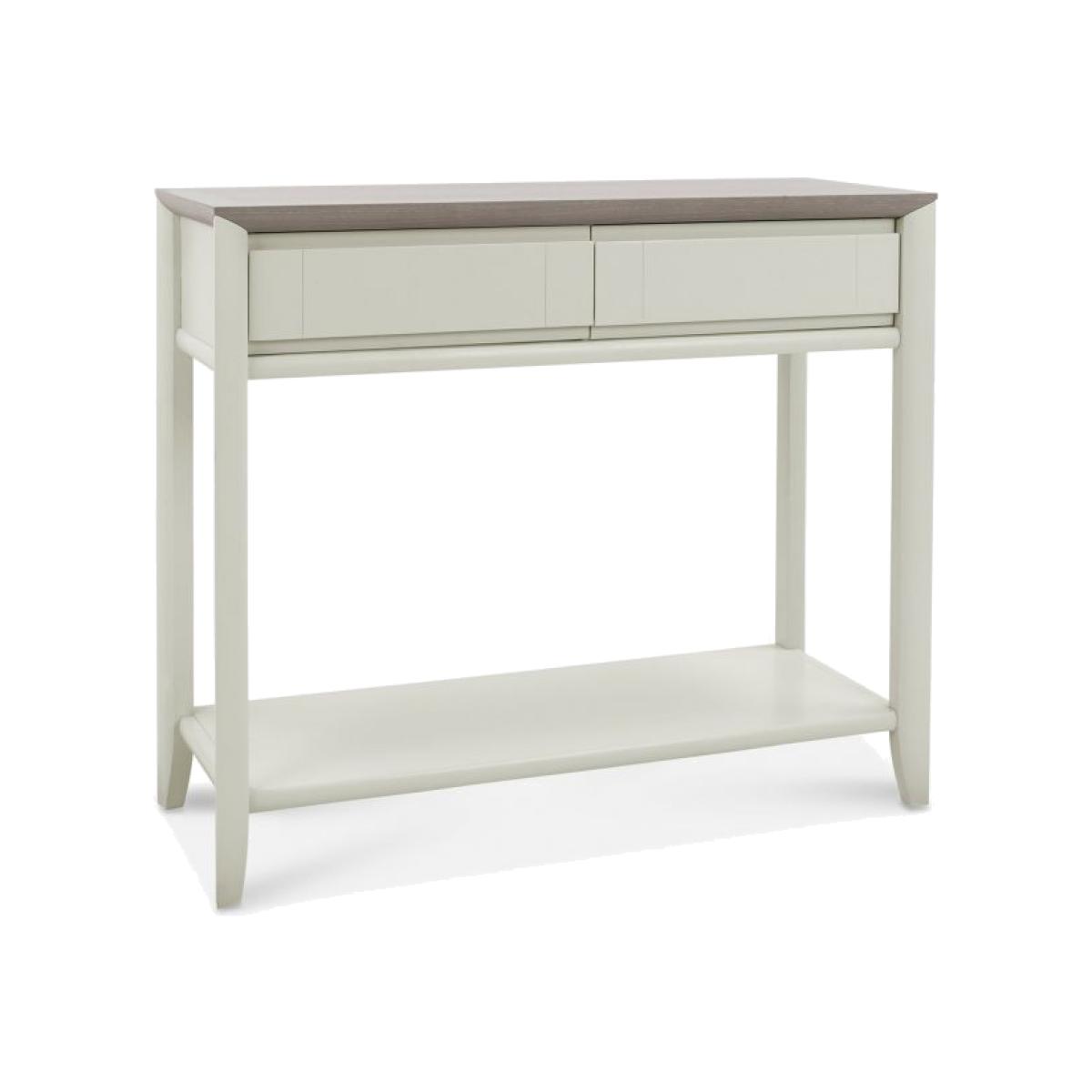 Brampton is a strikingly contemporary, modular-based collection of dining, living room & home office furniture that offers flexibility and practicality in tune with today's lifestyles.  The Brampton console table with draws offers a contemporary and simple Scandinavian style. Washed, grey oak tops offset the grey paint perfectly. This item features 2 drawers on soft-close Blum runners and a practical shelf to store beautiful accessories for your home.  Assembly required - all instructions, tools, and fittings provided. Product dimensions: Height:79cm, Width:92cm, Depth:36cm.