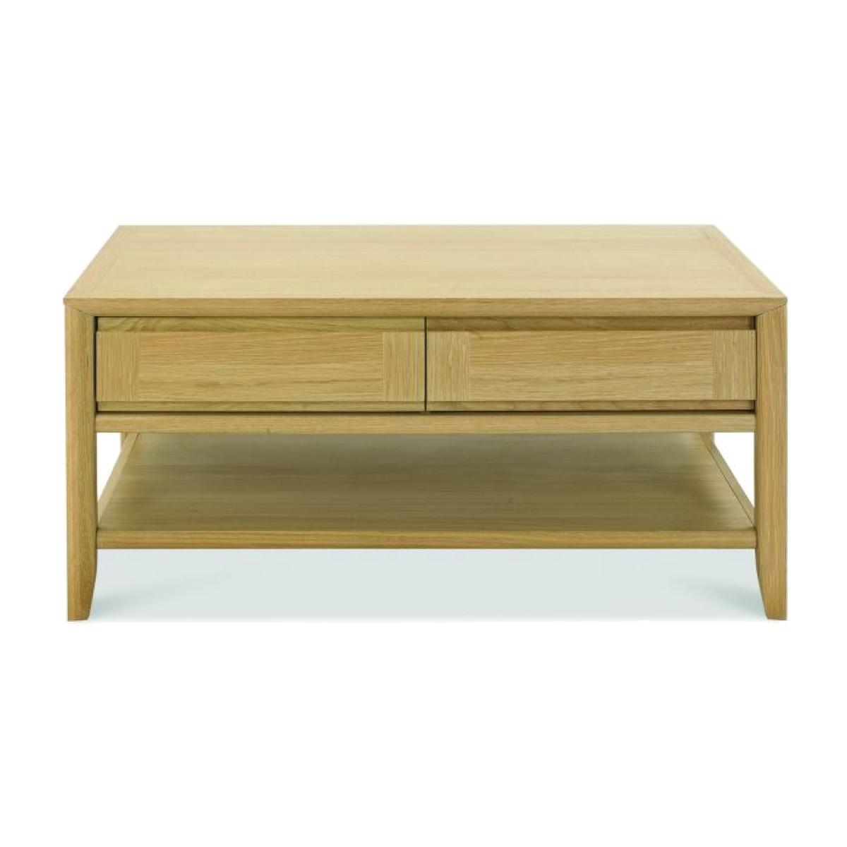 I’m a fan of this oak coffee table because its clean lines and light wood tone slot effortlessly into Scandi, coastal or contemporary living rooms. The discreet drawers keep remotes and coasters hidden away, while the lower shelf is perfect for coffee-table books or neatly stacked magazines. To style it, start with a simple tray to group a candle, a small vase and perhaps a decorative object. Balance the look by placing a low plant or a couple of art books on the shelf below. Keep accessories minimal so the warmth of the wood remains the focal point.