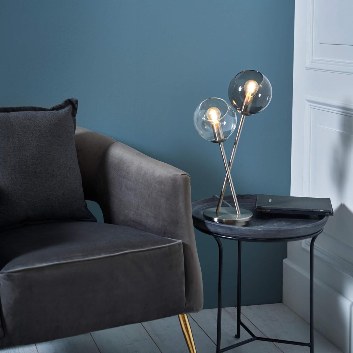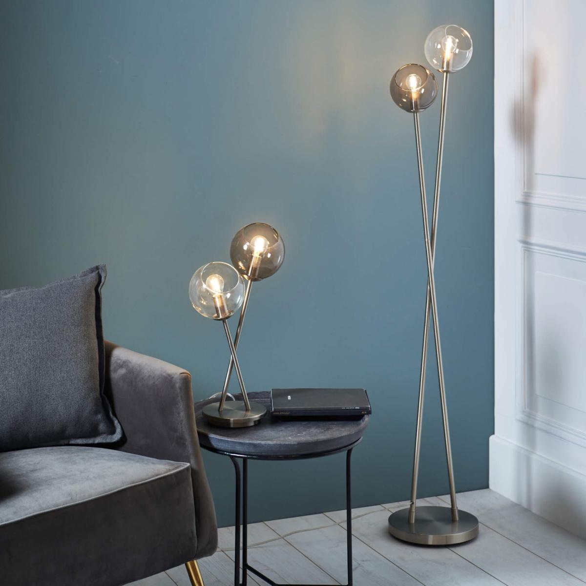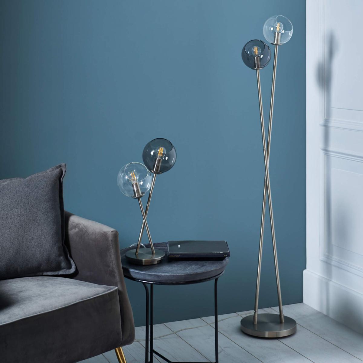 Stunningly simple but striking design contrasting a satin nickel body with smoked glass lampshades. The Branco Table Lamp can be easily placed as a finishing touch to complete a modern, classic aesthetic. Matching ceiling and floor lamp available. Stunningly simple but striking design contrasting a satin nickel body with smoked glass lampshades. The Branco Table Lamp can be easily placed as a finishing touch to complete a modern, classic aesthetic. Matching ceiling and floor lamp available.