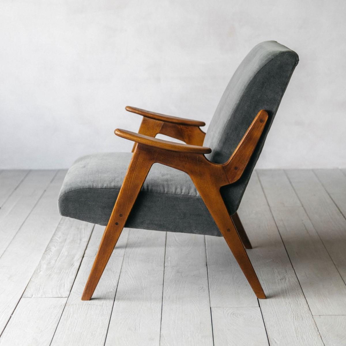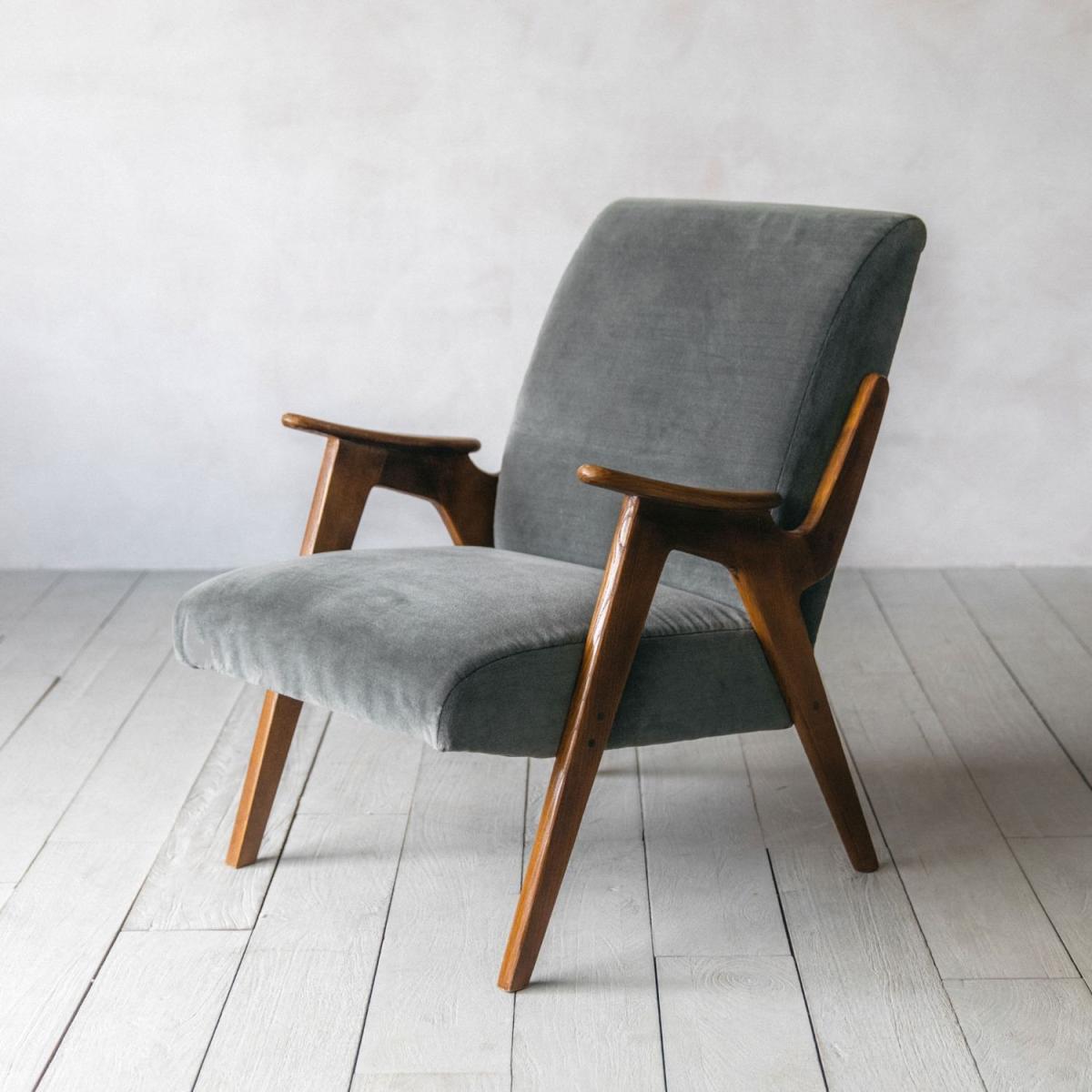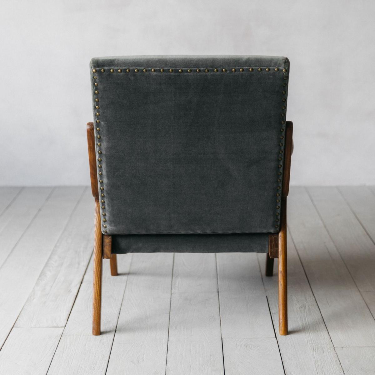 Mid-century inspired, our Brando armchair is handcrafted from solid oak wood and upholstered in sumptuous grey velvet with rivet detailing on the back.