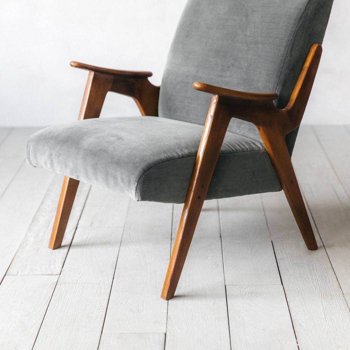 Mid-century inspired, our Brando armchair is handcrafted from solid oak wood and upholstered in sumptuous grey velvet with rivet detailing on the back.