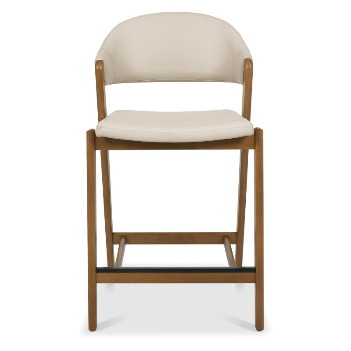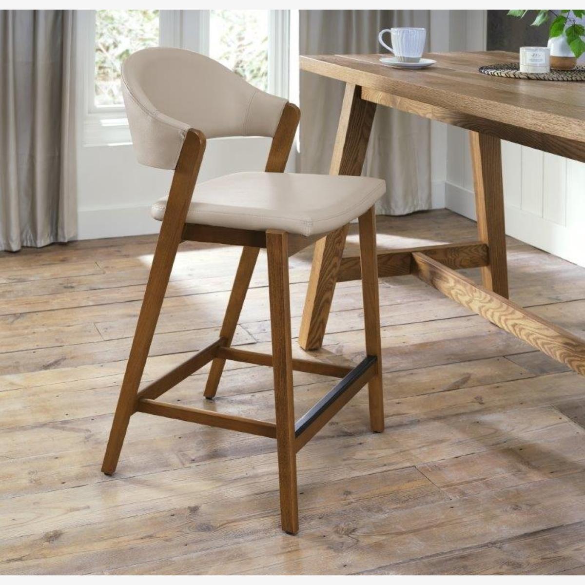 The Brandon Rustic Oak Upholstered Bar Stool offers a sophisticated blend of style and durability, featuring a rustic oak veneer frame paired with elegant Ivory Bonded Leather upholstery. The moulded ply back showcases a retro-inspired, mid-century design with a curved backrest, providing both visual appeal and enhanced comfort. Lightweight and versatile, the stool is easy to move, making it ideal for flexible seating arrangements. With its sturdy solid beech wood construction and rustic oak finish, the Brandon stool seamlessly complements a variety of interior styles. Additionally, it is available in multiple fabric colors, allowing for a customized look to suit any decor. Features: Mid-century style with a contemporary retro edge. Material - Ivory Bonded Leather Solid beech wood legs & frame with moulded plywood curved backs. Rich oiled rustic oak finish. 2 year manufacturers guarantee. Delivered assembled. Dimensions: Height: 98cm Width: 52cm Depth: 52cm Seat Height 64cm Seat Depth 48cm Please note: All screens vary in colour reproduction and whilst every effort has been made to display the colour as accurately as possible it is for guidance only.