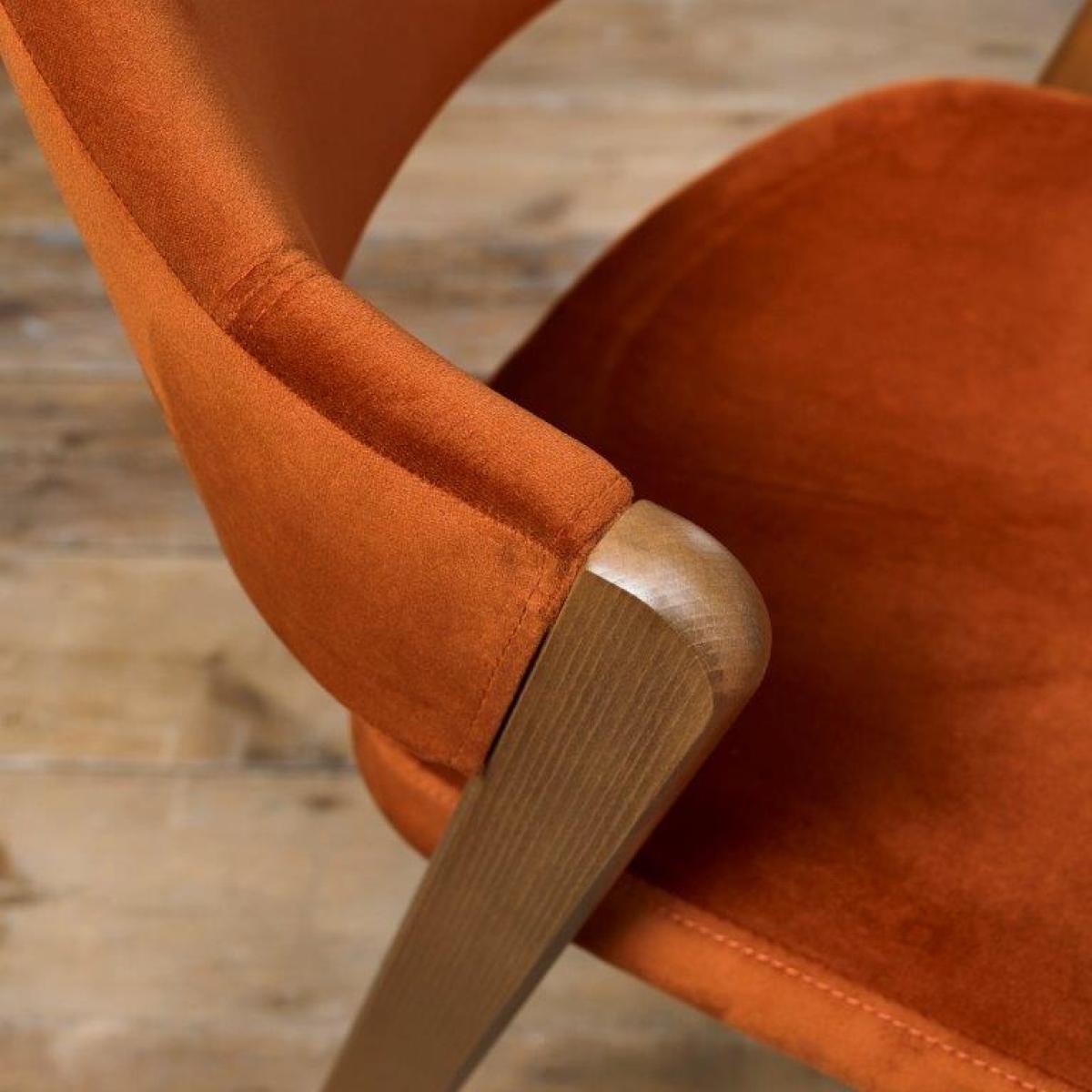 Enhance your dining experience with the brandon Rustic Oak Dining Chairs in Rust Velvet Fabric. They offer a harmonious blend of style, comfort, and enduring quality. Embrace the perfect combination of timeless elegance and mid-century charm with these exquisite chairs. Featuring a timeless design, and a curved back that gives a nod toward retro styling. The chair's backrests and seats have been expertly upholstered in luxuriously soft rust-orange velvet fabric, adding warmth and sophistication to the classic wooden frames. The rustic beech wood with a rich oiled oak finish enhances their natural beauty and durability, ensuring they will withstand the test of time. Created from moulded ply, the curved backrests offer exceptional comfort and support, allowing you to relax and indulge in long conversations over delicious meals. The absence of armrests provides a versatile seating option that allows for easy movement around the table. For those seeking additional arm support, we also offer these chairs with elegant armrests. Furthermore, a variety of fabric colours are available, allowing you to customise your dining set to match your unique style and existing decor. Features: Pair of upholstered dining chairs. Mid-century style with a contemporary retro edge. Fabric - Cedar velvet. Beech wood legs & frames with moulded plywood curved backs. Rich oiled rustic oak finish. Assembled. 2 year manufacturers guarantee. Dimensions: Height: 82cm Width: 56cm Depth: 58cm Seat Height: 49cm Seat depth 49cm Please note: All screens vary in colour reproduction and whilst every effort has been made to display the colour as accurately as possible it is for guidance only.