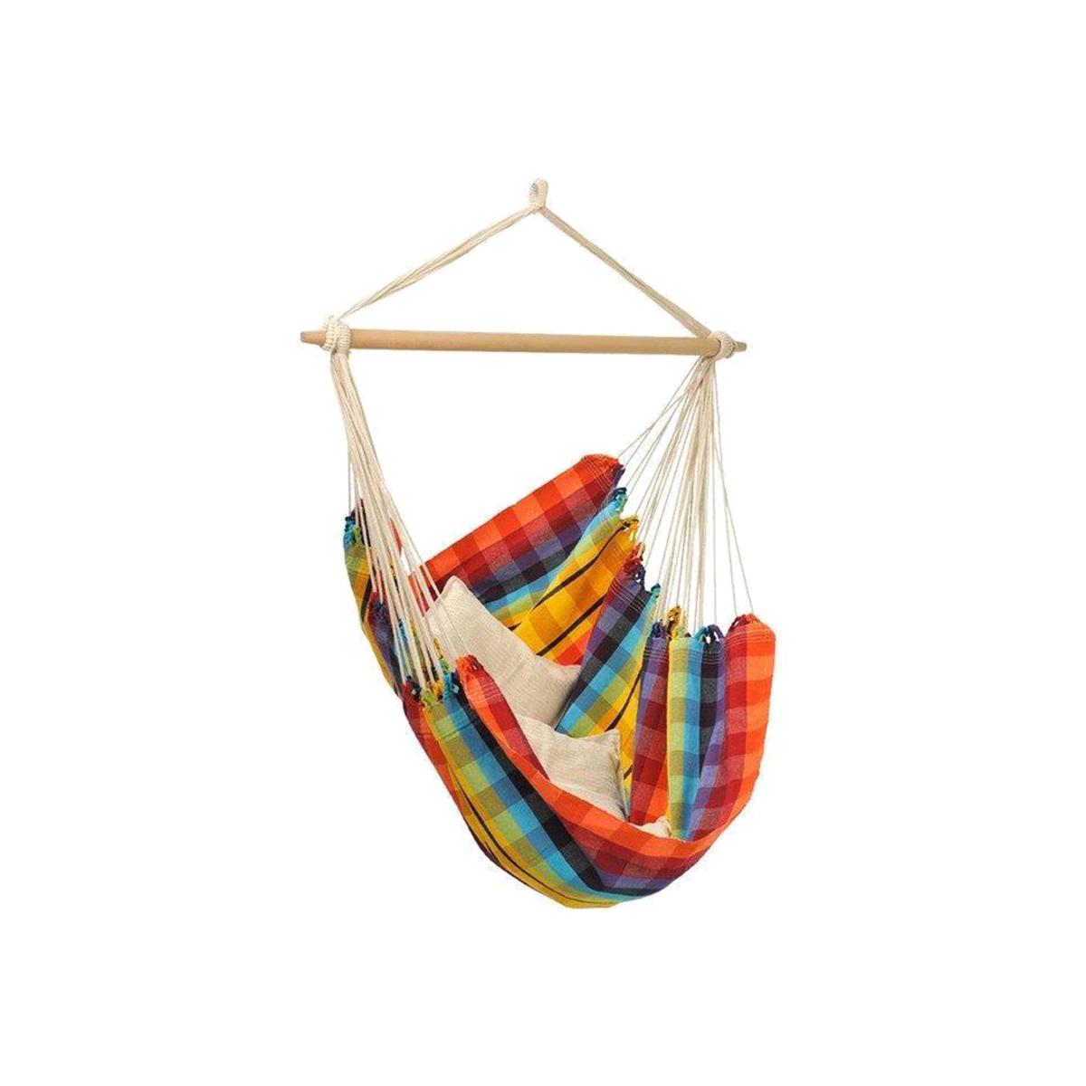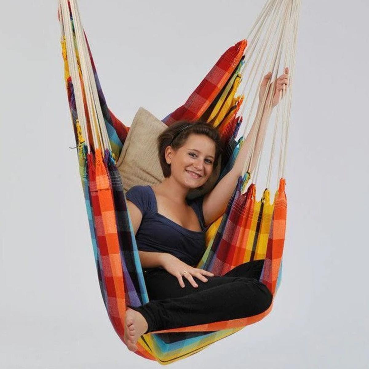 The Brazil hammock chair makes a stylish addition to any living room area. Its beige and cream stripes are neutral and fit any style. The hammock chair is also easy to take outside and relax in the sunshine! The Brasil Hammock Chair is supported by a sturdy piece of beech wood, and with extra thick woven cotton fabric, stitched at the edges. It is incredibly strong (in fact, it will hold weights of up to 150kg) and it's very comfortable.