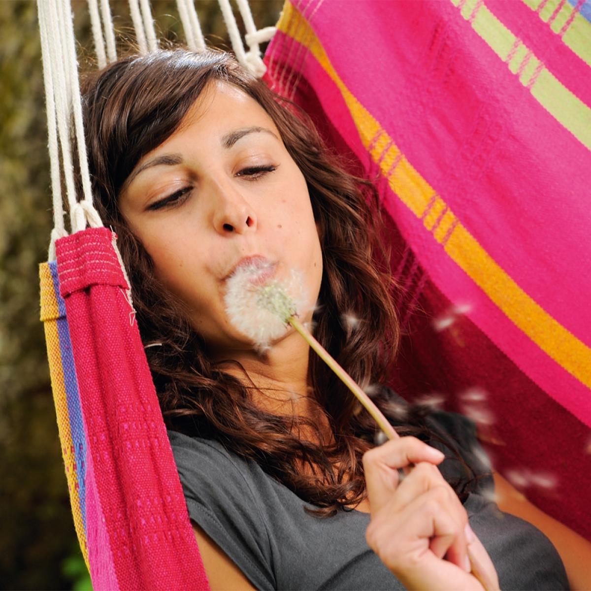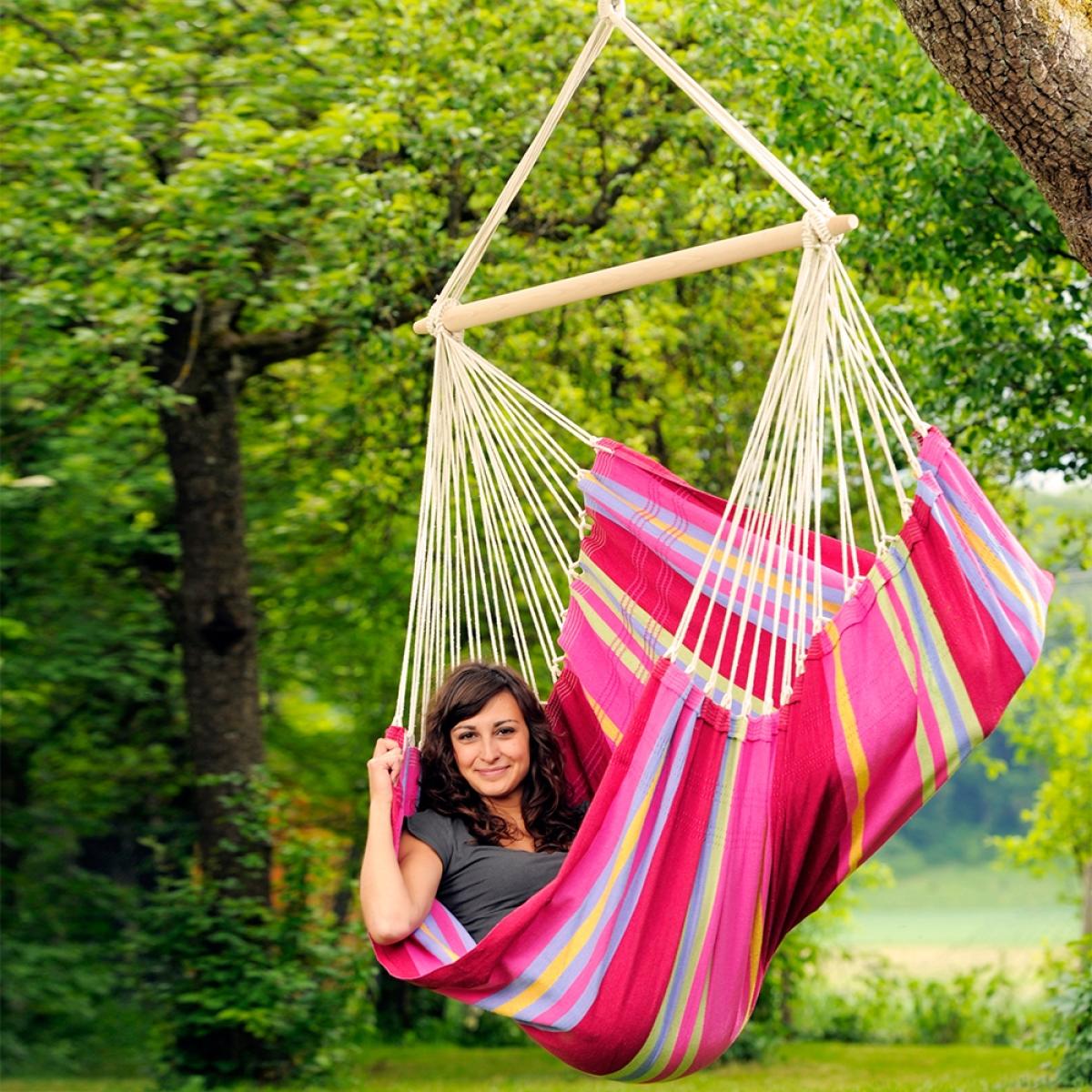 The Brasil Hanging Chair Hammock in Grenadine print is the ultimate relaxing chair. This hanging chair can be hung in the home and from a tree, so you can move it where ever you feel like relaxing. It is also King size, so you can almost stretch right out in this hammock chair! This hanging chair hammock is so wide it is almost as big as many standard hammock, you wont find a better chair to chill out in!.
