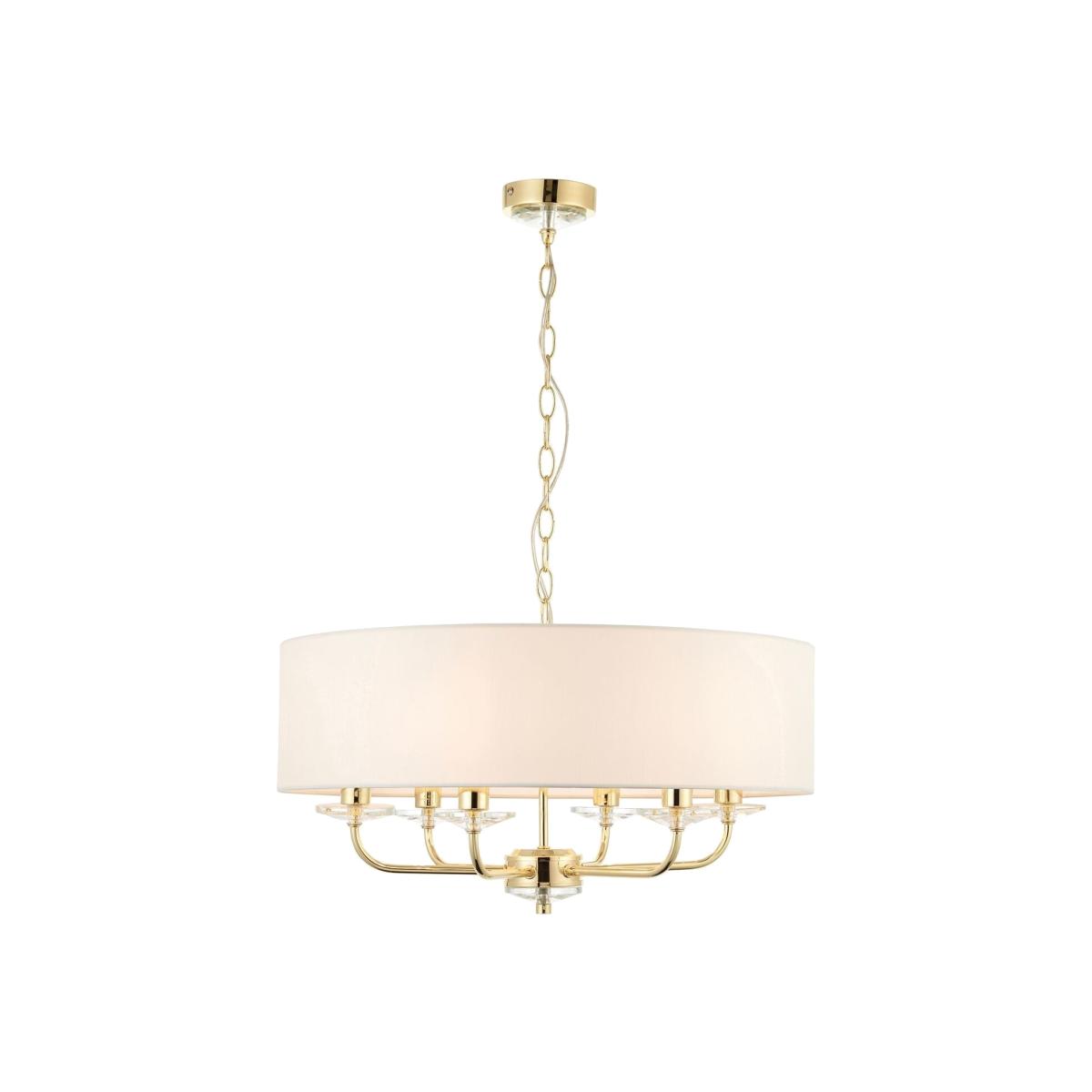 The Nixon 6-lightpendant is a touch of class with its brass finish, added crystal detailing on the arms and a vintage white faux silk shade.