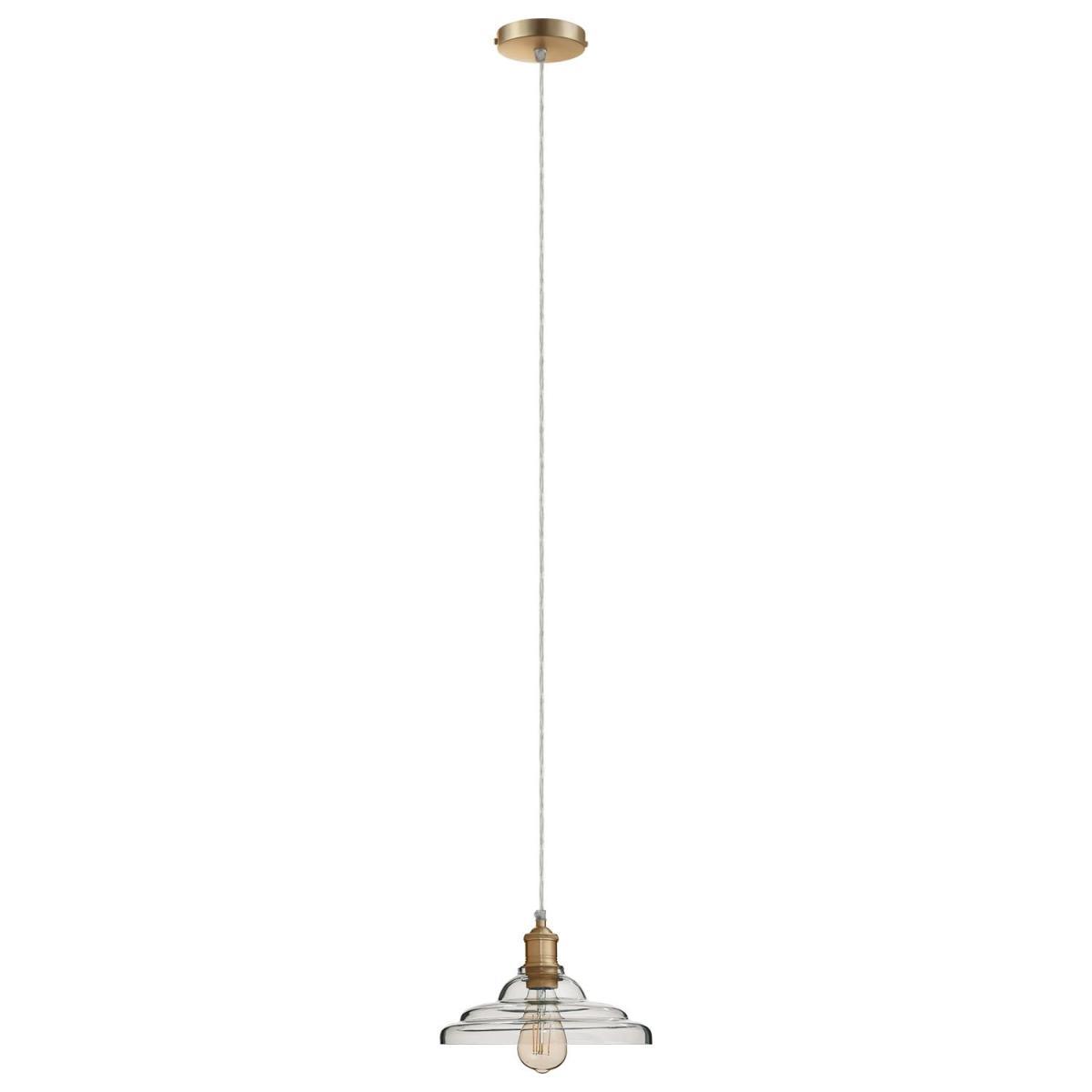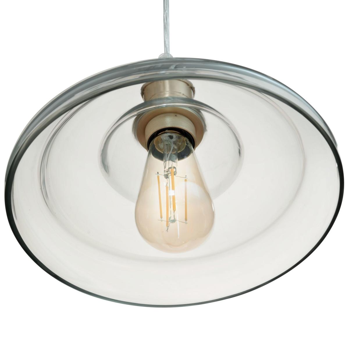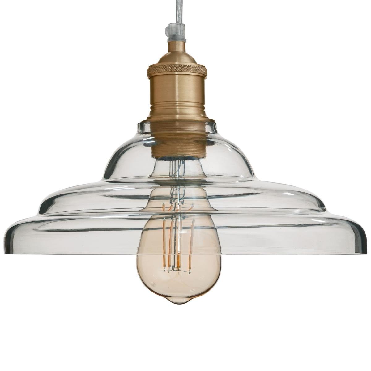 Glass cone pendant light with brass accents Minimalistic look suits any living or dining room Hang alone or in a pair above a breakfast bar E27 and LED bulb compatible, can be dimmed Need to know Overall drop: 130 cm Range: Princeton Style: Modern Fixture design: Ceiling pendant Switch type: On-Off Number of lights: 1 Bulb type: E27 Maximum wattage: 40W Colour: Clear and brass Finish: Glass, brass and braided cable Material: Glass, iron and brass LED compatible: Yes Dimmer compatible: Yes Bulb included: No Weight: 2.9kg Fixings supplied: Yes Assembly required: No Warranty: 1 year