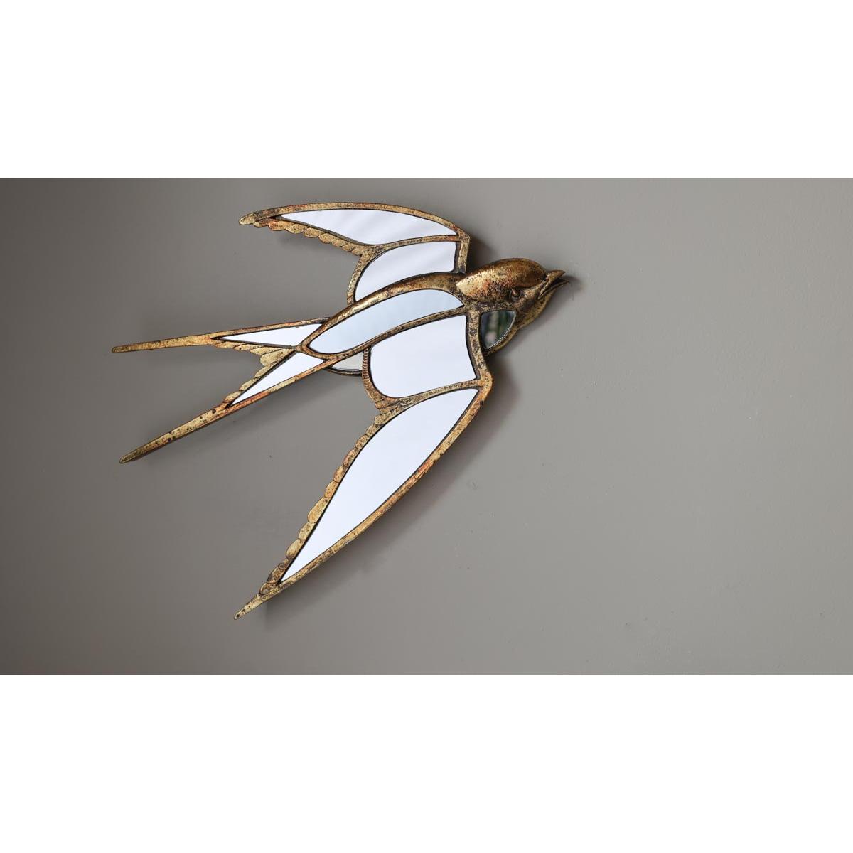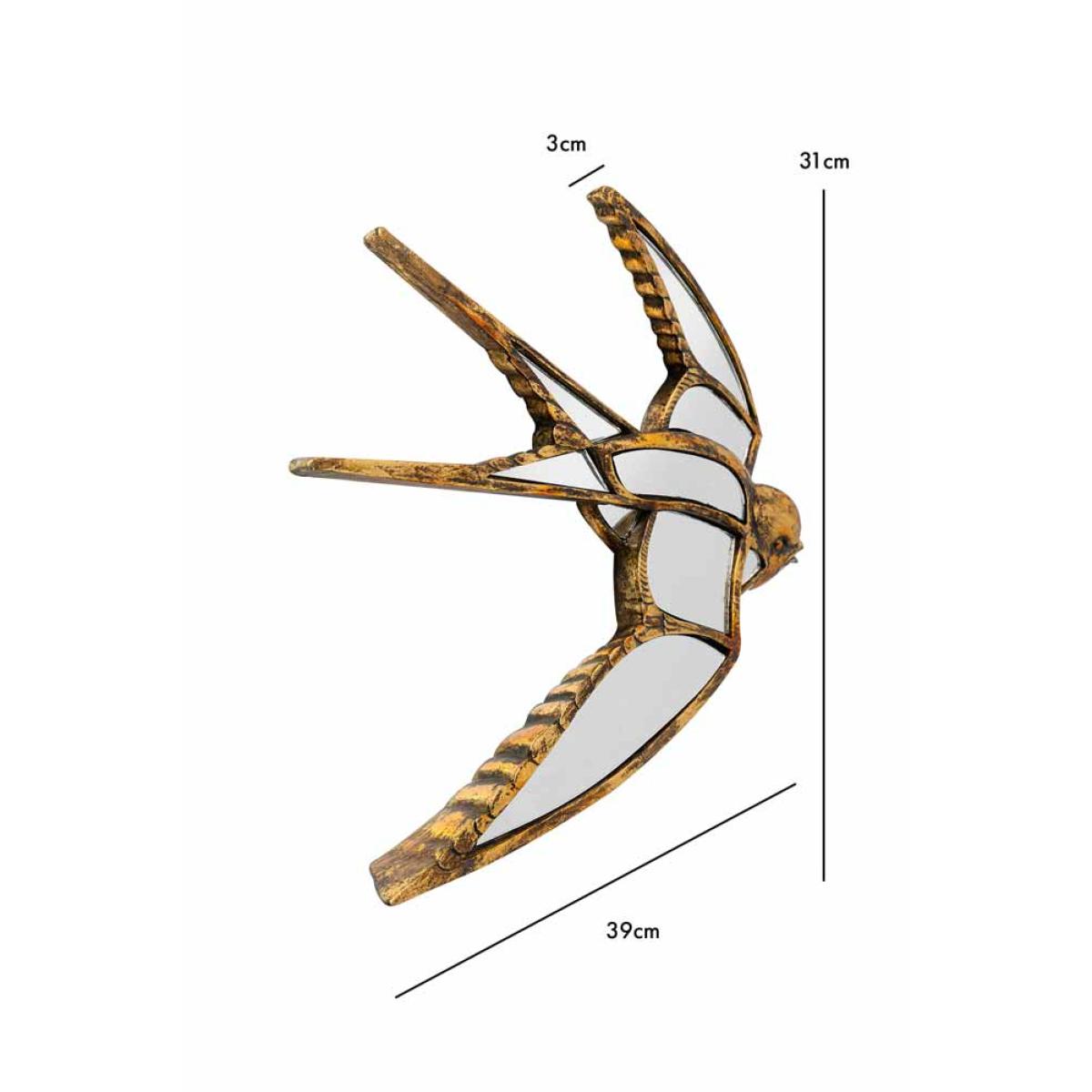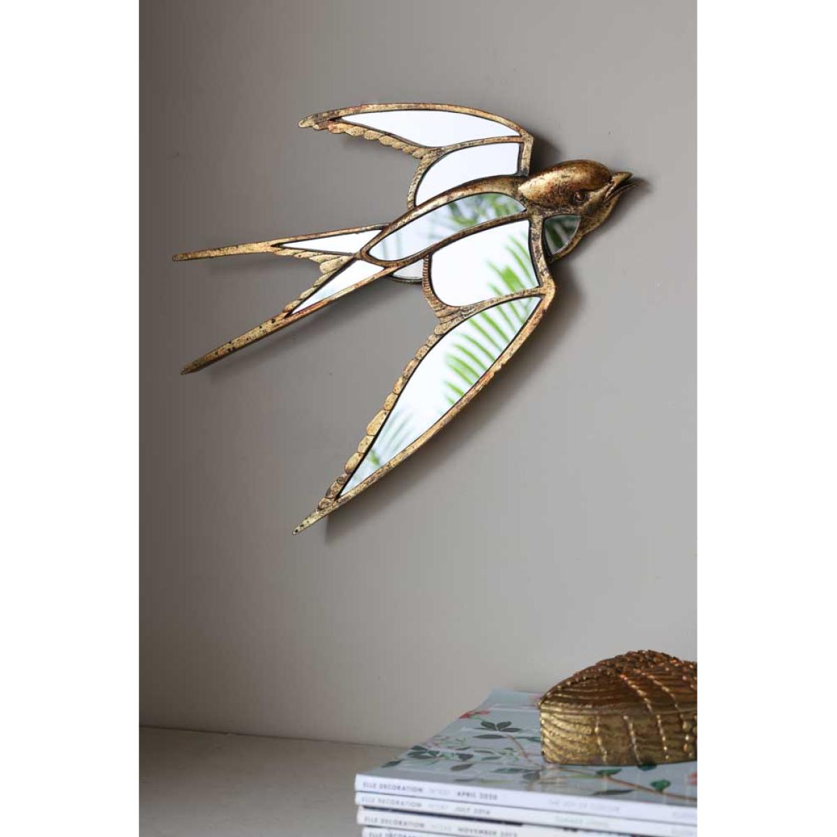 About The Brass & Mirror Swallow Wall Decoration A fabulous piece of wall art, the Brass & Mirror Swallow Wall Decoration promises to make an elegant statement on your walls. Made from polyresin with an antique brass finish, the swallow features beautiful attention to detail and is designed with mirrored panels that will catch the light. Measuring H331cm x W39cm x D3cm, this piece features fixings on the back to hang on a wall. Why We Think You’ll Love The Gold Metal Wall Art Swallow Introducing intrigue to your walls, this is unique wall art design is a great alternative to art prints when it comes to celebrating nature in your home. Designed in the shape of a swallow, the scalloped wing details and aged brass finish give this piece a vintage feel that will blend right in amongst the rest of your treasures. Plus, the mirrored panels will reflect light back into the room and create a feeling of space in even the smallest of spaces. How To Style The Brass & Mirror Swallow Wall Art The Brass & Mirror Swallow Wall Decoration looks stunning styled solo on the wall; however, we love the idea of adding this design to a wider display. So, why not try hanging this amongst a few favourite prints and pieces from your art collection for a unique take on the classic gallery wall. Or, introduce the gold metal wall art design amongst vintage style mirrors, large or small to create a gorgeous wall of glass.