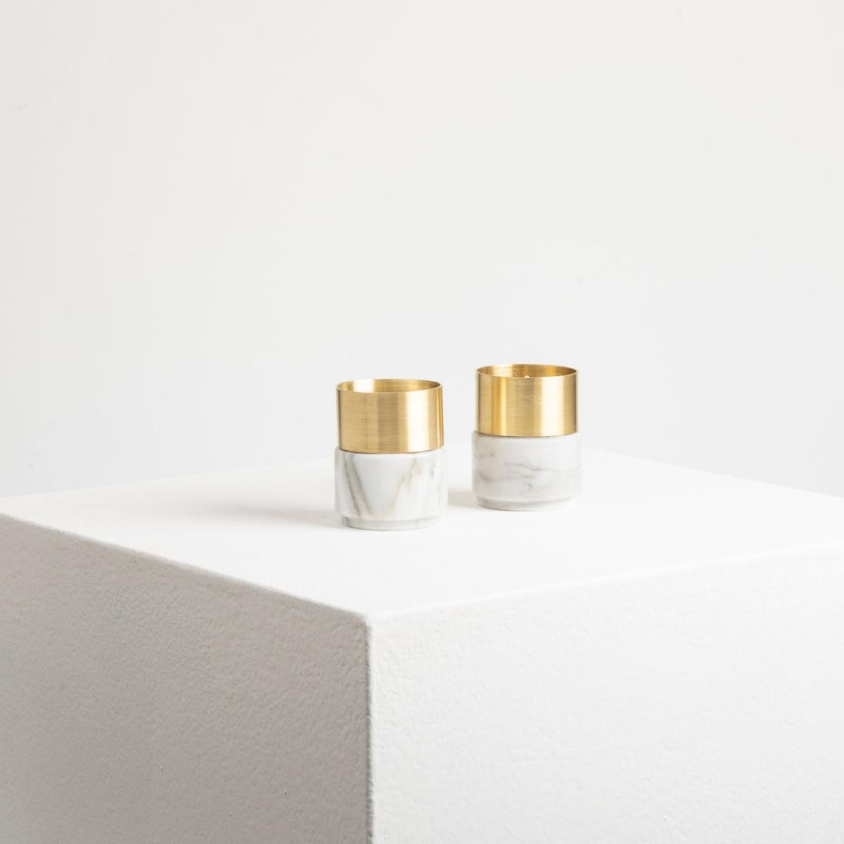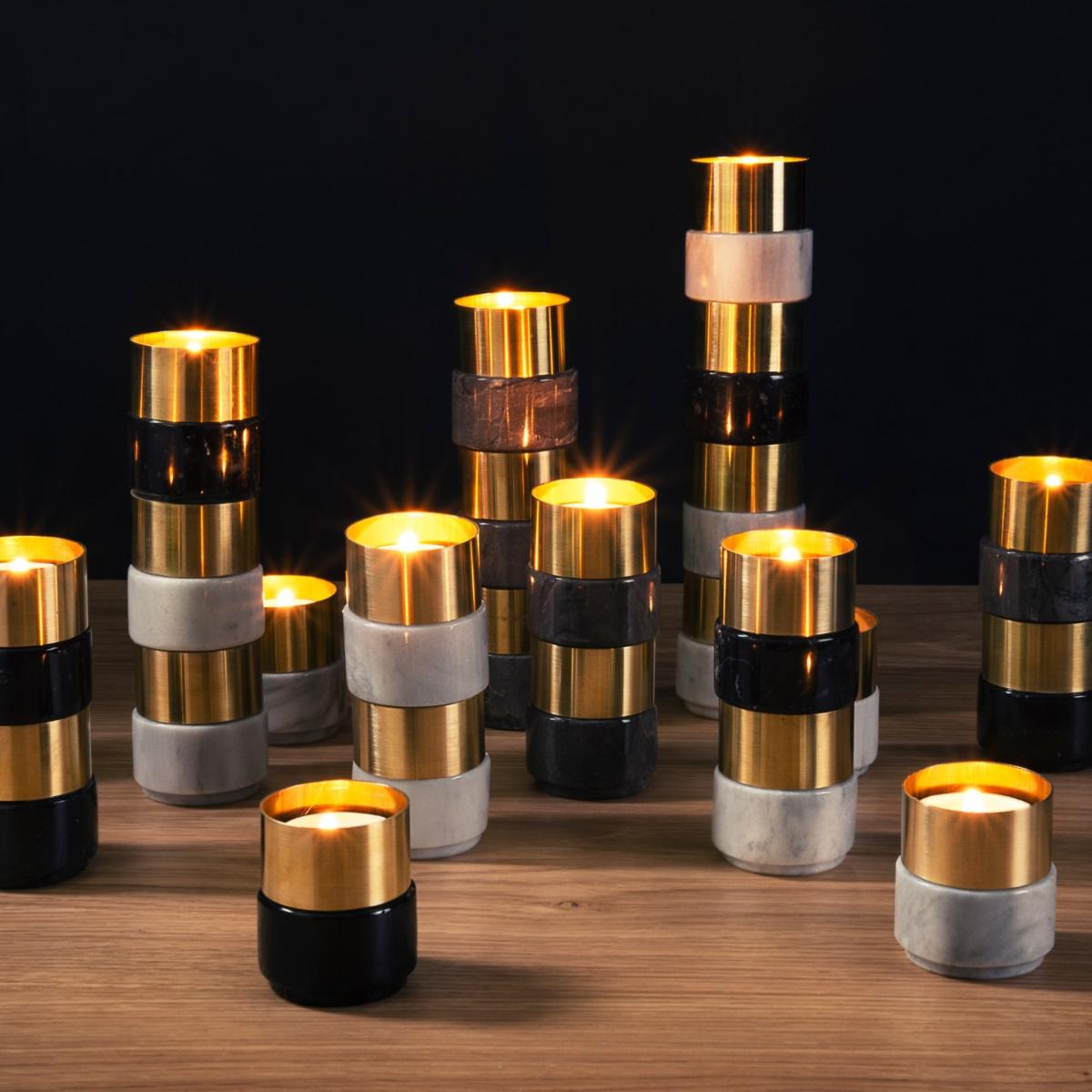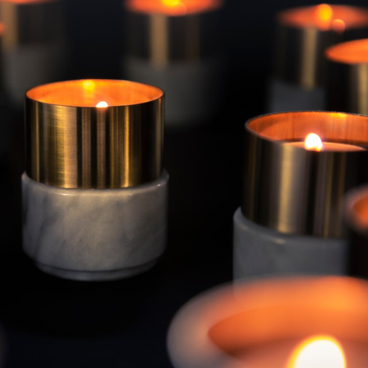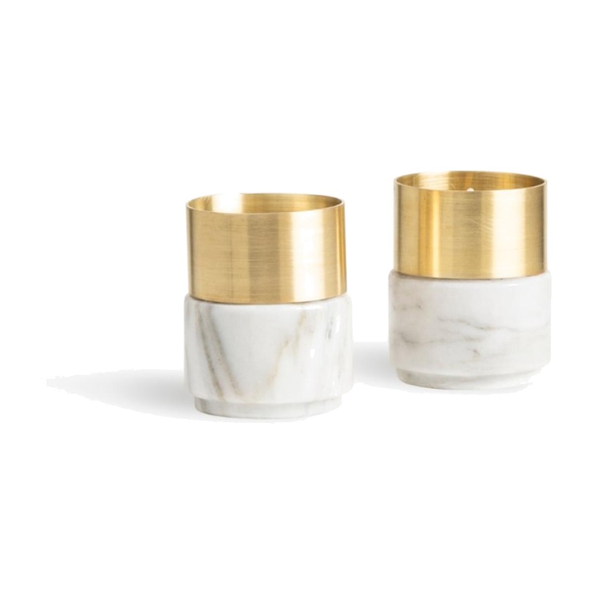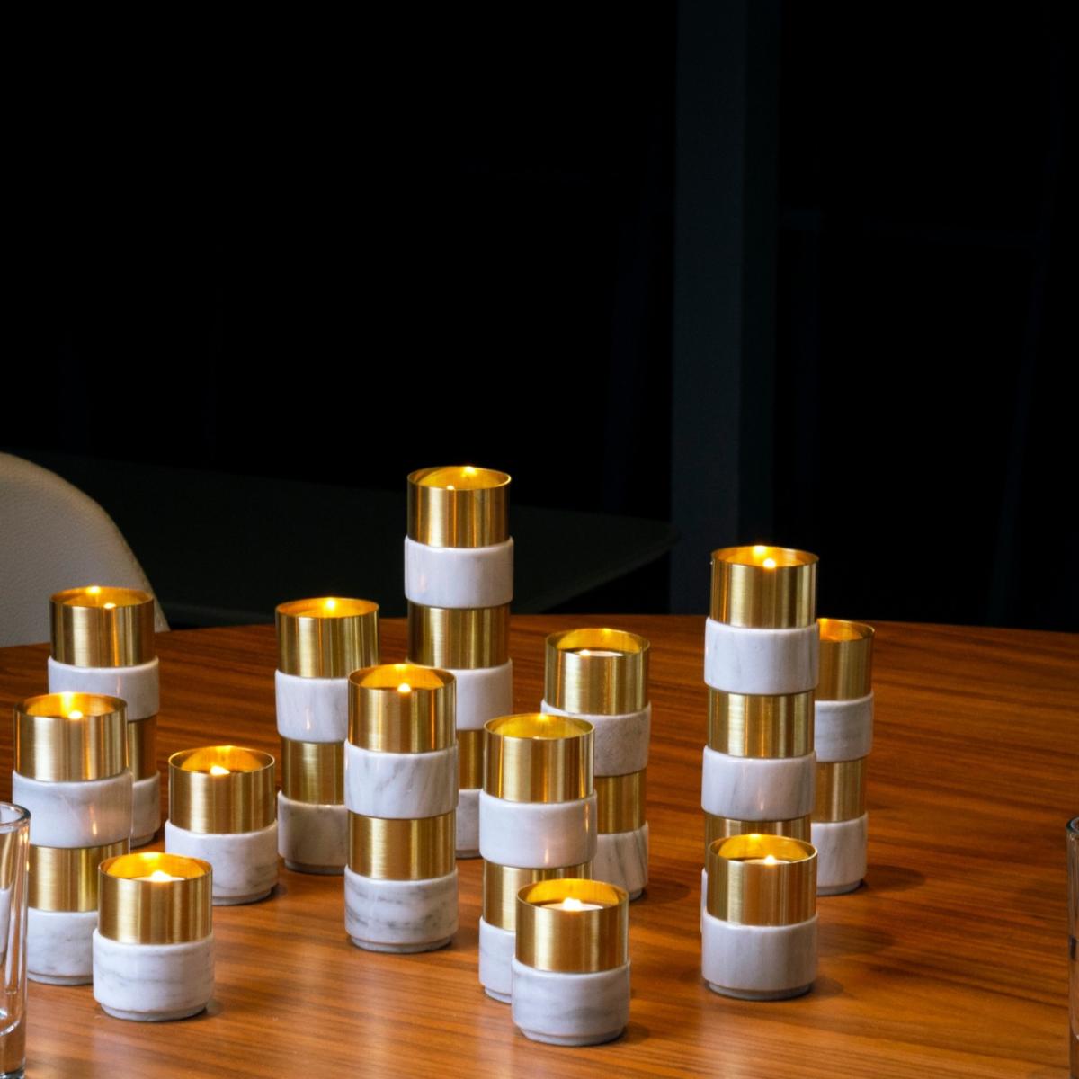 Pair of tea-light candle holder carved in solid marble and topped with a satin brass shade. Put a set on your side table to set the mood or combine a few sets to make a dramatic centrepiece.