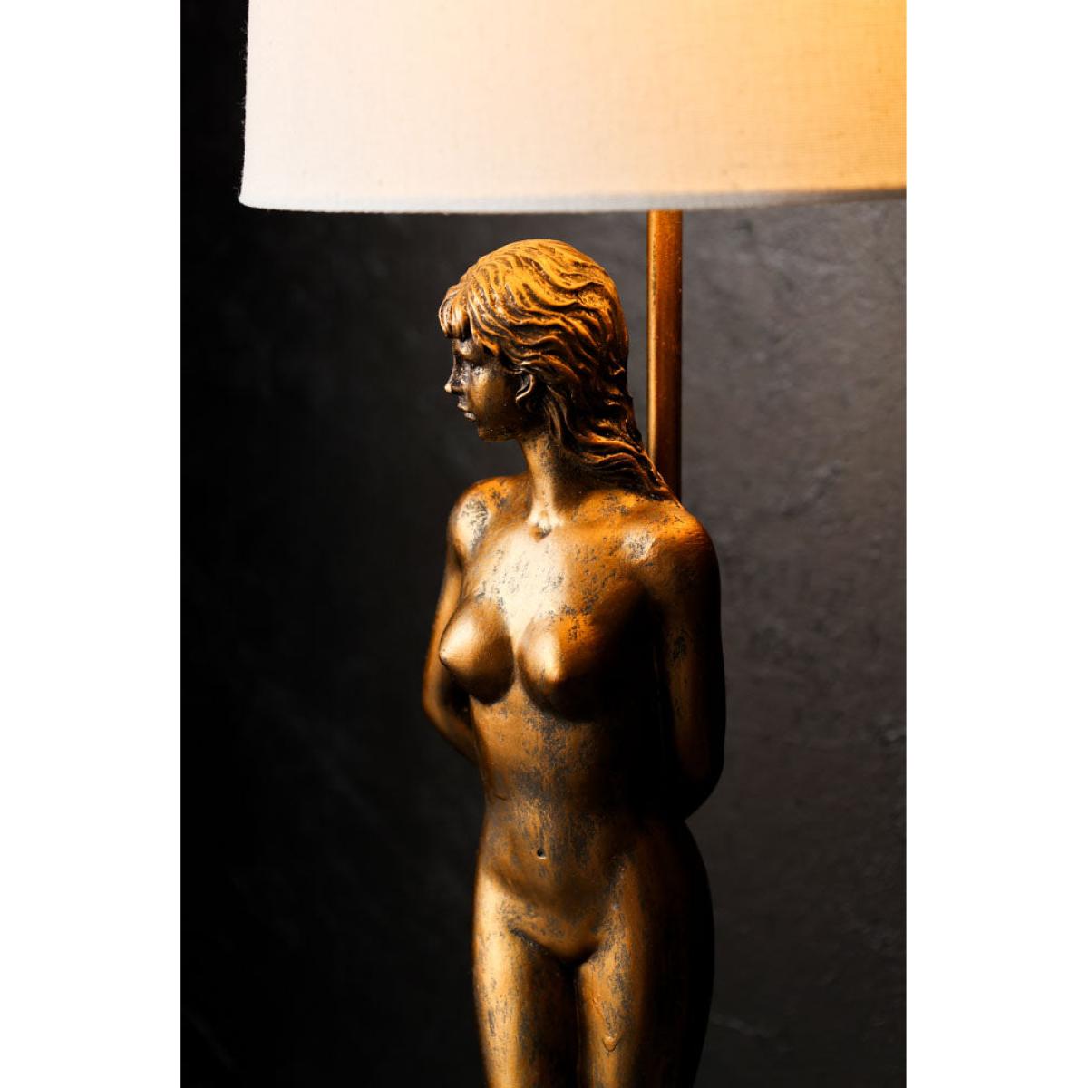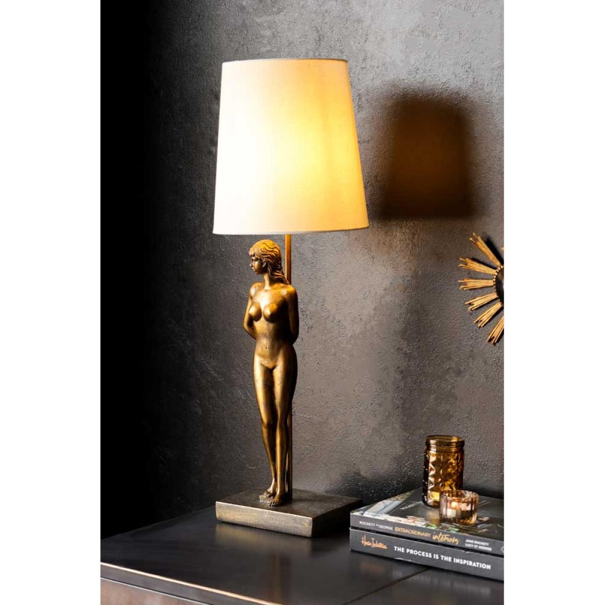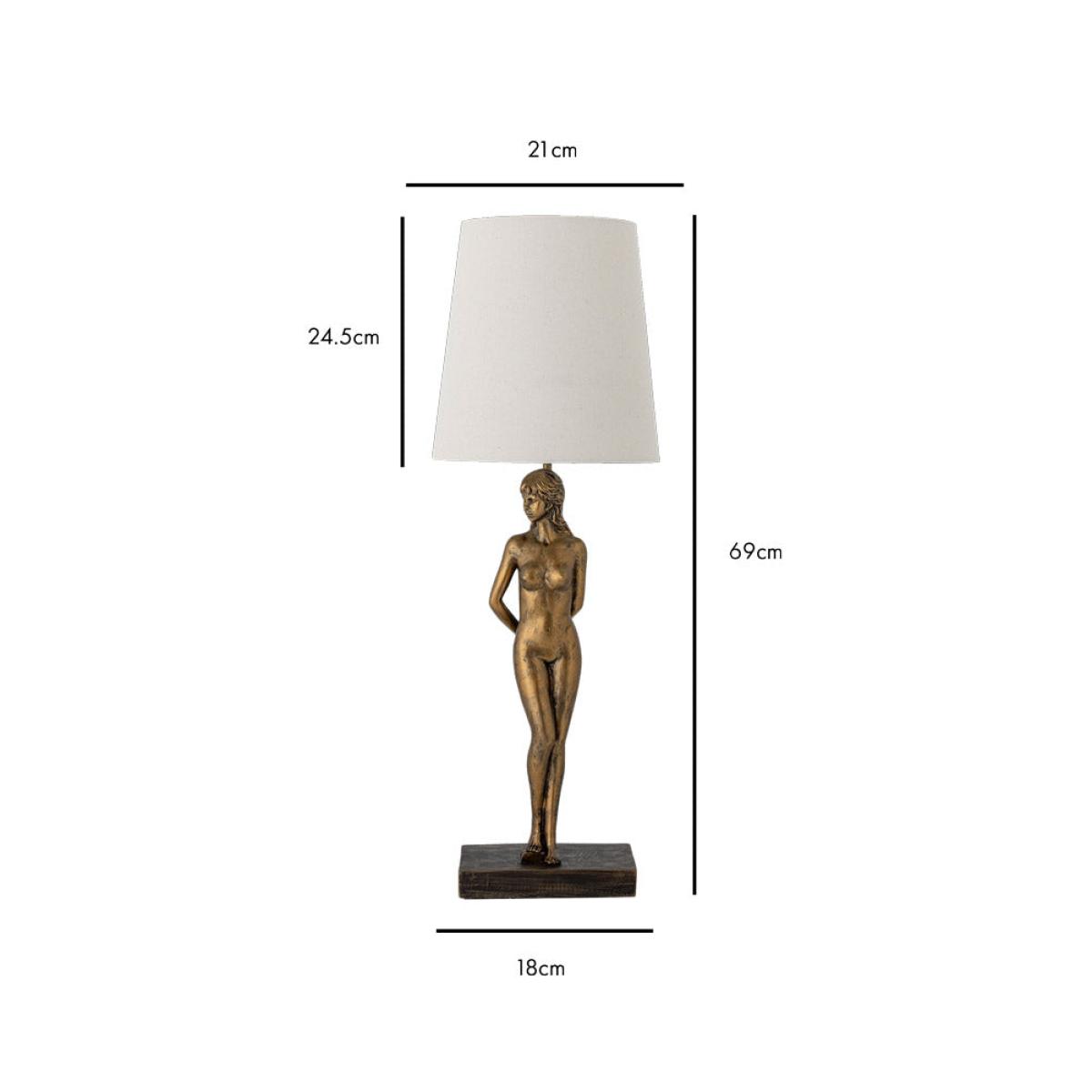 Brass female figure table lamp with an off-white linen lampshade Lamp measures: W18cm x H69cm Shade measures: W21cm x H24.5cm Requires 1 x E27 bulb – 40W incandescent/5W LED Wipe clean with a damp cloth