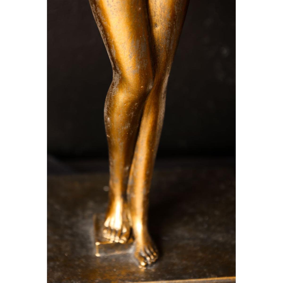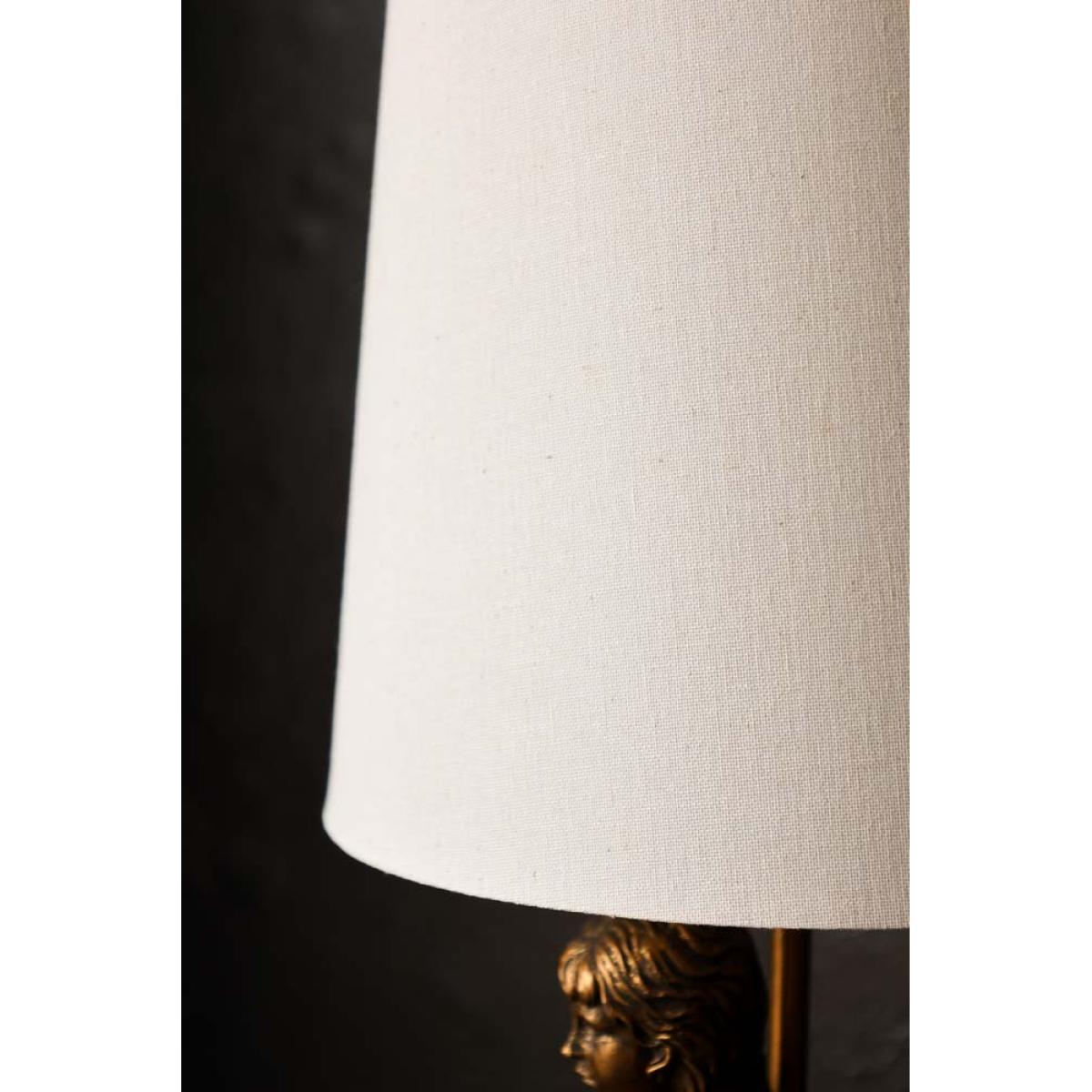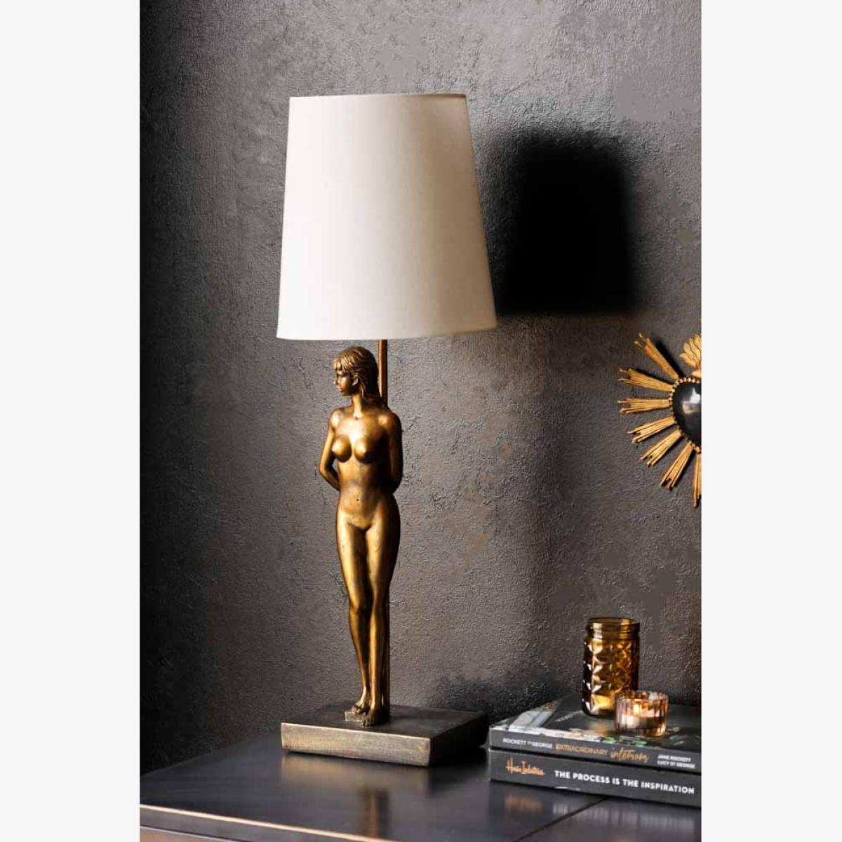 Brass female figure table lamp with an off-white linen lampshade Lamp measures: W18cm x H69cm Shade measures: W21cm x H24.5cm Requires 1 x E27 bulb – 40W incandescent/5W LED Wipe clean with a damp cloth