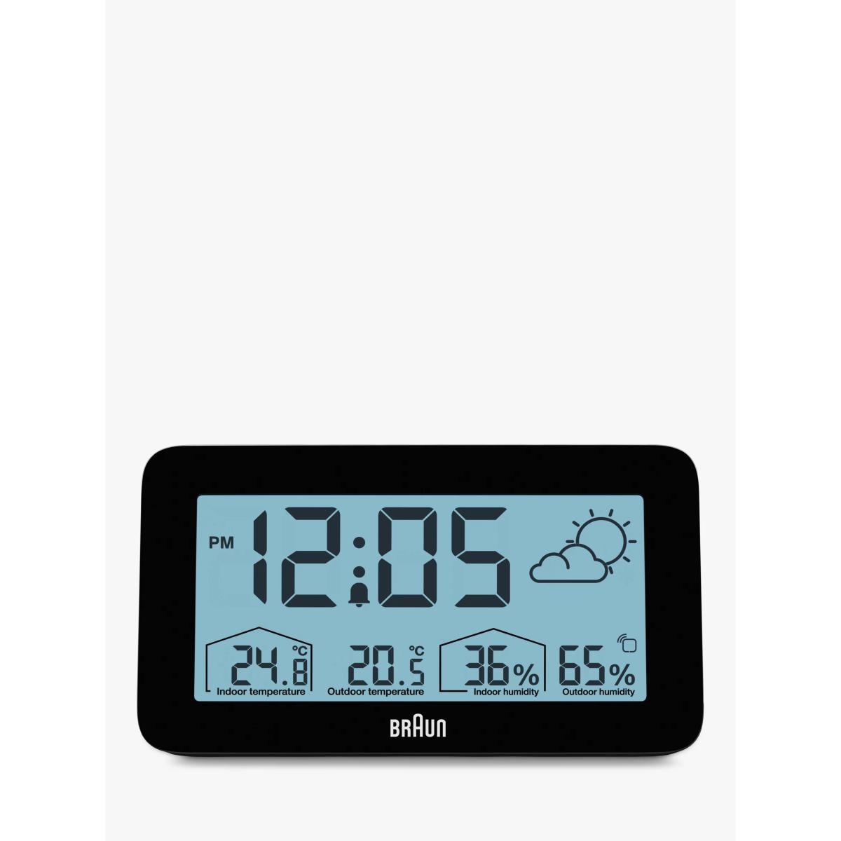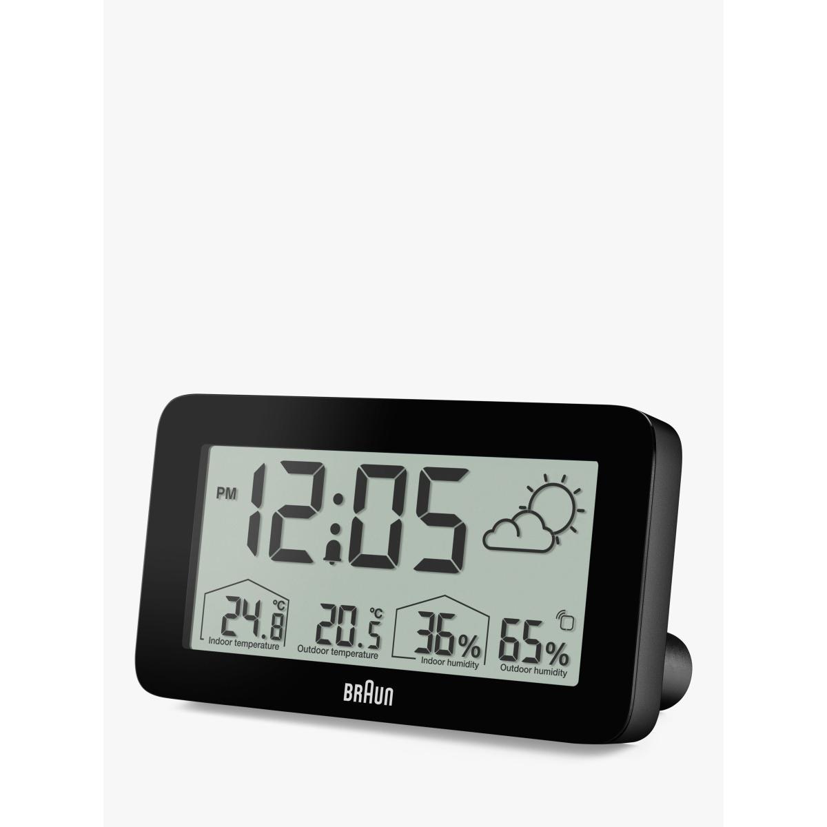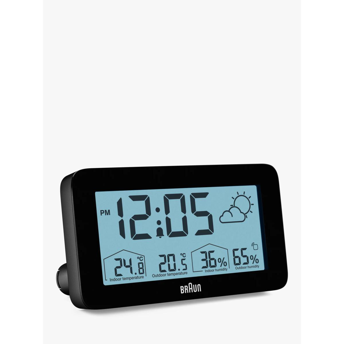 A lightweight and compact Braun alarm clock for a bedside table or home office desk. This design has an easy-to-read LCD digital display with a backlight function that illuminates the display when in a low-light environment, making it easier to see at night. This weather station clock can be set to either 12 or 24-hour mode and displays the time and alarm. The crescendo beep alarm has a snooze function with five-minute intervals. The clock comes with an outdoor sensor unit and the customisable interface can display indoor and outdoor temperature (°C or °F) and indoor and outdoor humidity. The outdoor sensor also features a temperature display.
