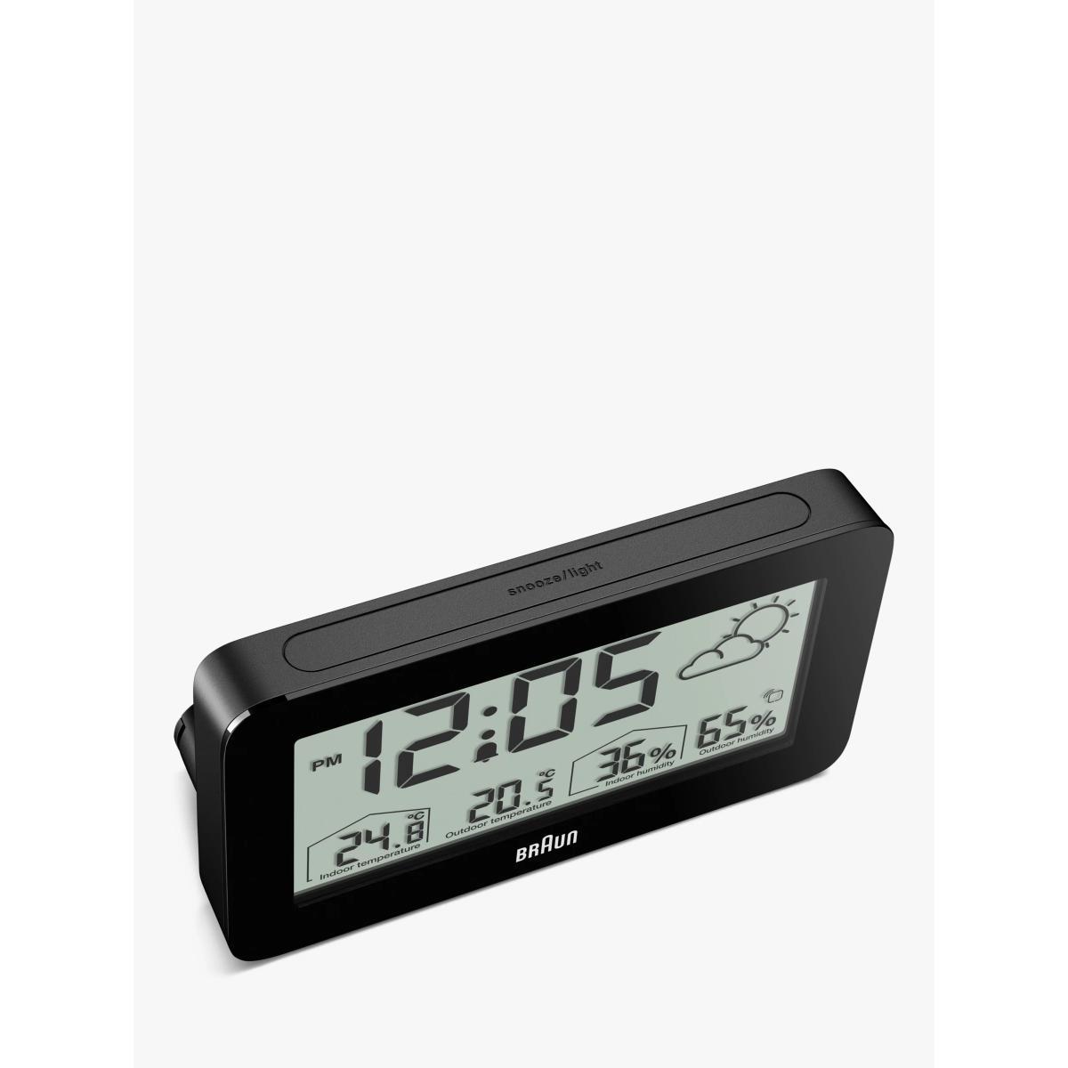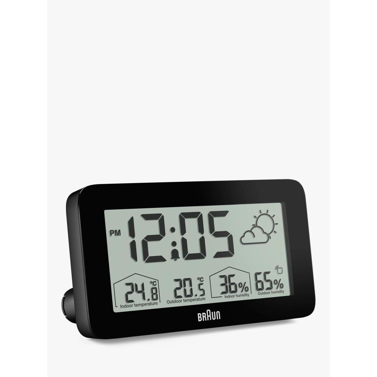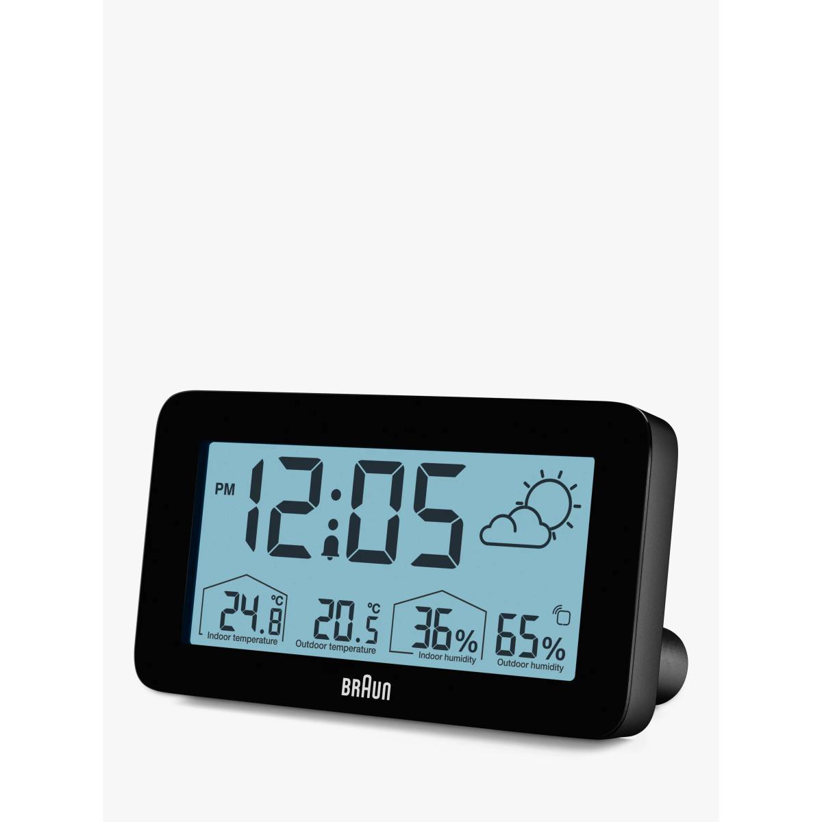A lightweight and compact Braun alarm clock for a bedside table or home office desk. This design has an easy-to-read LCD digital display with a backlight function that illuminates the display when in a low-light environment, making it easier to see at night. This weather station clock can be set to either 12 or 24-hour mode and displays the time and alarm. The crescendo beep alarm has a snooze function with five-minute intervals. The clock comes with an outdoor sensor unit and the customisable interface can display indoor and outdoor temperature (°C or °F) and indoor and outdoor humidity. The outdoor sensor also features a temperature display.