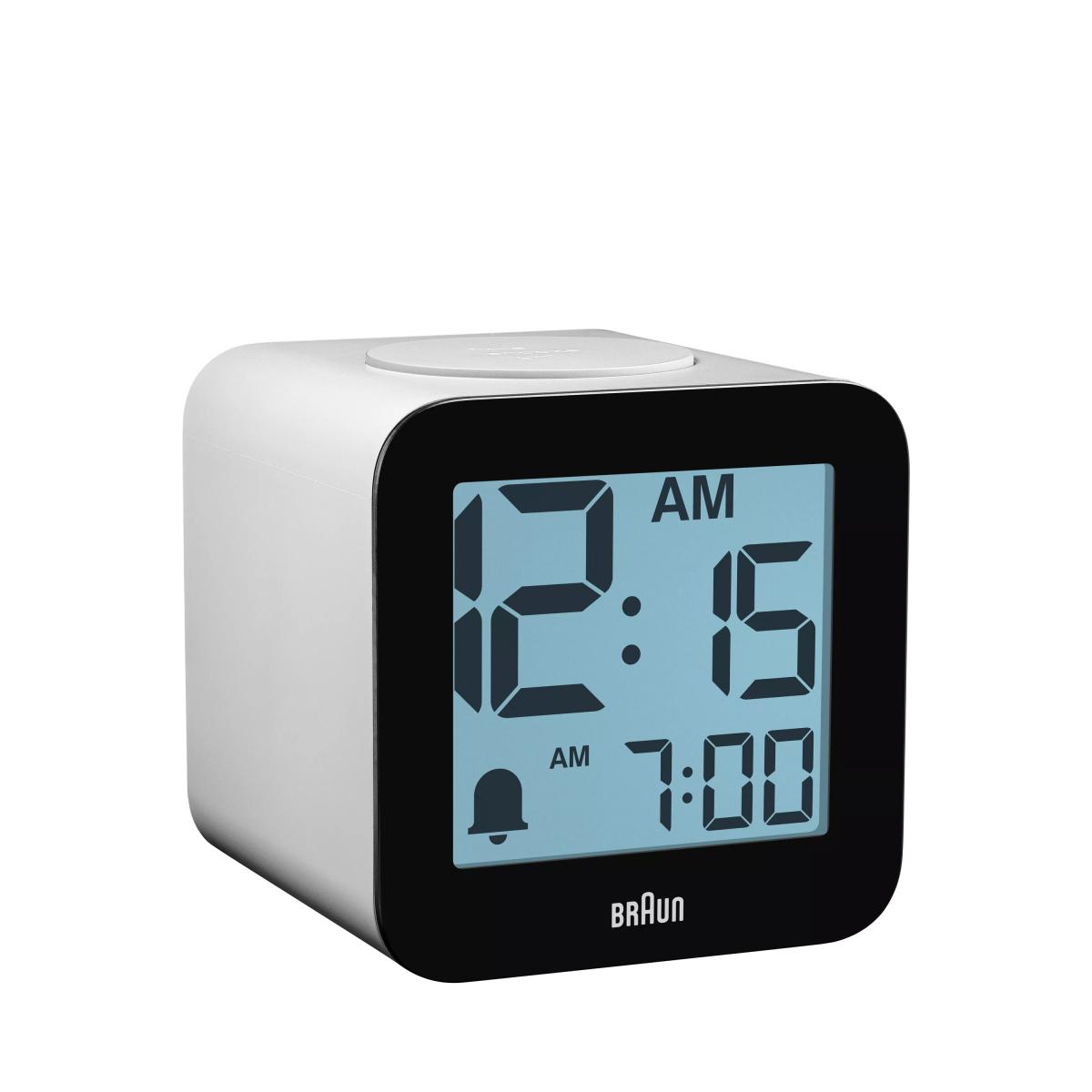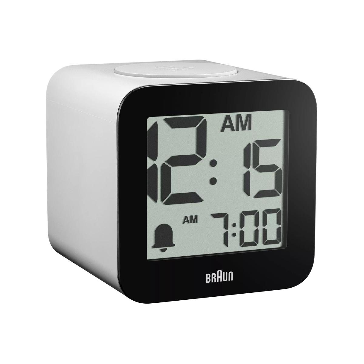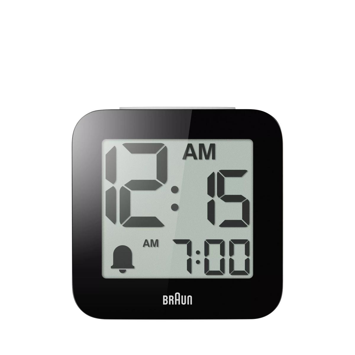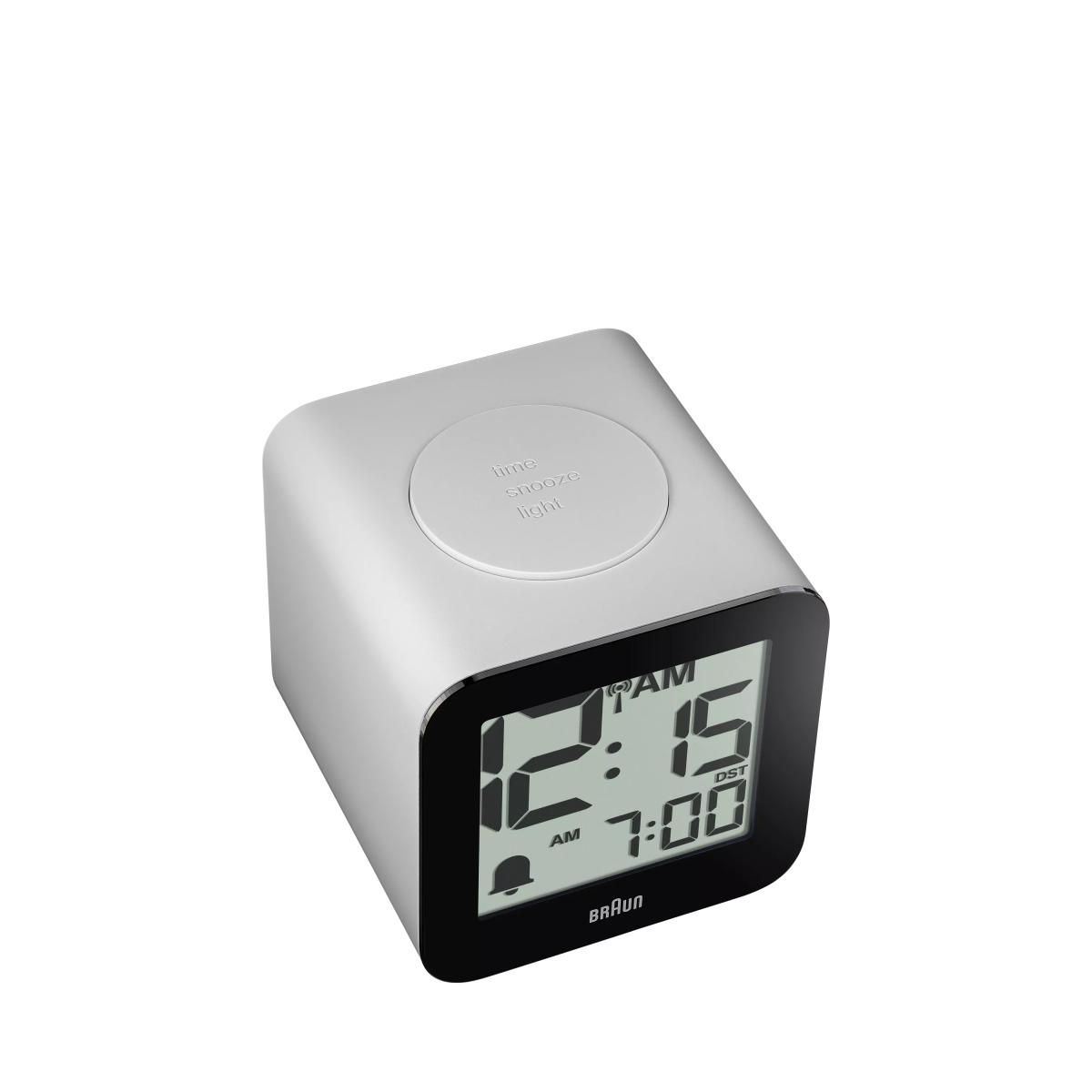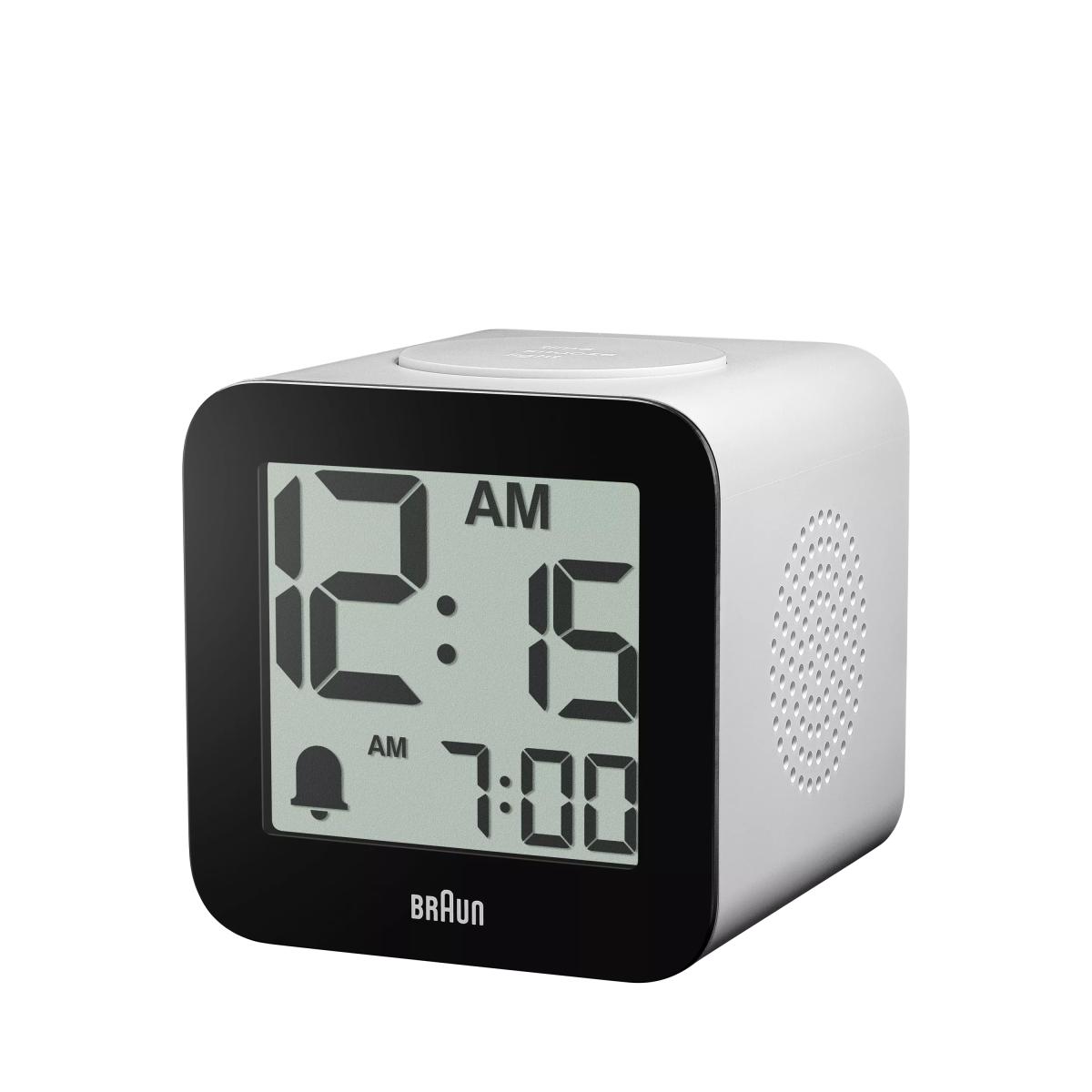 This Braun digital alarm clock speaks the time and features a positive LCD display with easy-to-read large digits. Key features: Speaking clock — Spoken time announcements at the press of a button and automatically at the beginning of every hour. Easy setting with spoken feedback. Automatic announcements can be disabled Languages — English, German Crescendo beep alarm — The beep alarm gets more frequent and louder if you do not turn it off Snooze/backlight function — Snooze interval is 5 minutes. Light illuminates for 10 seconds once manually activated Positive LCD display with 12-hour display — the digital display may vary in contrast depending on room lighting Battery efficiency — For optimal performance in timekeeping, backlight and alarm functions, use only new alkaline batteries